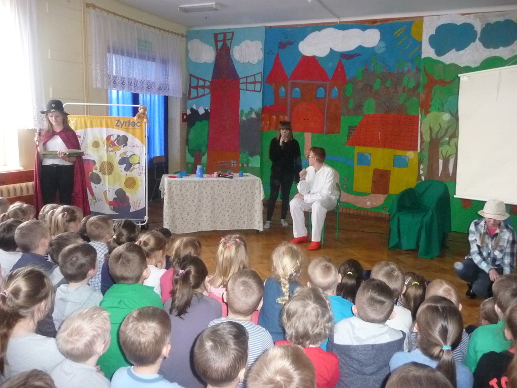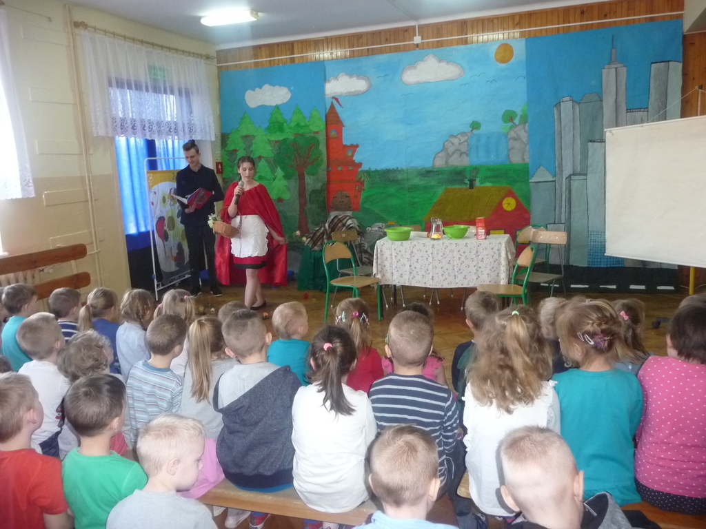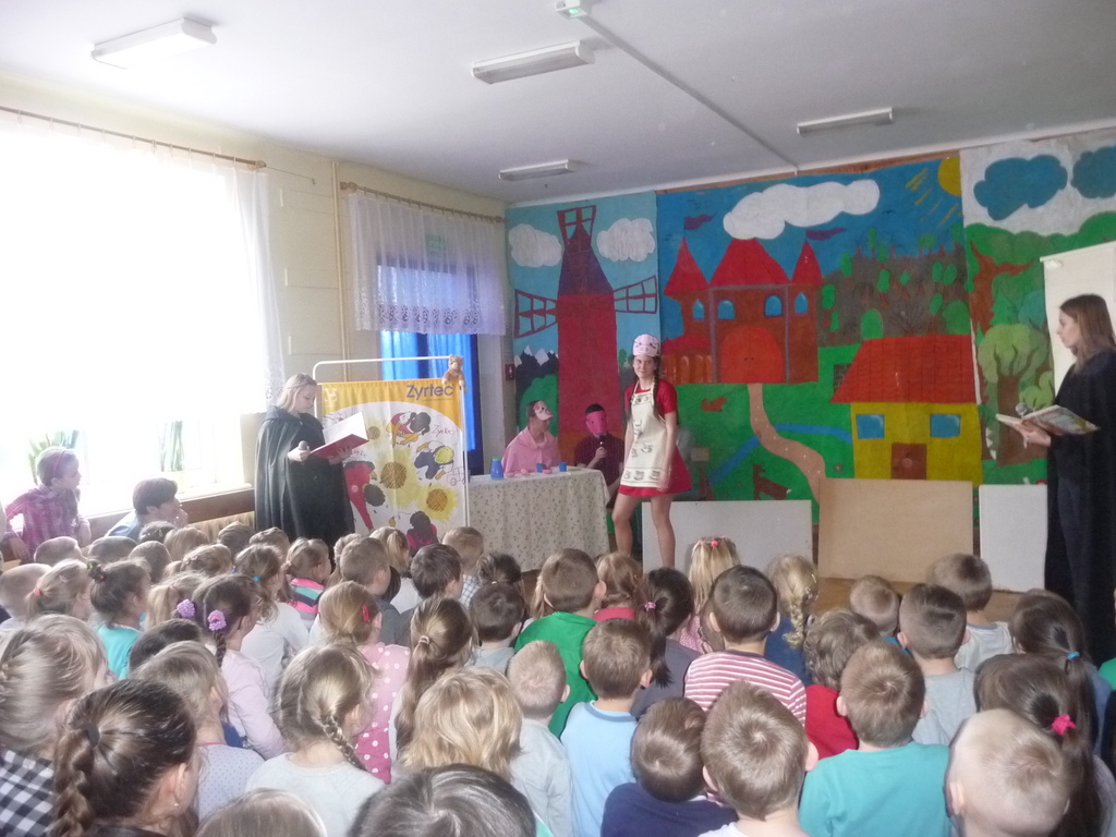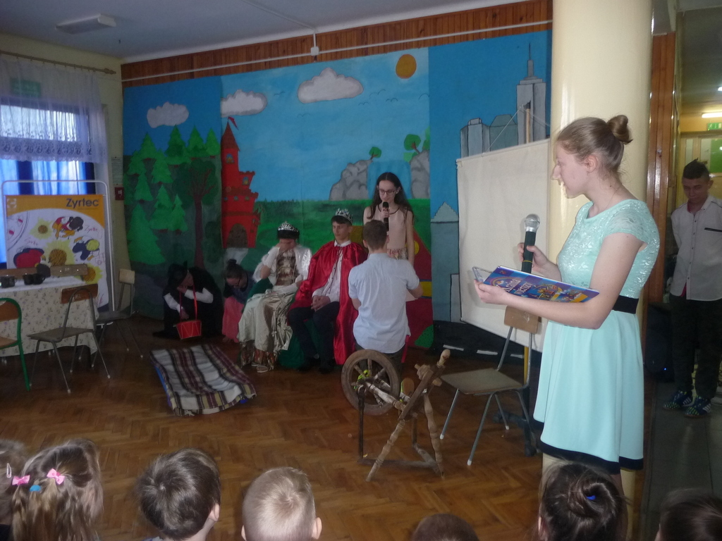 Na kilka godzin hol szkoły podstawowej zamienił się w świat baśni. Królowały bajkowe postacie, wśród nich: Czerwony Kapturek, królewna, świnki, Kot w butach, myśliwi czy młynarczyk. Zachwyt oglądających wzbudziły kreacje bohaterów bajek oraz barwne dekoracje.