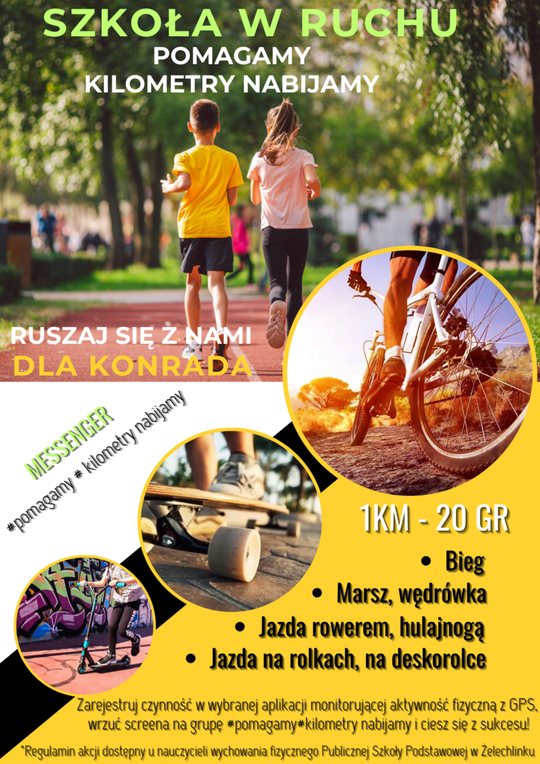 W ramach projektu SZKOŁA W RUCHU zachęcamy do wzięcia udziału w akcji sportowo-charytatywnej "Pomagamy-kilometry nabijamy" zainicjowanej w naszej szkole. Akcja polega na przebyciu przez uczestników jak największej ilości kilometrów, z wykorzystaniem aplikacji monitorującej aktywność fizyczną. Przy wsparciu lokalnych przedsiębiorców i ludzi dobrej woli dystans liczony w kilometrach zostanie zamieniony na wartość pieniężną, a zgromadzone środki zostaną przekazane absolwentowi naszej szkoły - Konradowi, na jego leczenie i protezę nogi utraconej w wyniku ciężkiej choroby.