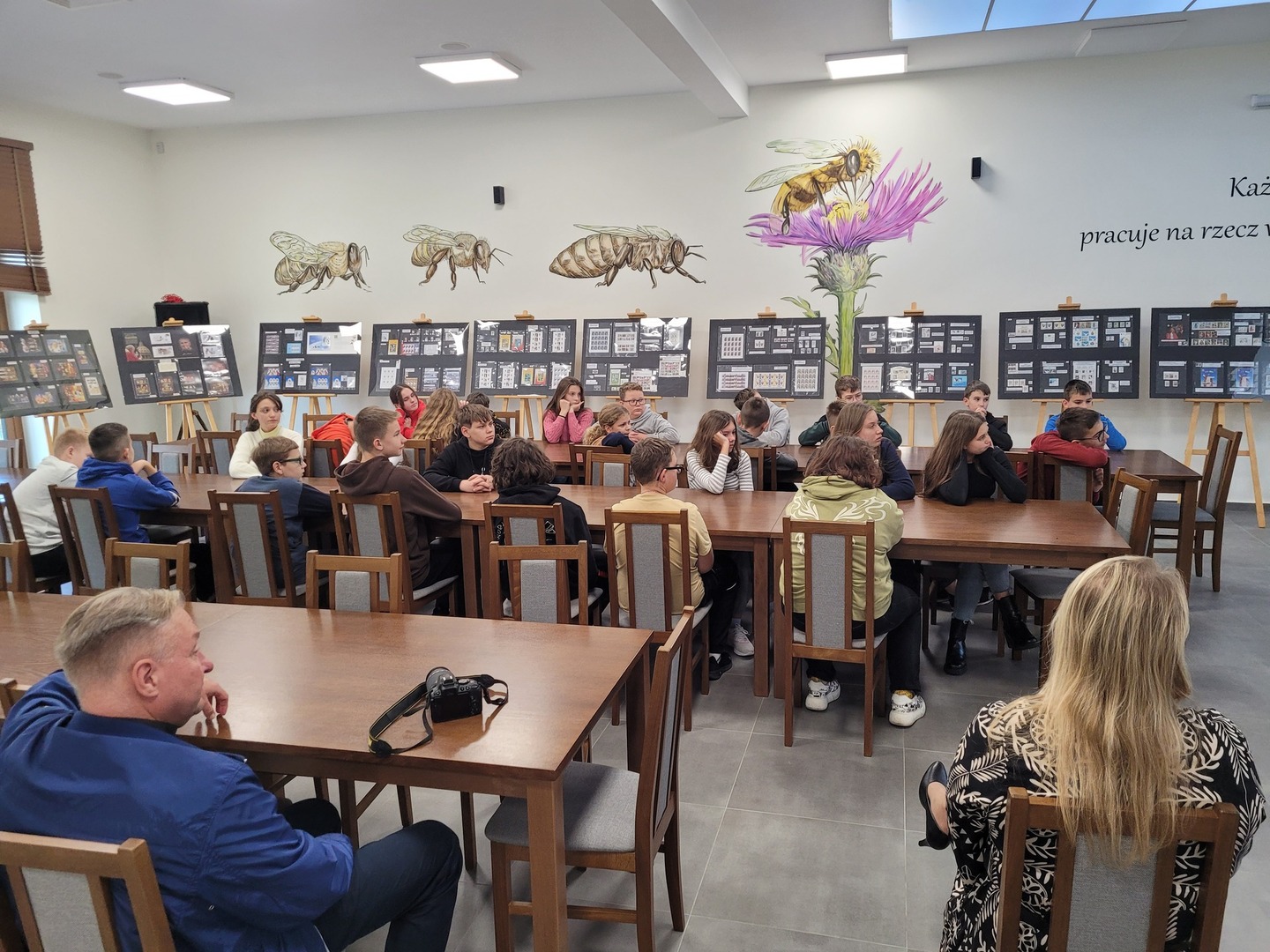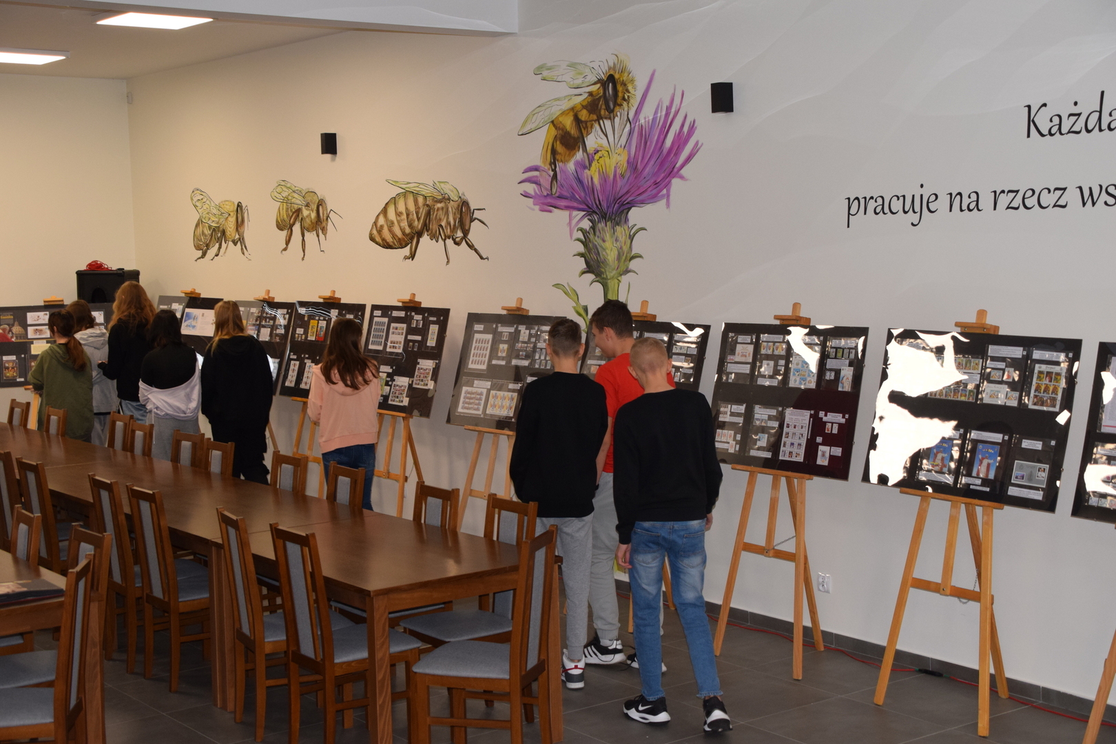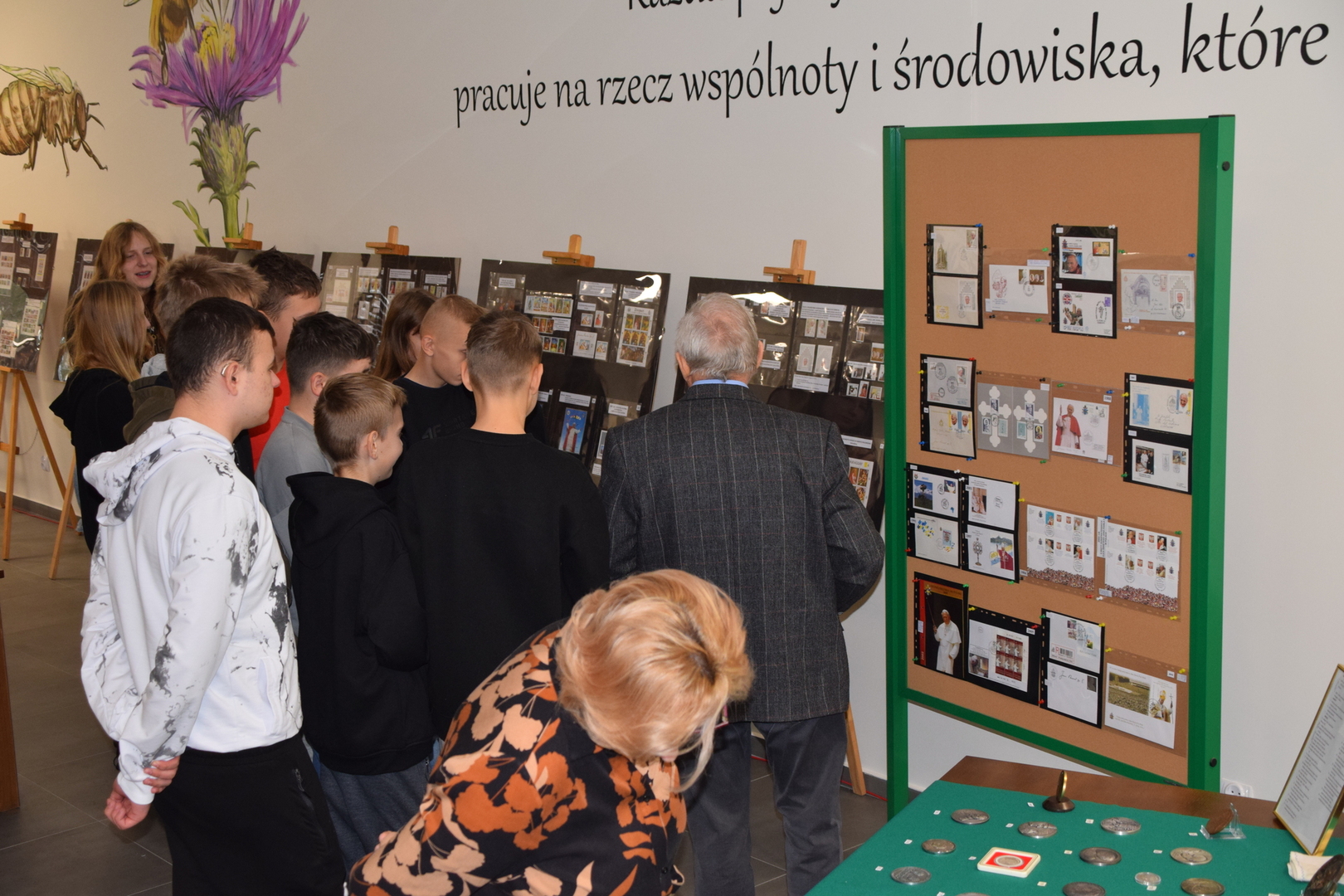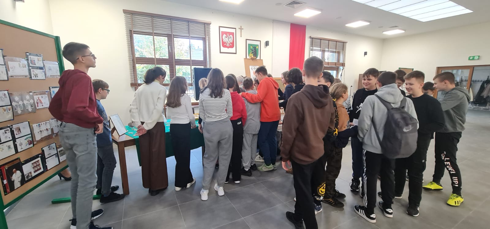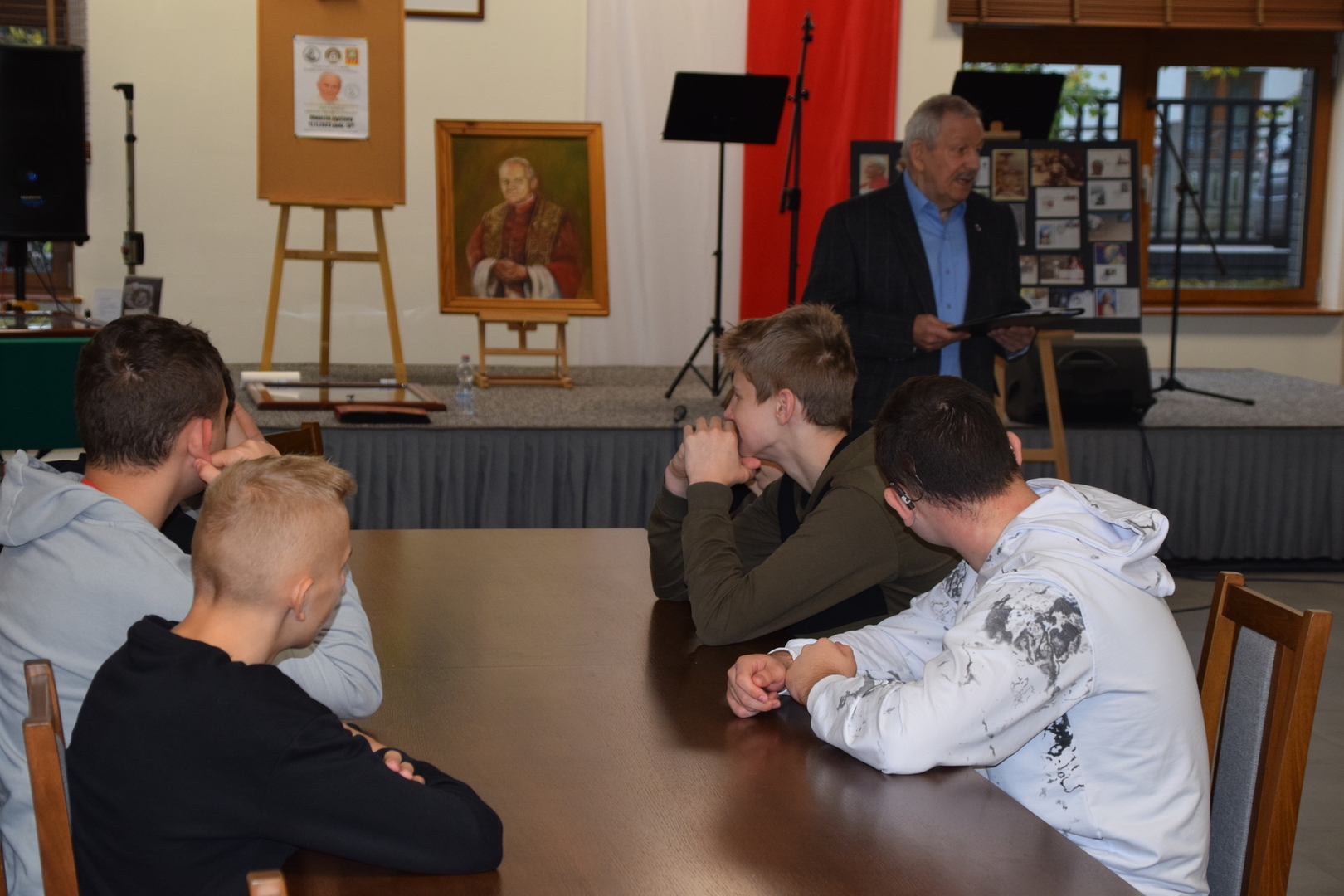 Najpierw uczniowie klas siódmych wysłuchali prelekcji dotyczącej życia Świętego Jana Pawła II oraz wzięli udział w konkursie związanym z osobą Wielkiego Polaka. Następnie obejrzeli eksponaty zgromadzone przez autora wystawy: znaczki pocztowe, medale, monety i banknoty przedstawiające wizerunek Świętego oraz fakty związane z pontyfikatem i pielgrzymkami Wielkiego Papieża.