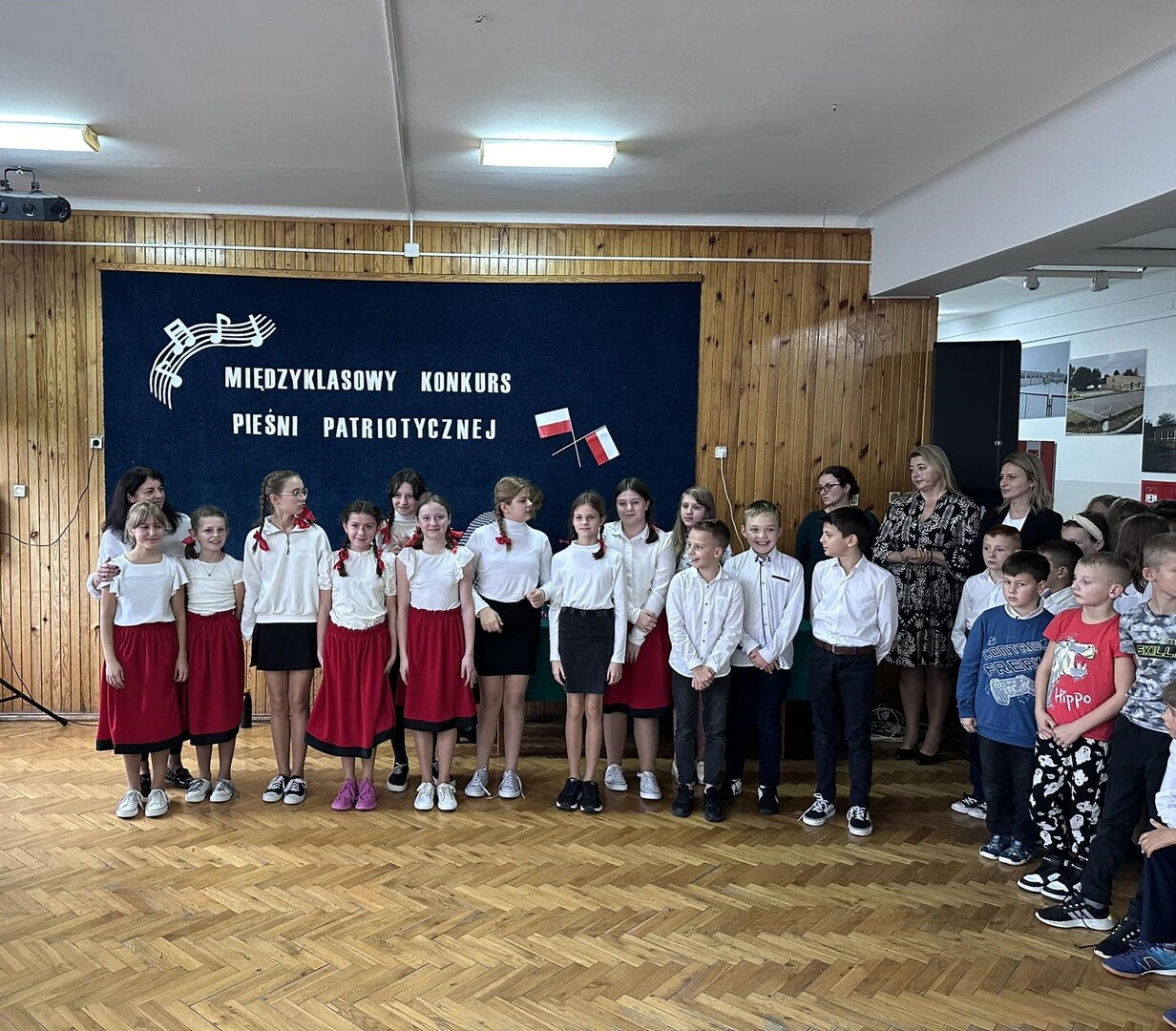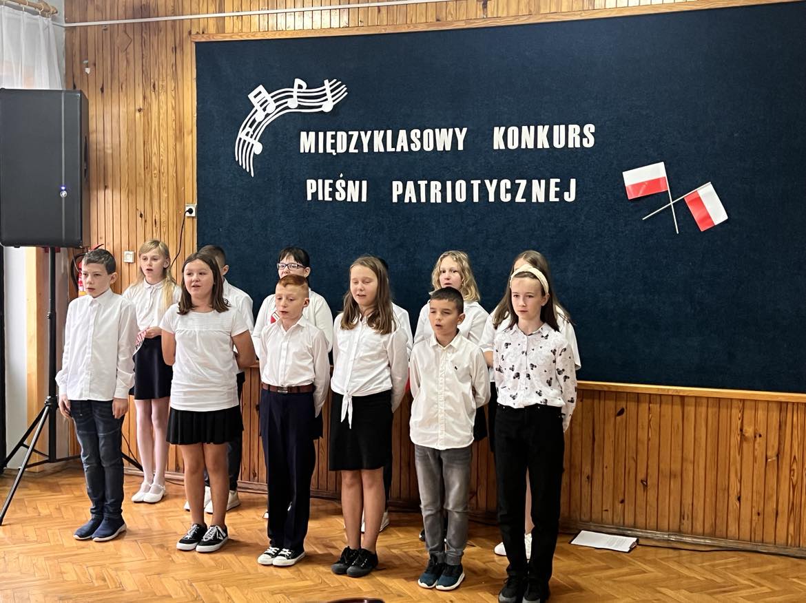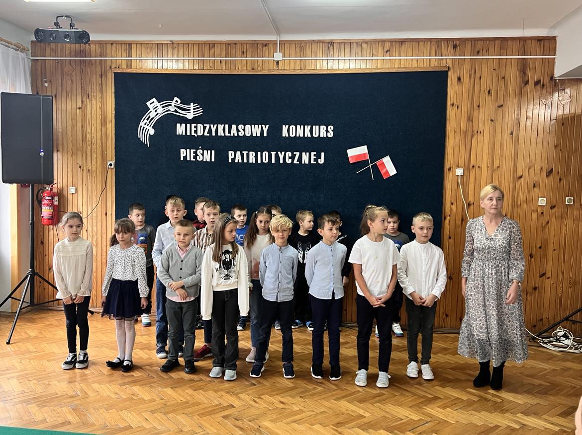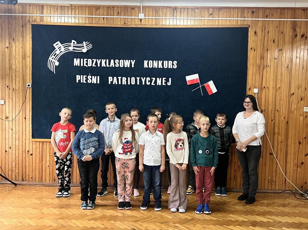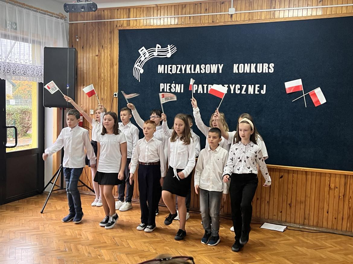 Pieśni patriotyczne były nadzieją w najtrudniejszych chwilach, podporą w chwilach zwątpienia, w ciężkich czasach zaborów, powstań i wojen, w okresach walk o niepodległość ojczyzny. Pozwalały na chwilę zapomnieć o oddaleniu od rodzinnego domu, bliskich, niekiedy ich stracie, a także o samotności i tęsknocie na obczyźnie. Najpiękniejsze pieśni patriotyczne wykonali uczniowie naszej szkoły w trakcie konkursu, który odbył się 3 listopada 2023r. Rywalizacja odbywała się między klasami w dwóch kategoriach: klasy II-IV i V-VIII. Wszyscy uczestniczy sumiennie przygotowali się do występów i prezentowali wysoki poziom wokalny. Dodatkowo zachwycili publiczność i jury strojami oraz choreografią. Usłyszeliśmy m.in.: “Rotę”, “Pierwszą brygadę”, “Szarą piechotę”, “Rozkwitały pąki białych róż”, “Jesteśmy Polką i Polakiem”, “Płynie Wisła, płynie”, “Nie masz nad żołnierza”. W komisji konkursowej uczestniczyły: pani Grażyna Susik, pani Justyna Pecyna, pani Aneta Dominiak, pani Agnieszka Wysokińska i pani Urszula Starosta. Decyzją jury zwyciężyły klasy IV a z piosenką “Serce w plecaku” i V a z pieśnią “Przybyli ułani”. Dziękujemy uczestnikom za ogromne zaangażowanie i gratulujemy zwycięzcom.