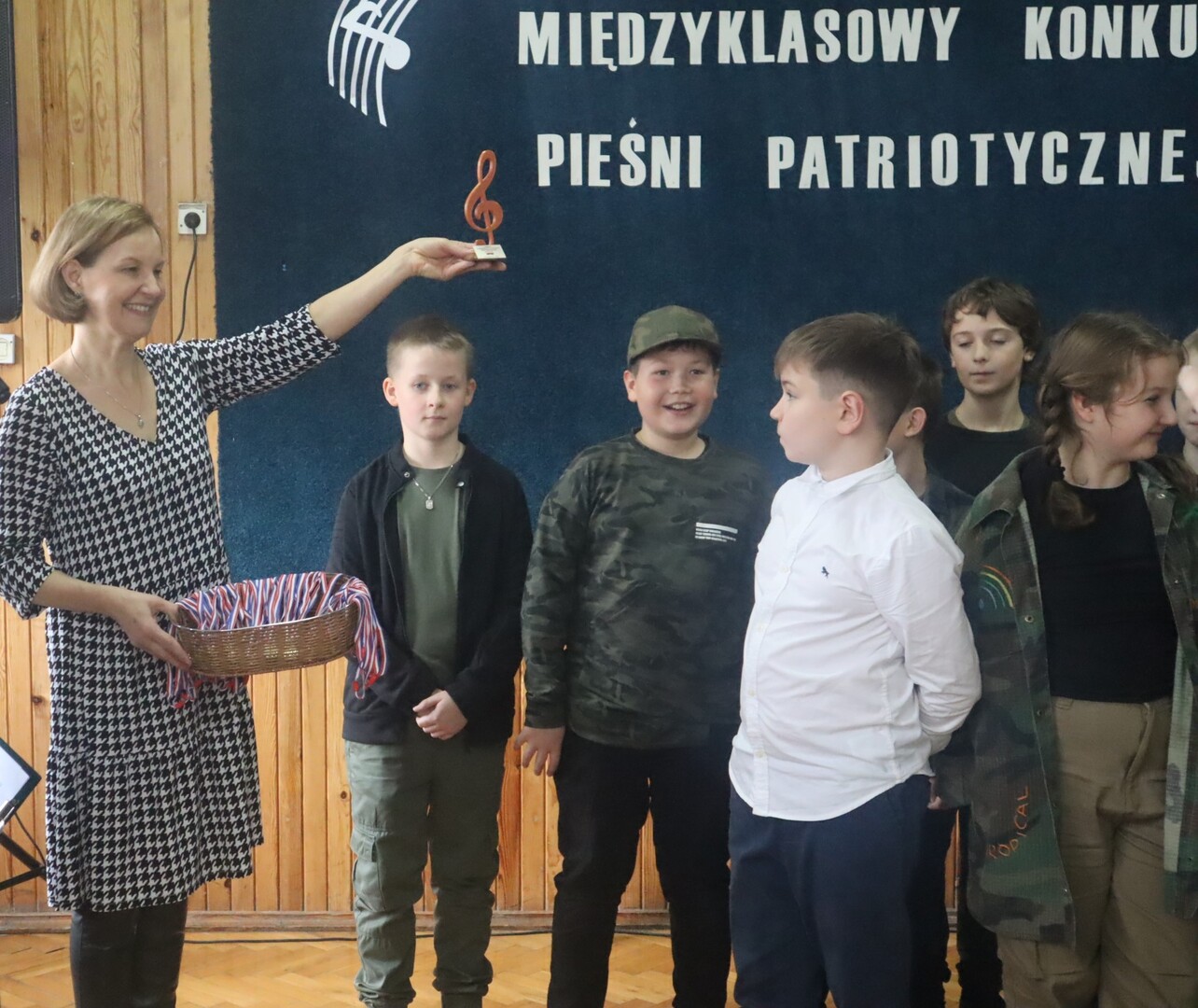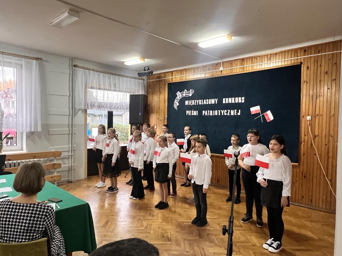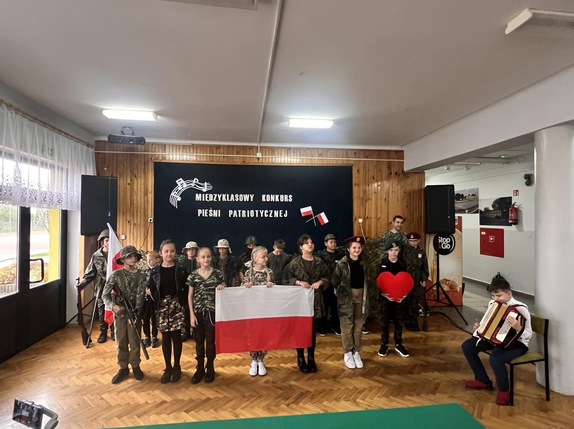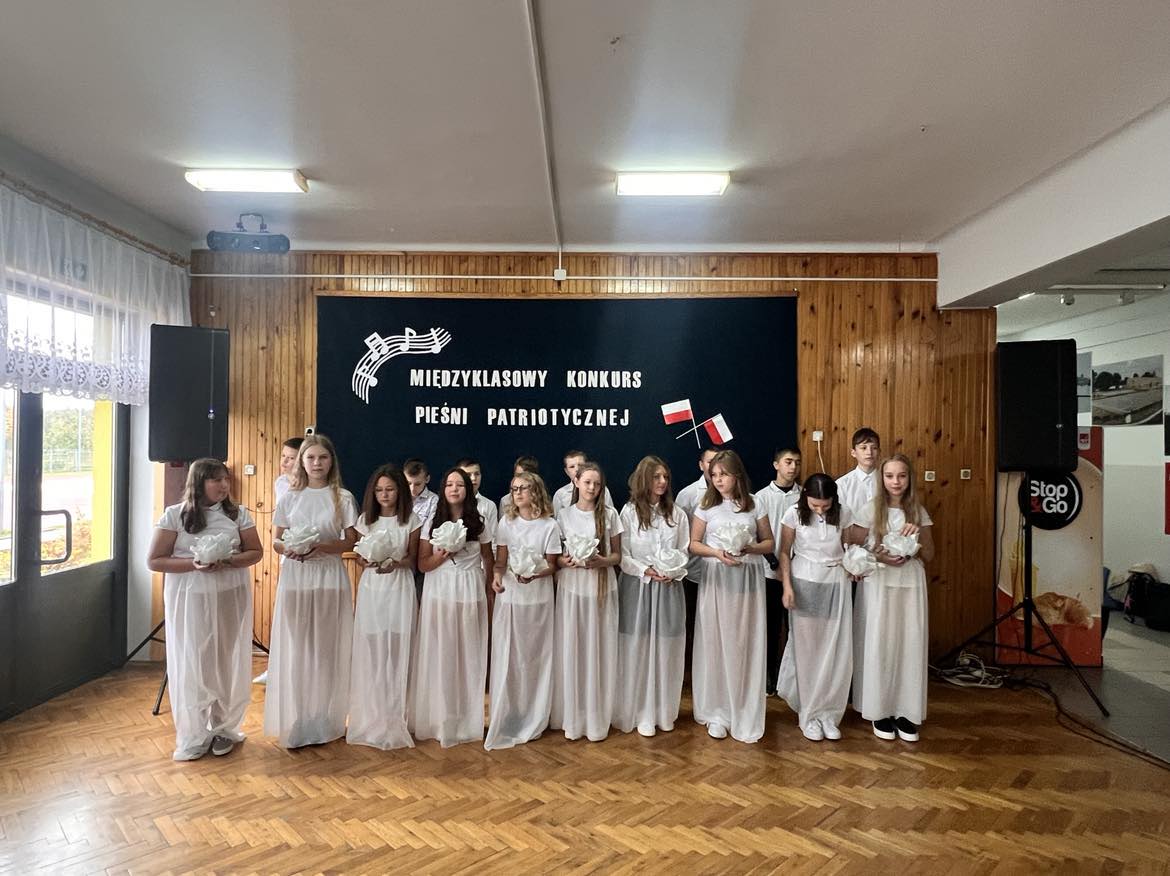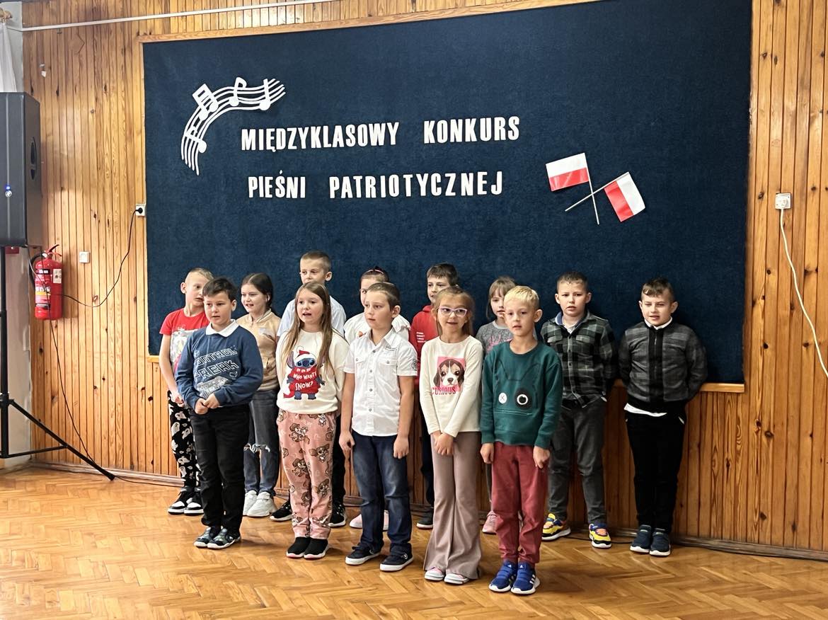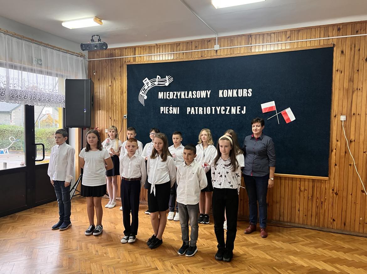 Pieśni patriotyczne były nadzieją w najtrudniejszych chwilach, podporą w chwilach zwątpienia, w ciężkich czasach zaborów, powstań i wojen, w okresach walk o niepodległość ojczyzny. Pozwalały na chwilę zapomnieć o oddaleniu od rodzinnego domu, bliskich, niekiedy ich stracie, a także o samotności i tęsknocie na obczyźnie. Najpiękniejsze pieśni patriotyczne wykonali uczniowie naszej szkoły w trakcie konkursu, który odbył się 3 listopada 2023r. Rywalizacja odbywała się między klasami w dwóch kategoriach: klasy II-IV i V-VIII. Wszyscy uczestniczy sumiennie przygotowali się do występów i prezentowali wysoki poziom wokalny. Dodatkowo zachwycili publiczność i jury strojami oraz choreografią. Usłyszeliśmy m.in.: “Rotę”, “Pierwszą brygadę”, “Szarą piechotę”, “Rozkwitały pąki białych róż”, “Jesteśmy Polką i Polakiem”, “Płynie Wisła, płynie”, “Nie masz nad żołnierza”. W komisji konkursowej uczestniczyły: pani Grażyna Susik, pani Justyna Pecyna, pani Aneta Dominiak, pani Agnieszka Wysokińska i pani Urszula Starosta. Decyzją jury zwyciężyły klasy IV a z piosenką “Serce w plecaku” i V a z pieśnią “Przybyli ułani”. Dziękujemy uczestnikom za ogromne zaangażowanie i gratulujemy zwycięzcom.