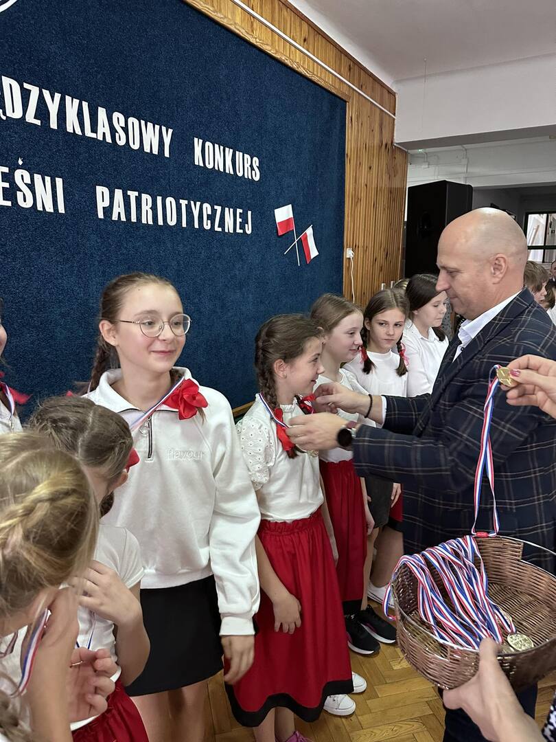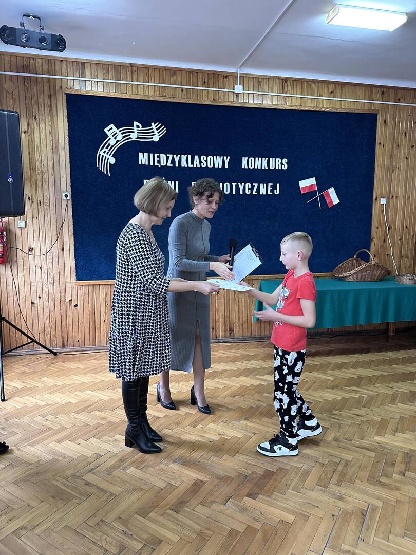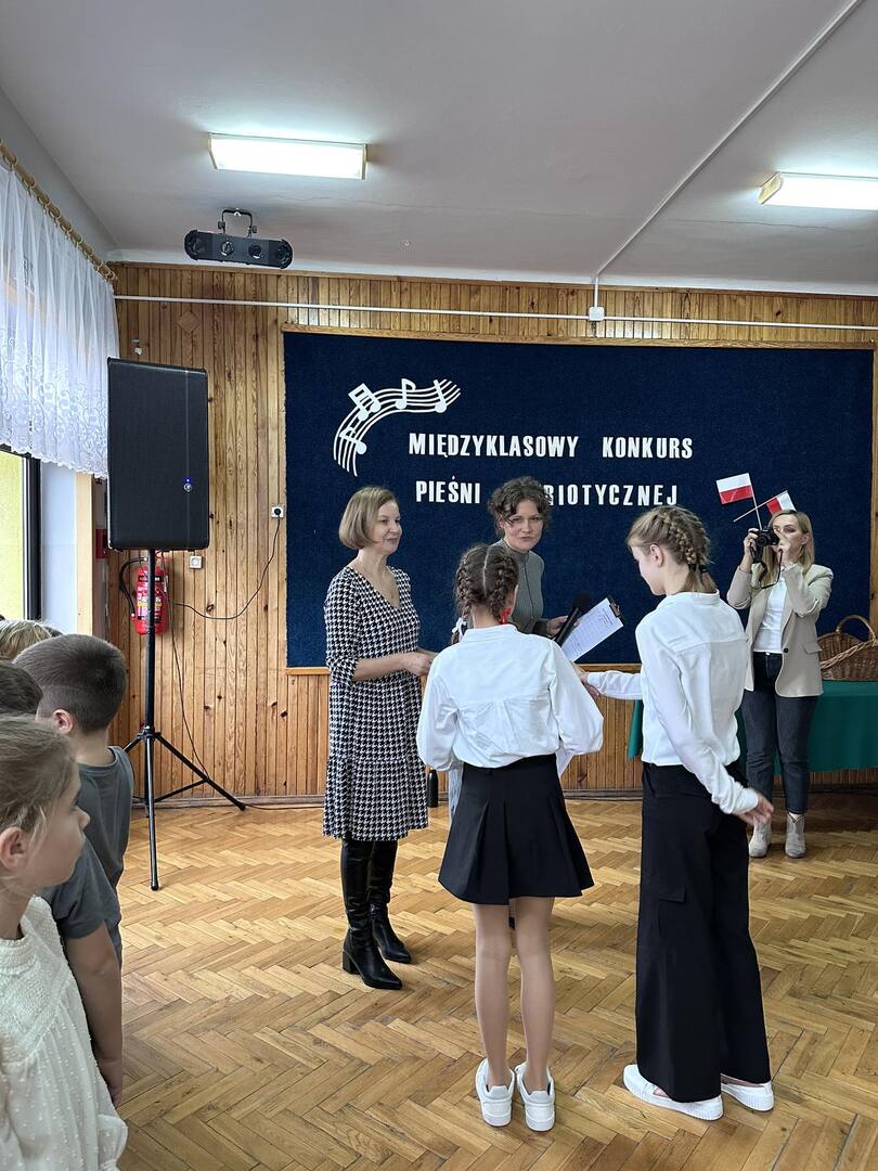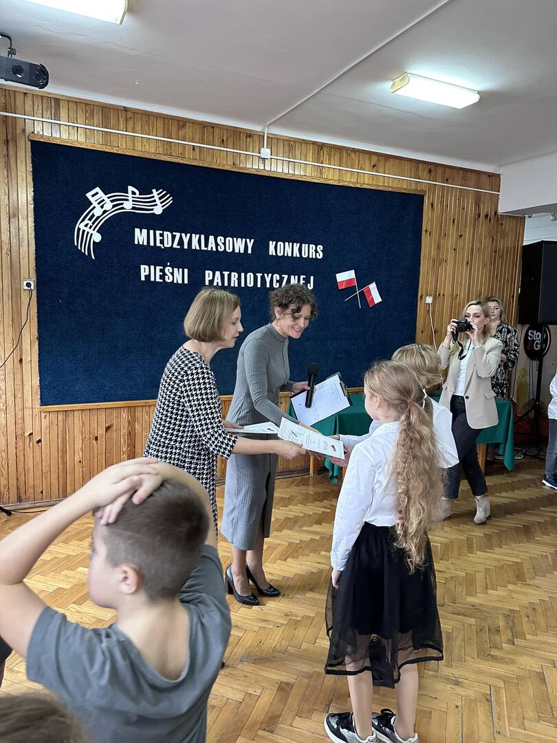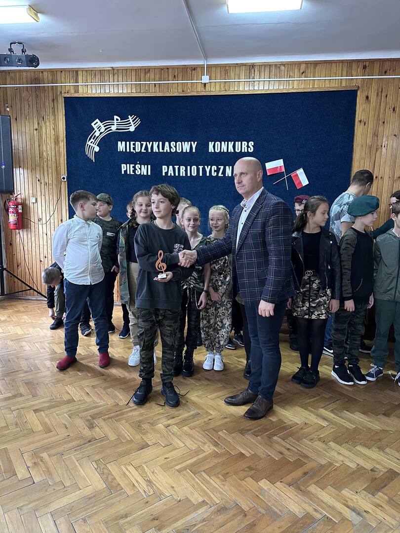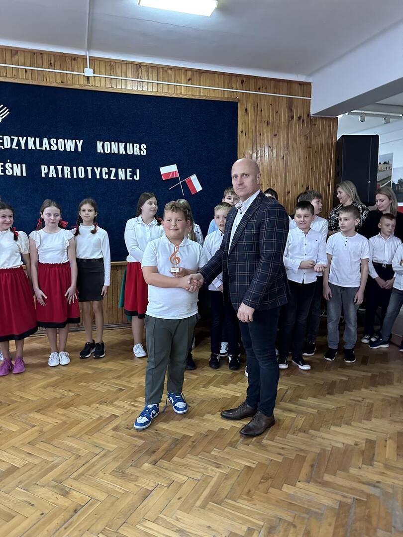 Pieśni patriotyczne były nadzieją w najtrudniejszych chwilach, podporą w chwilach zwątpienia, w ciężkich czasach zaborów, powstań i wojen, w okresach walk o niepodległość ojczyzny. Pozwalały na chwilę zapomnieć o oddaleniu od rodzinnego domu, bliskich, niekiedy ich stracie, a także o samotności i tęsknocie na obczyźnie. Najpiękniejsze pieśni patriotyczne wykonali uczniowie naszej szkoły w trakcie konkursu, który odbył się 3 listopada 2023r. Rywalizacja odbywała się między klasami w dwóch kategoriach: klasy II-IV i V-VIII. Wszyscy uczestniczy sumiennie przygotowali się do występów i prezentowali wysoki poziom wokalny. Dodatkowo zachwycili publiczność i jury strojami oraz choreografią. Usłyszeliśmy m.in.: “Rotę”, “Pierwszą brygadę”, “Szarą piechotę”, “Rozkwitały pąki białych róż”, “Jesteśmy Polką i Polakiem”, “Płynie Wisła, płynie”, “Nie masz nad żołnierza”. W komisji konkursowej uczestniczyły: pani Grażyna Susik, pani Justyna Pecyna, pani Aneta Dominiak, pani Agnieszka Wysokińska i pani Urszula Starosta. Decyzją jury zwyciężyły klasy IV a z piosenką “Serce w plecaku” i V a z pieśnią “Przybyli ułani”. Dziękujemy uczestnikom za ogromne zaangażowanie i gratulujemy zwycięzcom.