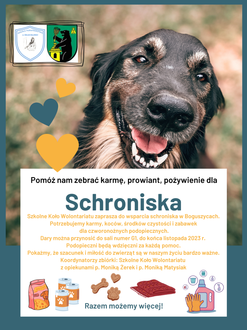 Szkolne Koło Wolontariatu zaprasza do udziału w zbiórce darów na rzecz schroniska dla zwierząt w Boguszycach. Chcielibyśmy pomóc potrzebującym zwierzętom, które nie mają domu i ciepłego miejsca do spania.