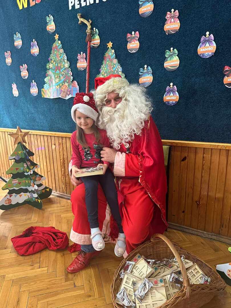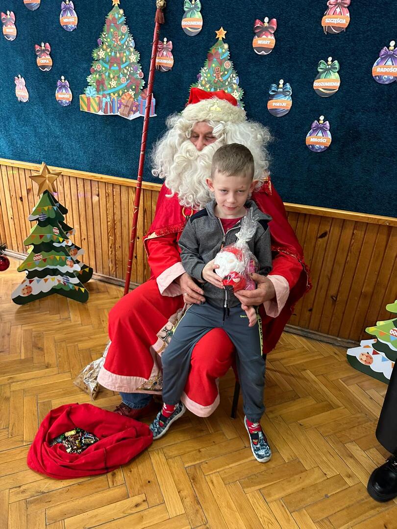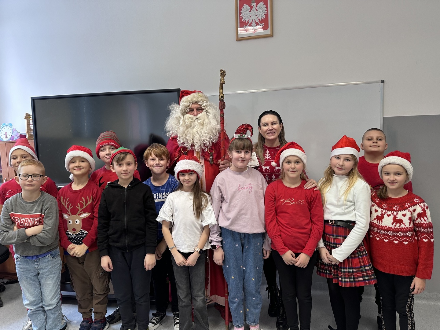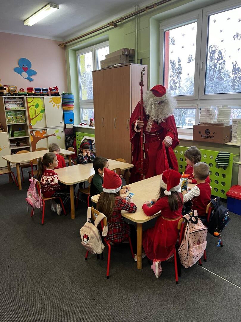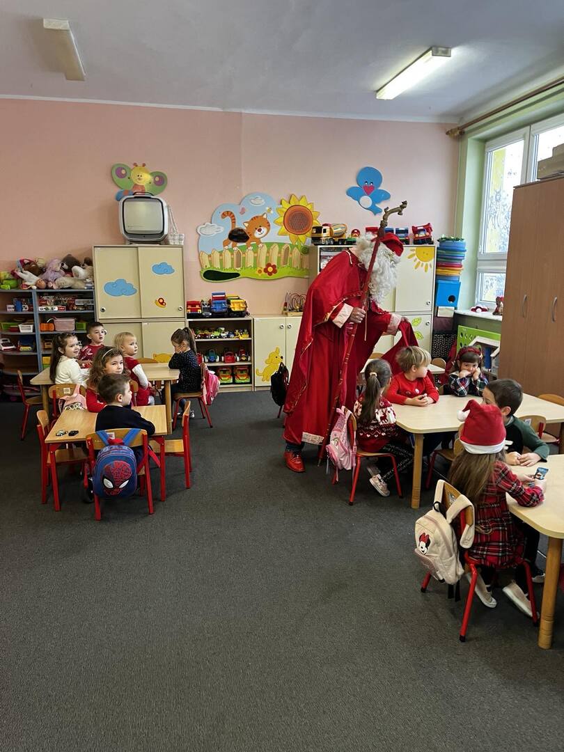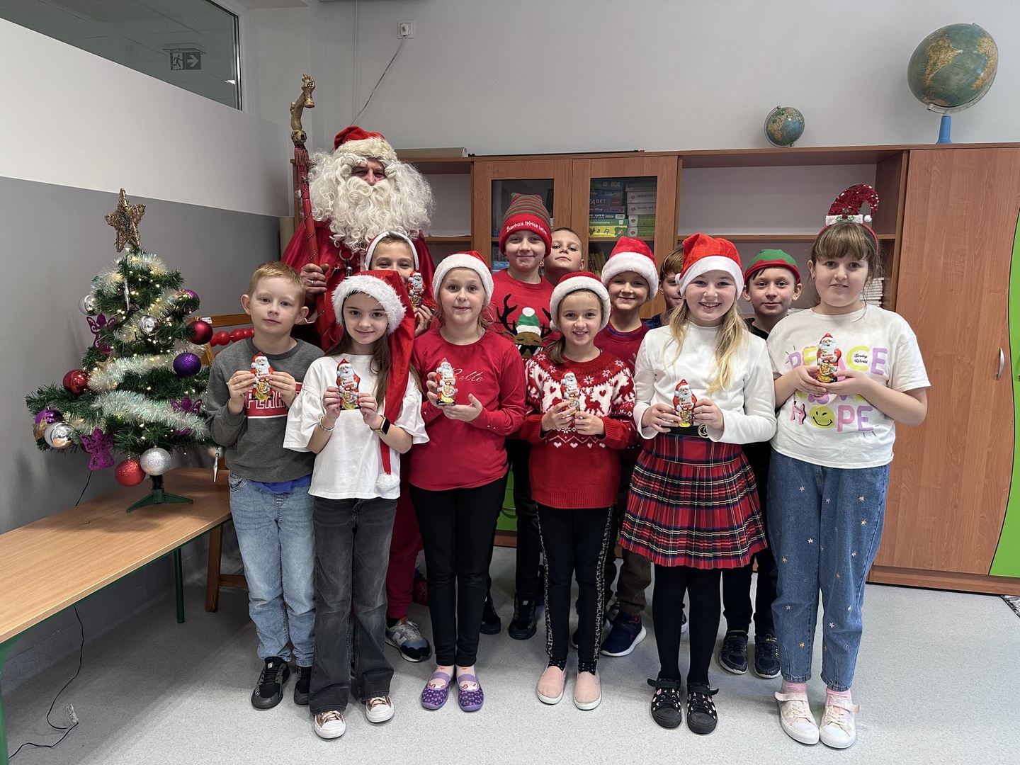 Jak co roku, 6 grudnia 2023r. naszą szkołę odwiedził Mikołaj. Wizyta zacnego gościa wywołała uśmiech na twarzach naszych uczniów, nauczycieli oraz pracowników szkoły. Każda z grup przedszkolnych przygotowała gorące powitanie dla Mikołaja. Już od samego rana dzieci z niecierpliwością wyczekiwały dźwięku dzwoneczka zapowiadającego przybycie tego wyjątkowego gościa. Przedszkolaki zaprezentowały przygotowane wiersze oraz piosenki. Długo oczekiwany gość obdarował w zamian dzieci słodyczami oraz upominkami. Mikołaj nie zapomniał również o starszych uczniach.
