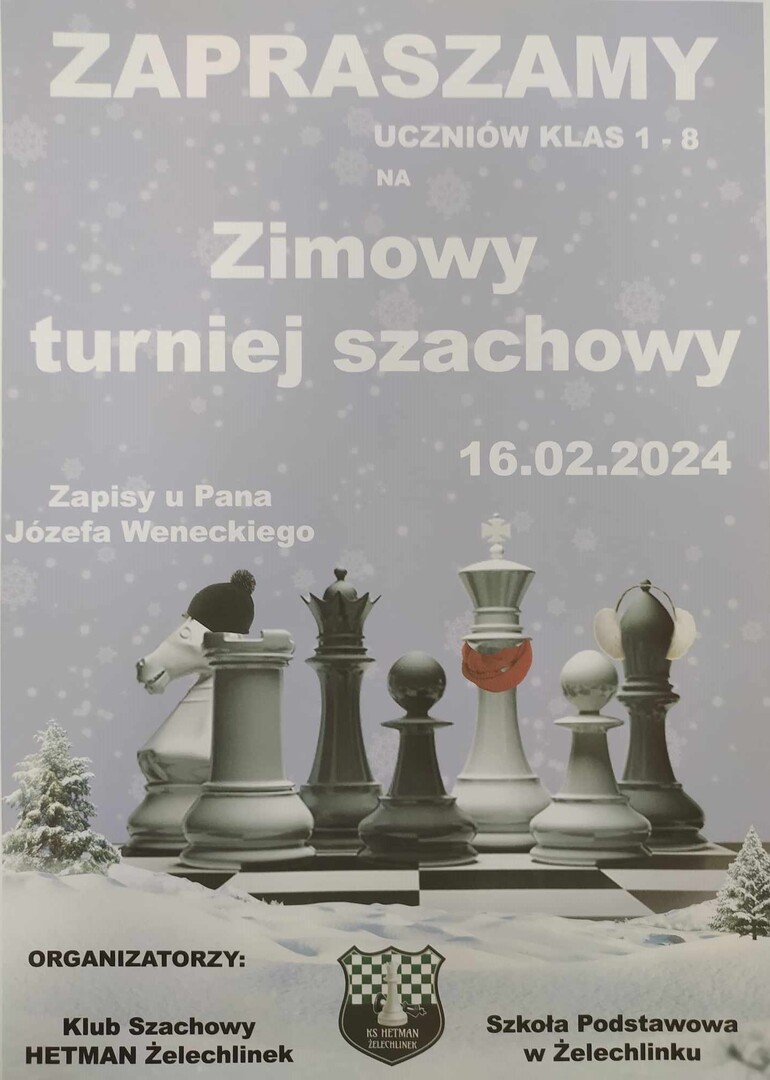 Szkolni szachiści, zapraszamy Was na Zimowy Wewnątrzszkolny Turniej Szachowy, który odbędzie się 16 lutego w naszej szkole. Rozwijajcie swoje pasje i ubogacajcie wewnętrzne przeżycia. Uczcie się wzajemnych relacji i szacunku. Zapewniam Was, że szachy są drogą, którą warto pójść. Dzięki nim poznacie swoje wnętrze, nabierzecie dystansu i rozwiniecie abstrakcyjne myślenie. Zapisy do turnieju będą odbywać się po feriach. Ilość miejsc ograniczona do 40 zawodników. Podejmij właściwą decyzję. Zapisz się, zagraj, bo warto!!! Informacje szczegółowe na plakacie.