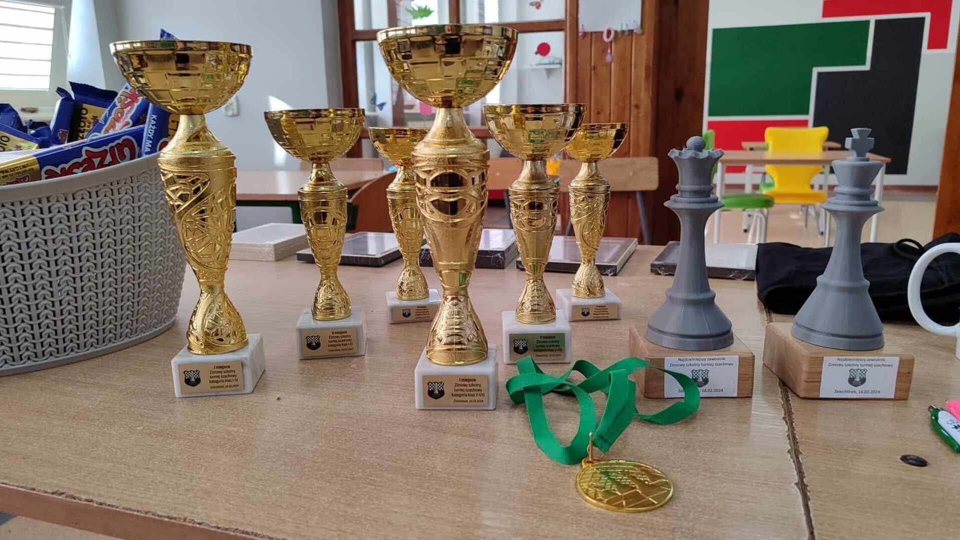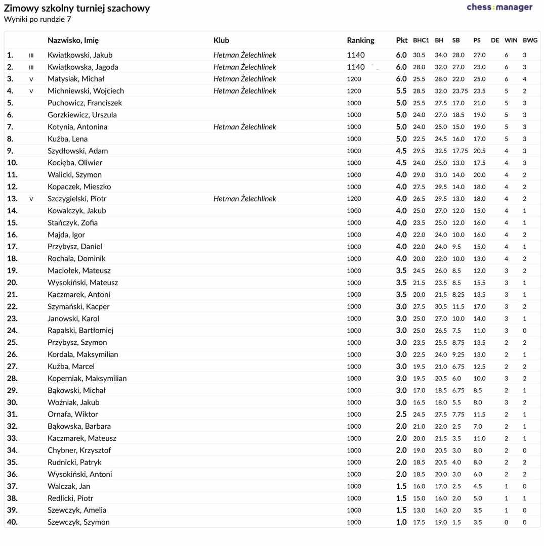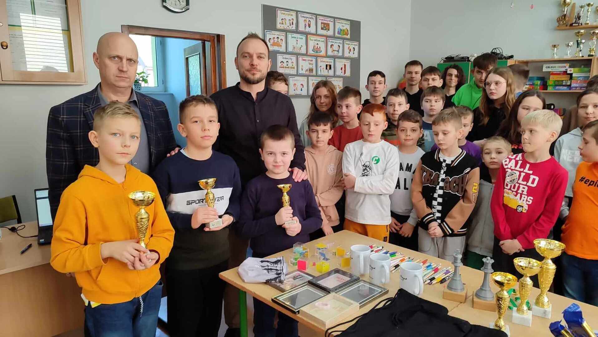 W dniu 16.02.2024 r. uczniowie naszej szkoły uczestniczyli w szkolnym turnieju szachowym. Organizatorami turnieju byli KS Hetman Żelechlinek oraz SP Żelechlinek. Wystartowało 40 zawodników i wszyscy, pomimo różnych trudności i kryzysów, wytrwali do końca. Turniej przeprowadzono na dystansie 7 rund systemem szwajcarskim w tempie 10 minut na zawodnika. Klasyfikacja obejmowała dwie grupy wiekowe kl. I-IV oraz kl. V-VIII. Zwycięzcy w poszczególnych grupach to: kl. I-IV 1. JAKUB KWIATKOWSKI 2. ADAM SZYDŁOWSKI 3. SZYMON WALICKI Kl. V-VIII 1. JAGODA KWIATKOWSKA 2. MICHAŁ MATYSIAK 3. WOJCIECH MICHNIEWSKI. Tabela końcowa wszystkich wyników jest załączona w zdjęciach. Turniej wymagał od uczestników dużego wysiłku, cierpliwości i wytrwałości. Doceniając to, dostrzegliśmy najdzielniejszych graczy i oni otrzymali pamiątkowe statuetki. Są to SZYMON SZEWCZYK oraz AMELIA SZEWCZYK. Nad wszystkimi zawodnikami czuwała niezmiennie najczcigodniejsza "CAISSA" muza i bogini szachów. Swoją troską i natchnieniem obdarzyła wszystkich równo. Przytulała jednak najmocniej tych, którym było najciężej. W myśl tego założenia wszyscy okazali się zwycięzcami, bo wszyscy wykonali wiele wspaniałych posunięć i motywów szachowych. Niekoniecznie musimy zawsze wygrywać. Sama rywalizacja jest wartością "samą w sobie". Wszystkim zawodnikom serdecznie gratulujemy. Wszystkim zaangażowanym w organizację i przeprowadzenie turnieju bardzo dziękujemy. Największą wdzięczność i uznanie składamy panu PAWŁOWI KWIATKOWSKIEMU prezesowi KS Hetman Żelechlinek, który współorganizował turniej, zapewnił oprawę techniczną i przeprowadził rozgrywki. Dziękujemy KS Hetman Żelechlinek za ufundowanie pucharów i upominków. Dziękujemy miłośnikom szachów za "słodki akcent" umilający rywalizację. Zapraszamy na kolejny, wiosenny turniej, o którym szczegółowo będziemy informować. Z szachowym pozdrowieniem Józef Wenecki.