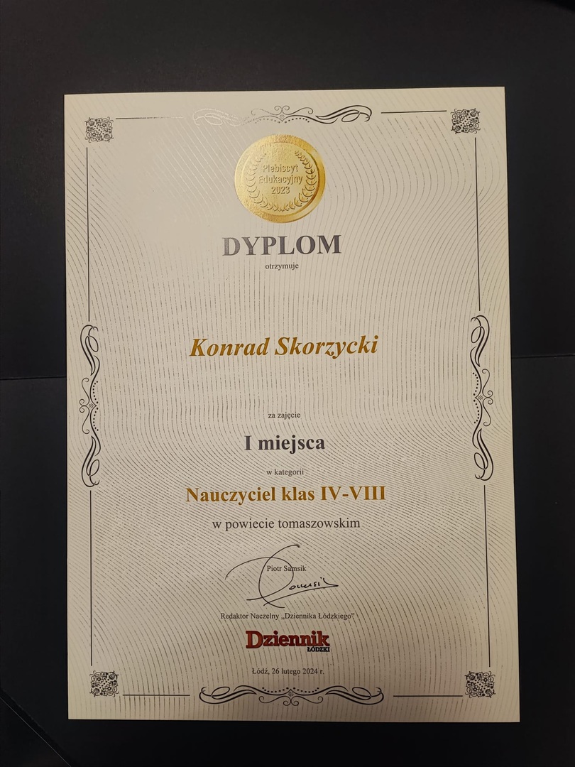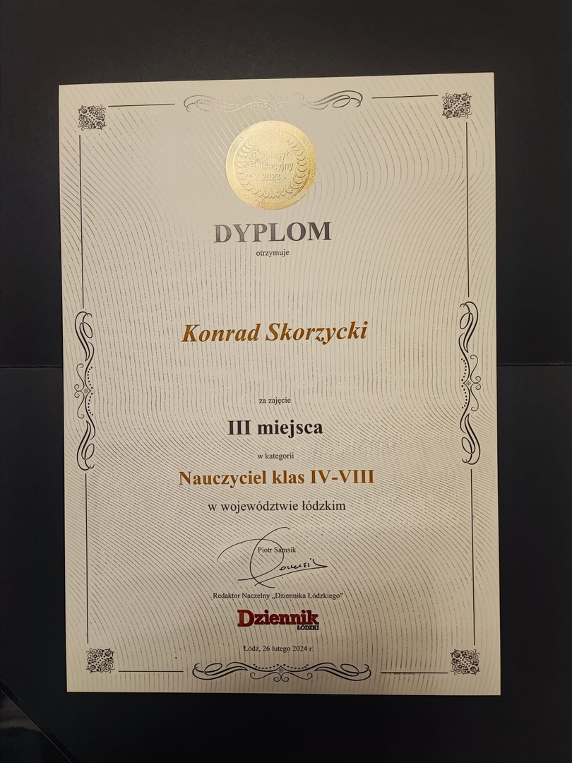 Jednym z laureatów tego Plebiscytu, w kategorii nauczyciel klas IV-VIII, został pan Konrad Skorzycki. Nauczyciel wychowania fizycznego i techniki naszej Szkoły zajął I miejsce w powiecie tomaszowskim i III w województwie łódzkim. To niezwykłe wyróżnienie i ogromny sukces. Panu Konradowi Skorzyckiemu serdecznie gratulujemy.