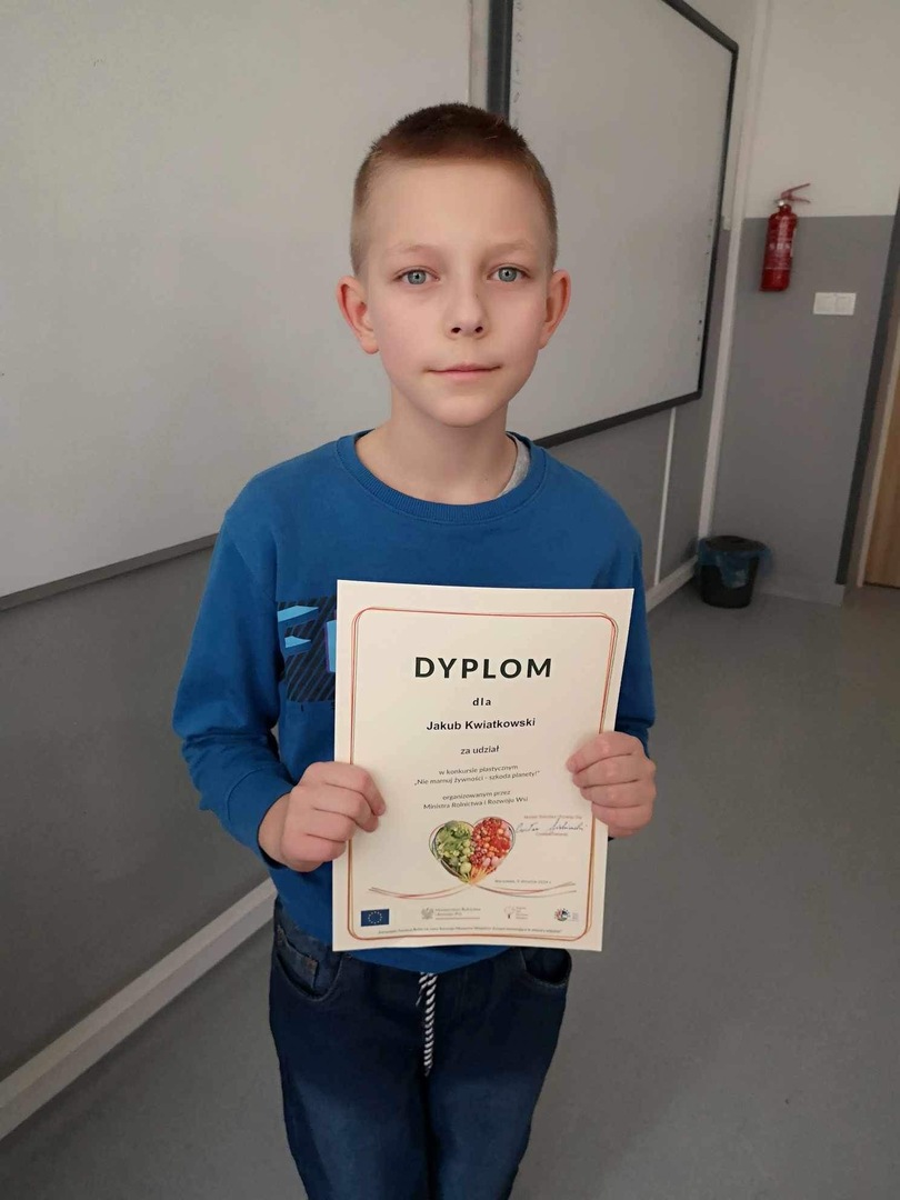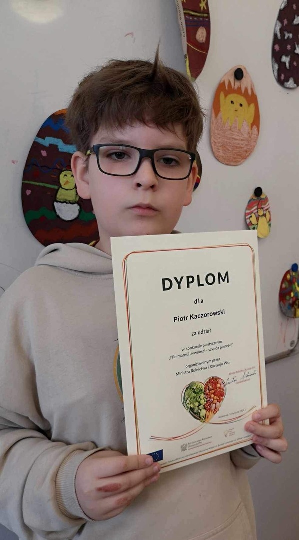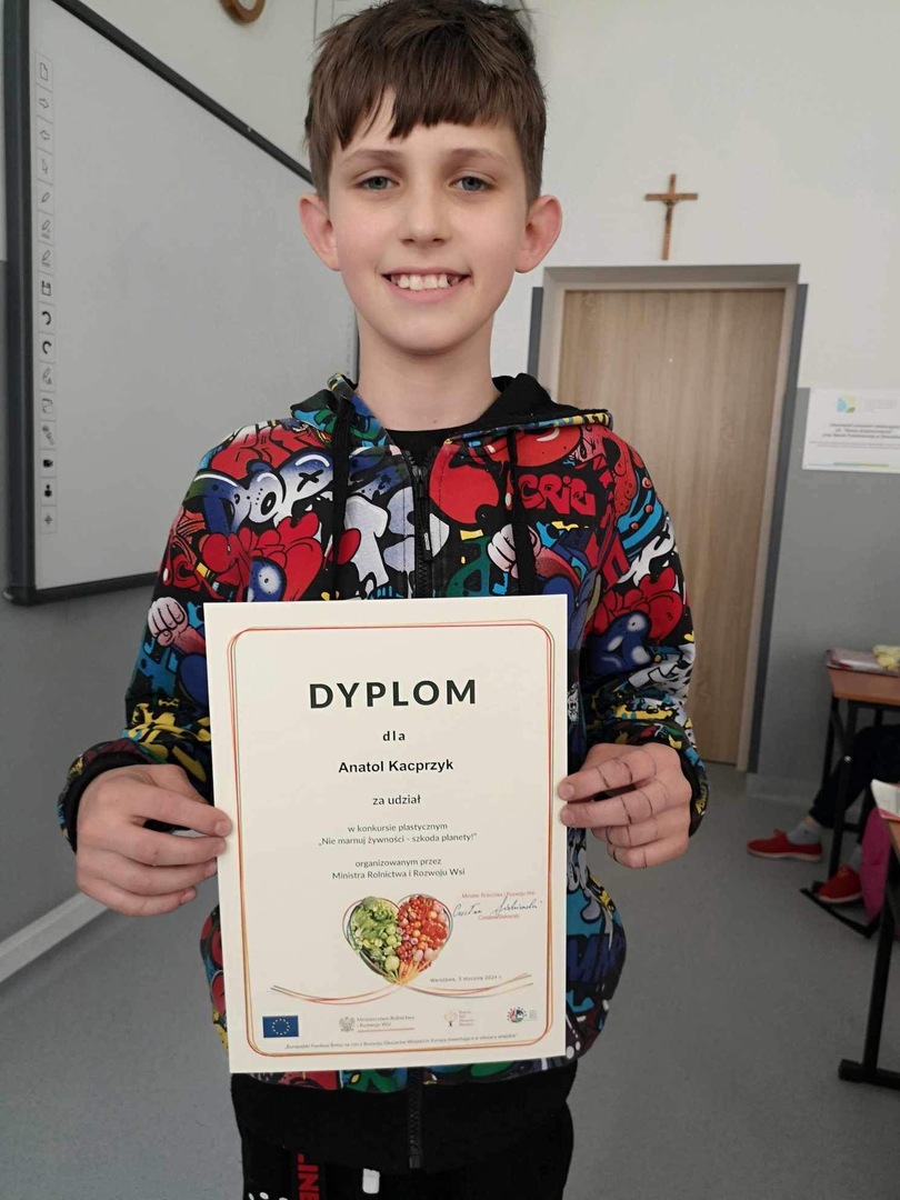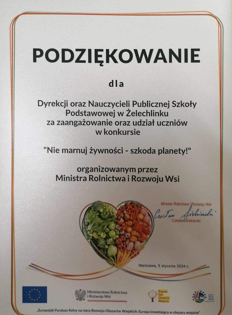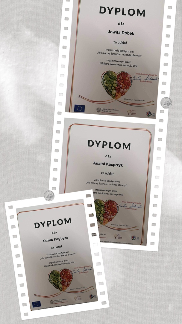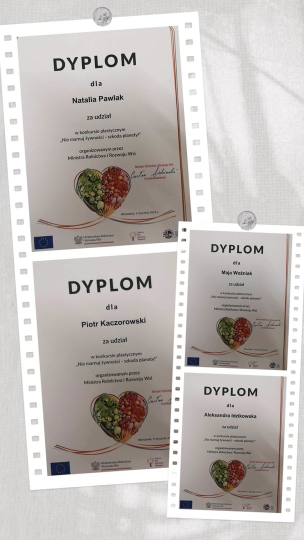 Uczniowie naszej szkoły wzięli udział w konkursie plastycznym pt. „Nie marnuj żywności-szkoda Planety” zorganizowanym przez Ministerstwo Rolnictwa i Rozwoju Wsi. Uczestnicy zostali nagrodzeni dyplomami. Podziękowania spłynęły również na ręce Dyrekcji oraz opiekuna konkursu.