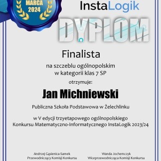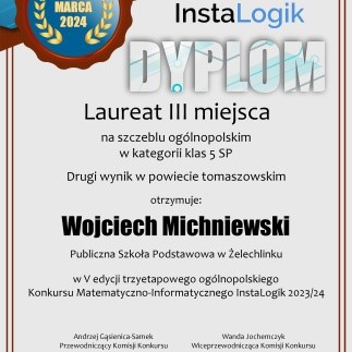 21 marca 2024 odbyło się podsumowanie ogólnopolskiego konkursu informatycznego. Naszą szkołę reprezentowało dwóch uczniów: Jan Michniewski, kl. 7a i Wojciech Michniewski, kl. 5 b.