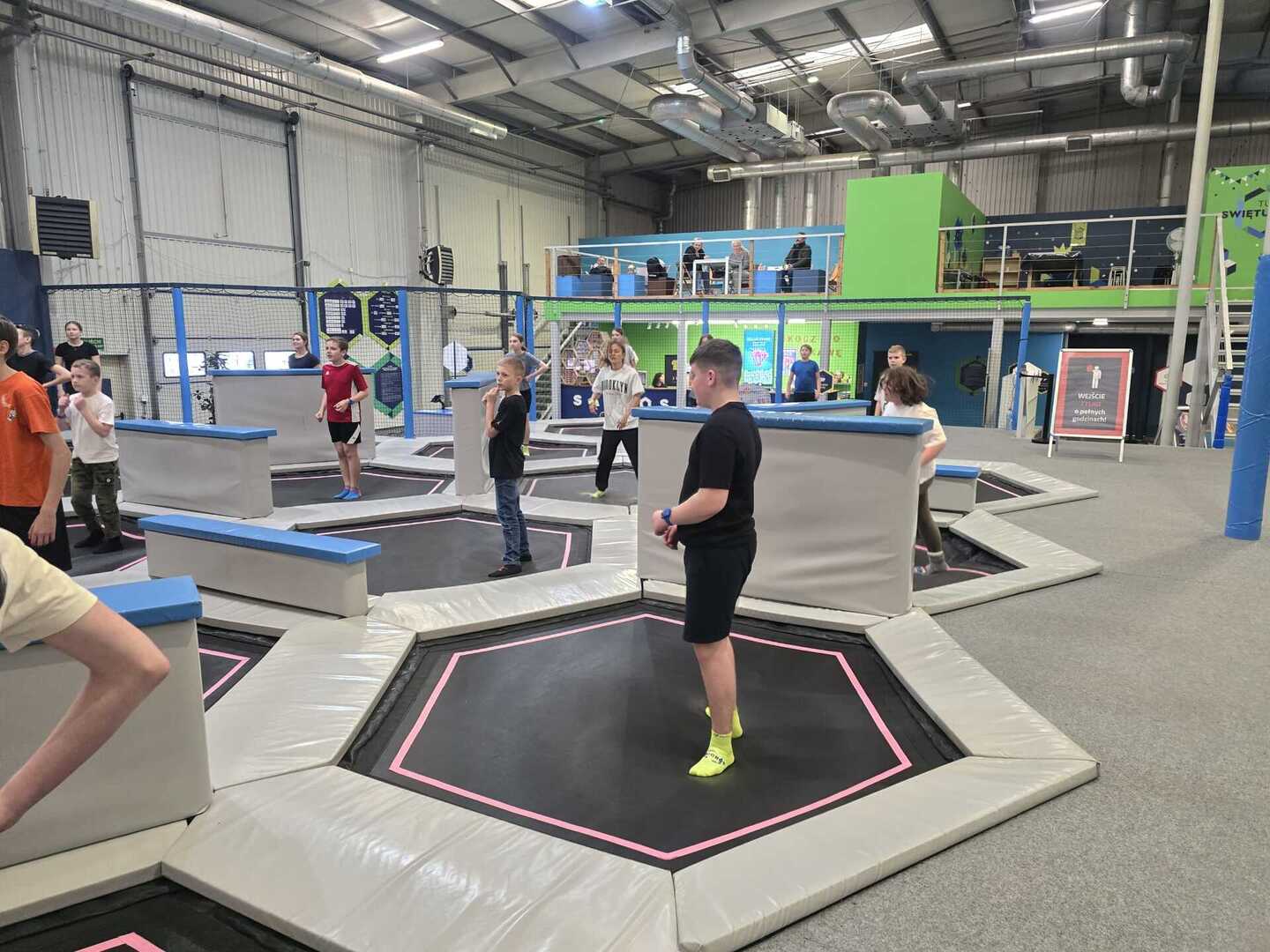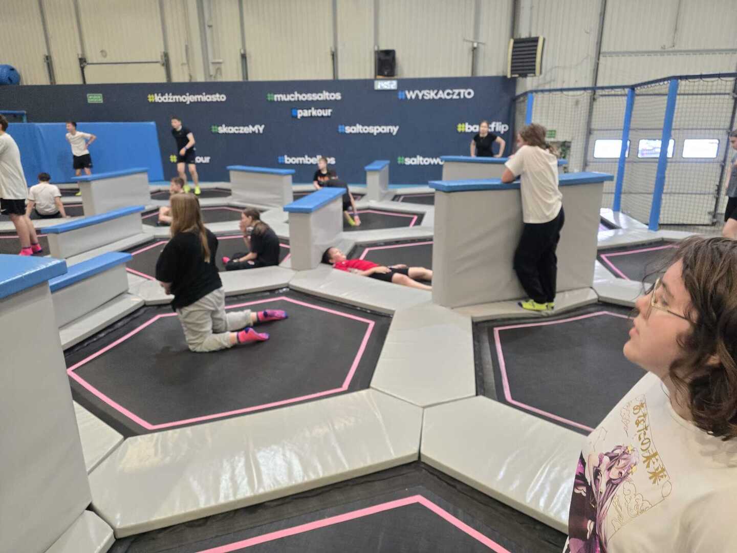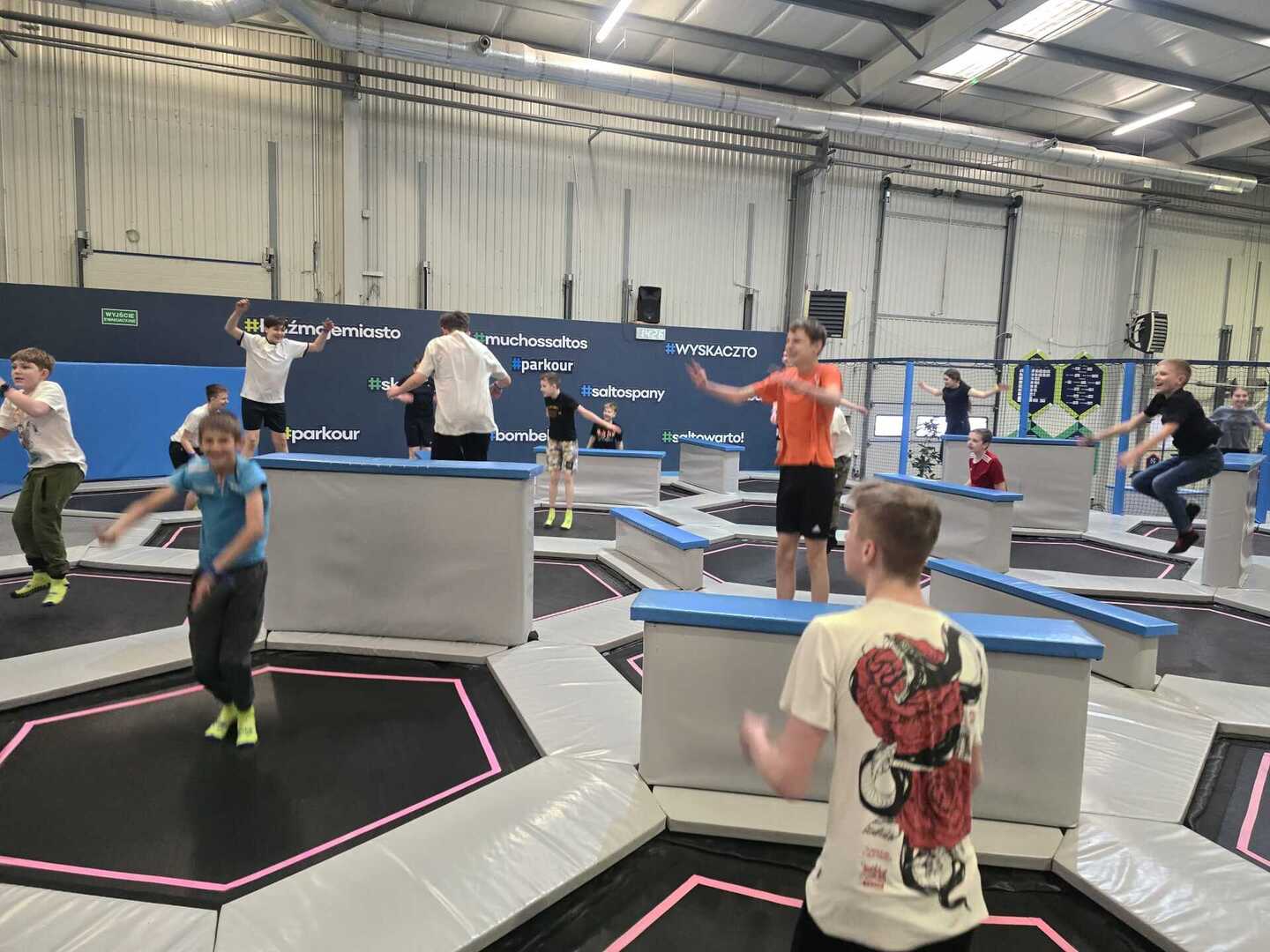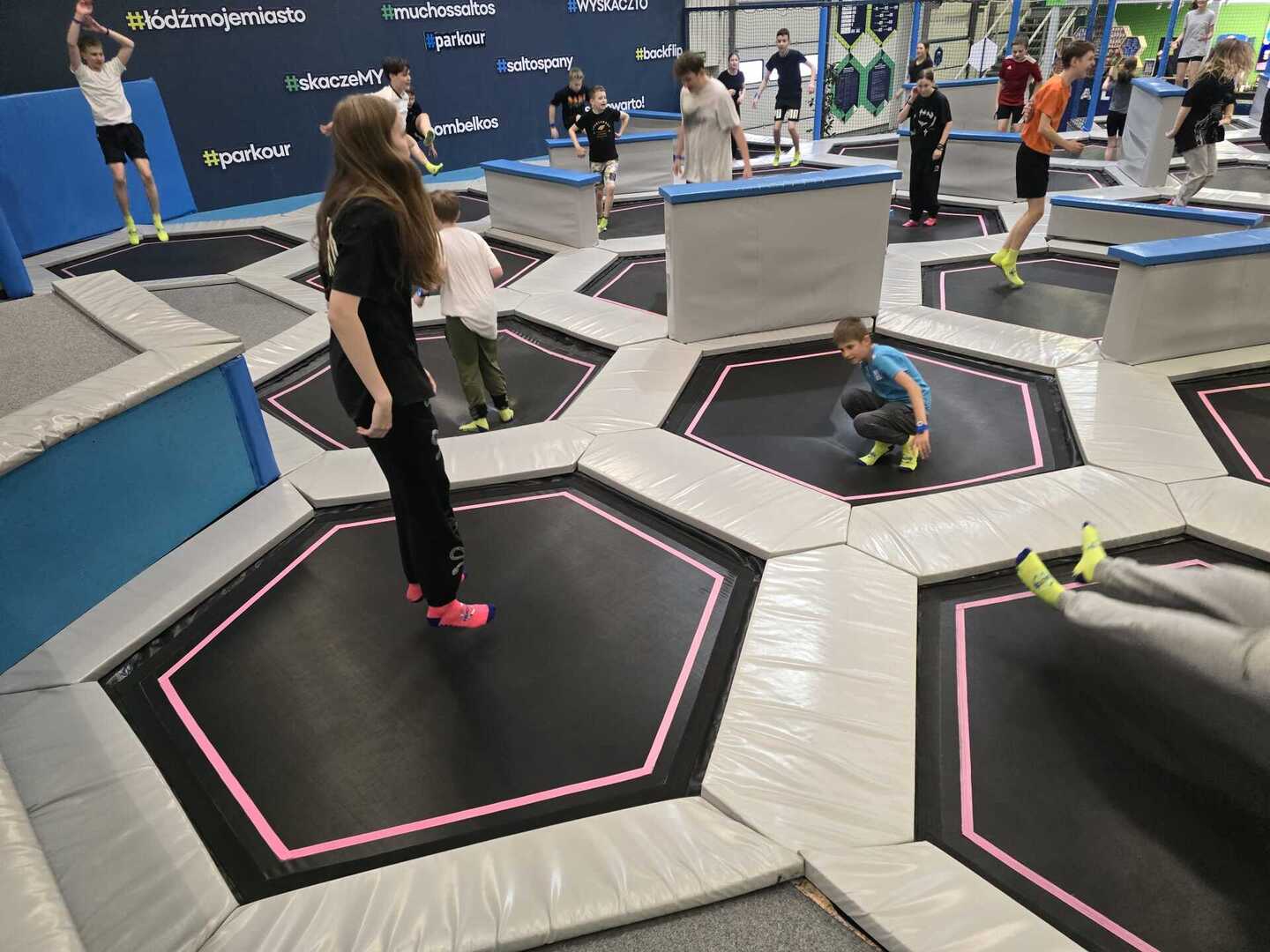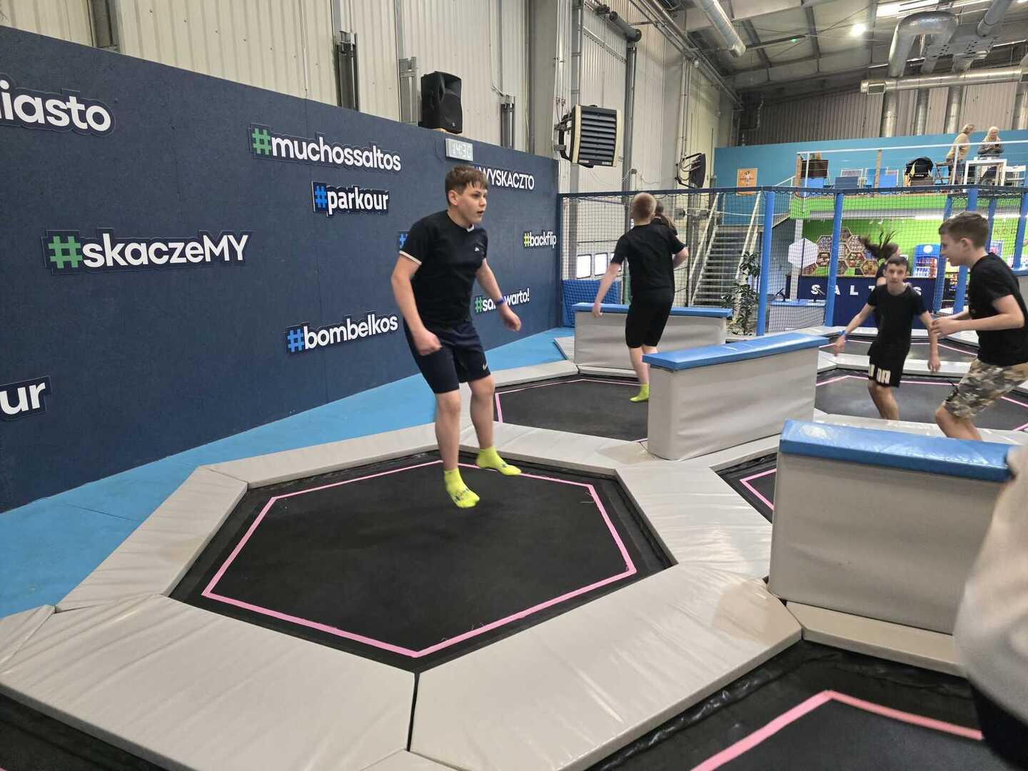 Kolejnym celem wycieczki był pobyt w parku trampolin z matami gimnastycznymi i basenem z gąbkami. Najpierw uczniowie przeszli szkolenie z zakresu bezpieczeństwa i techniki skoków. Następnie po profesjonalnej rozgrzewce pod okiem instruktorów korzystali z szeregu atrakcji. Wszyscy z radością skakali na różne sposoby. Dużym zainteresowaniem cieszyły się skoki do basenu z gąbkami.