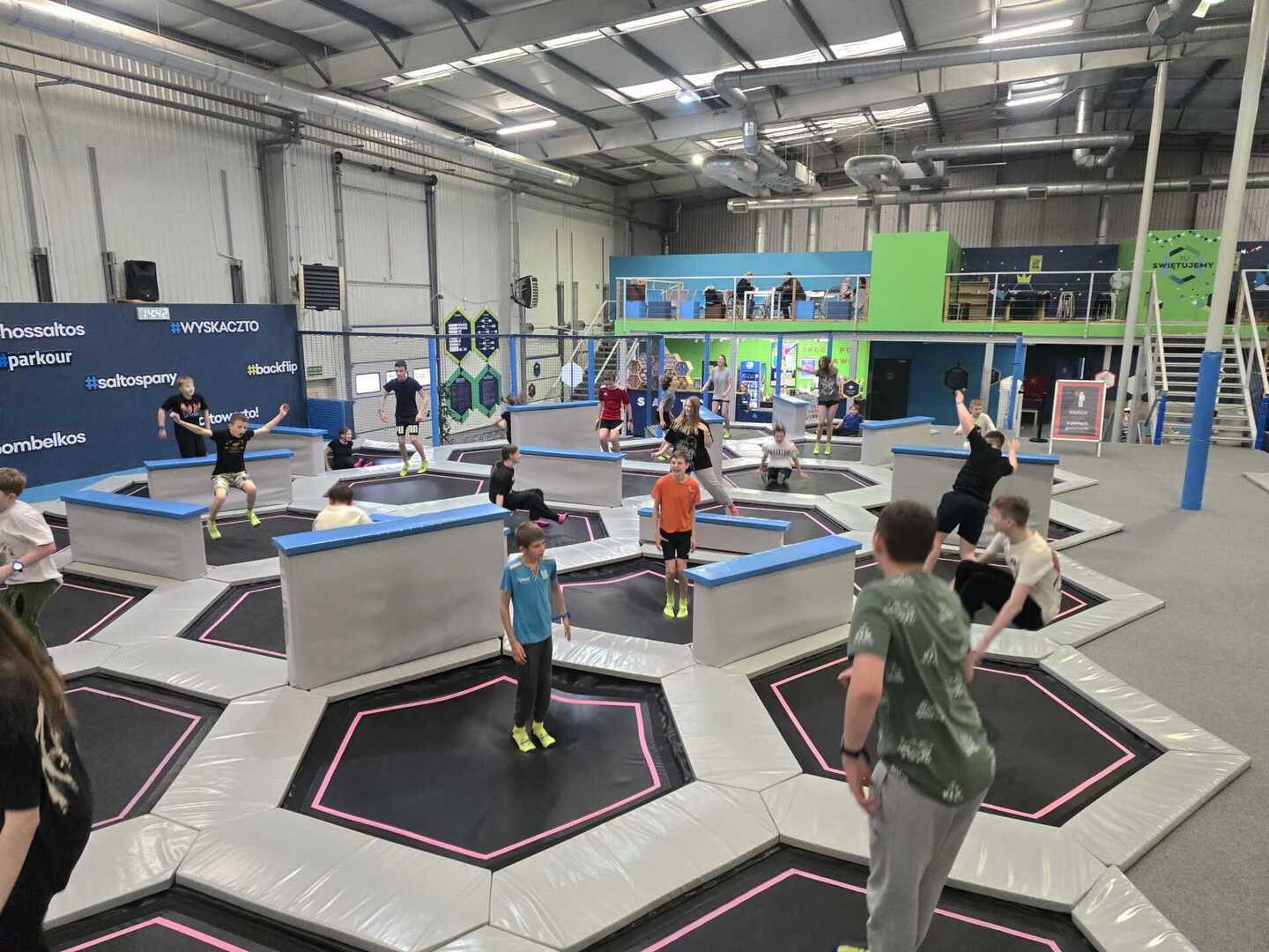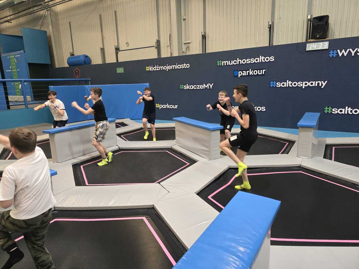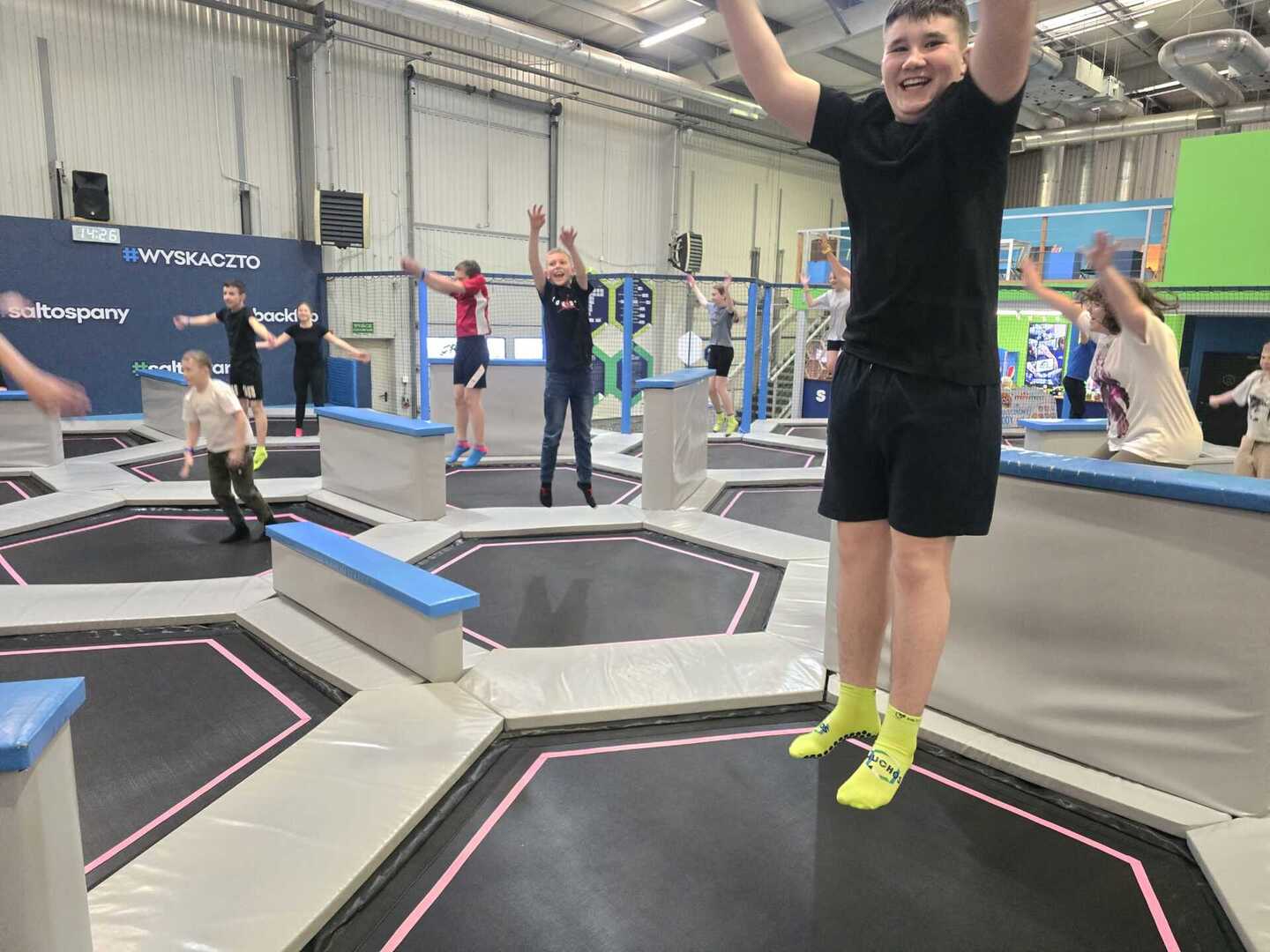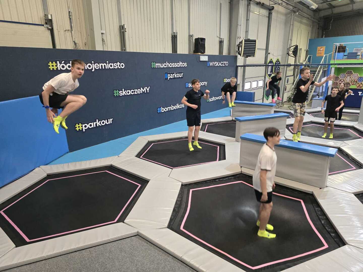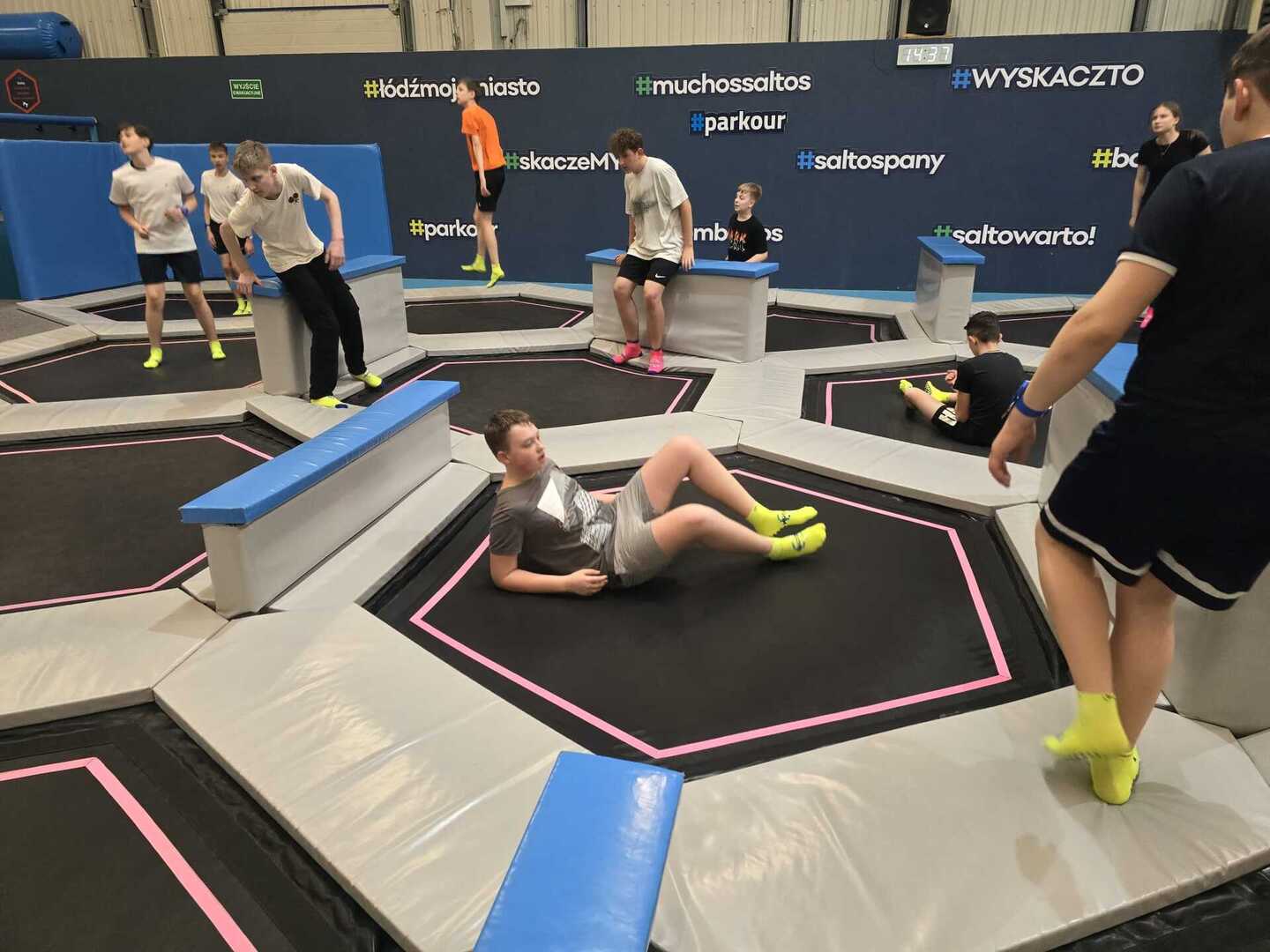 Kolejnym celem wycieczki był pobyt w parku trampolin z matami gimnastycznymi i basenem z gąbkami. Najpierw uczniowie przeszli szkolenie z zakresu bezpieczeństwa i techniki skoków. Następnie po profesjonalnej rozgrzewce pod okiem instruktorów korzystali z szeregu atrakcji. Wszyscy z radością skakali na różne sposoby. Dużym zainteresowaniem cieszyły się skoki do basenu z gąbkami.