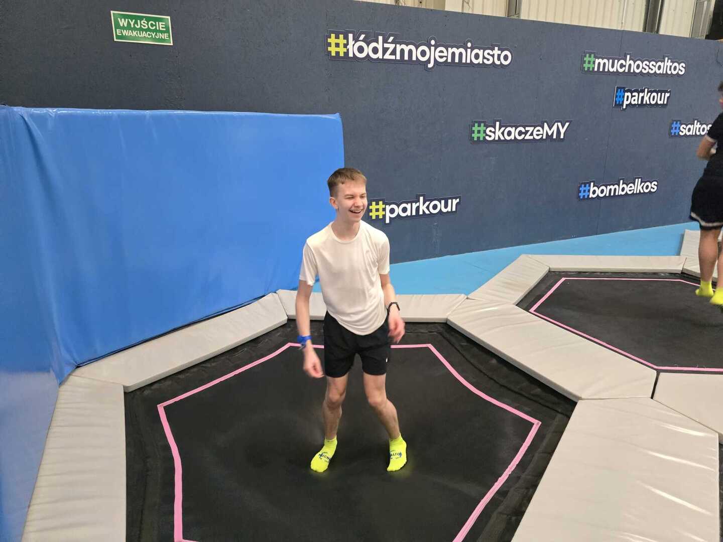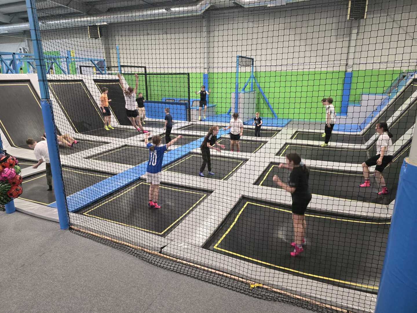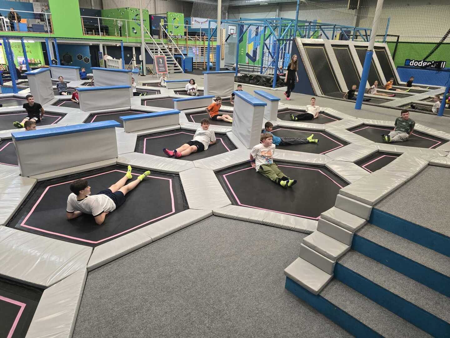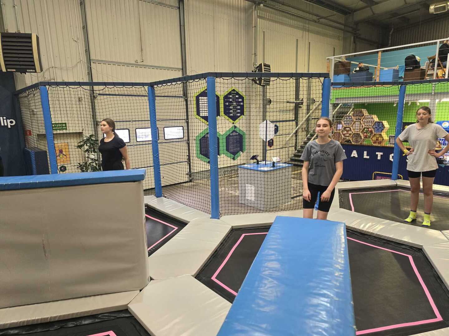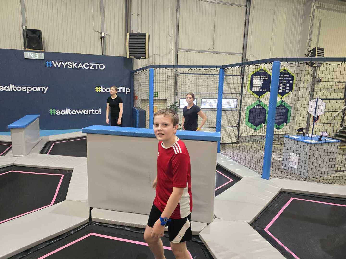 Kolejnym celem wycieczki był pobyt w parku trampolin z matami gimnastycznymi i basenem z gąbkami. Najpierw uczniowie przeszli szkolenie z zakresu bezpieczeństwa i techniki skoków. Następnie po profesjonalnej rozgrzewce pod okiem instruktorów korzystali z szeregu atrakcji. Wszyscy z radością skakali na różne sposoby. Dużym zainteresowaniem cieszyły się skoki do basenu z gąbkami.