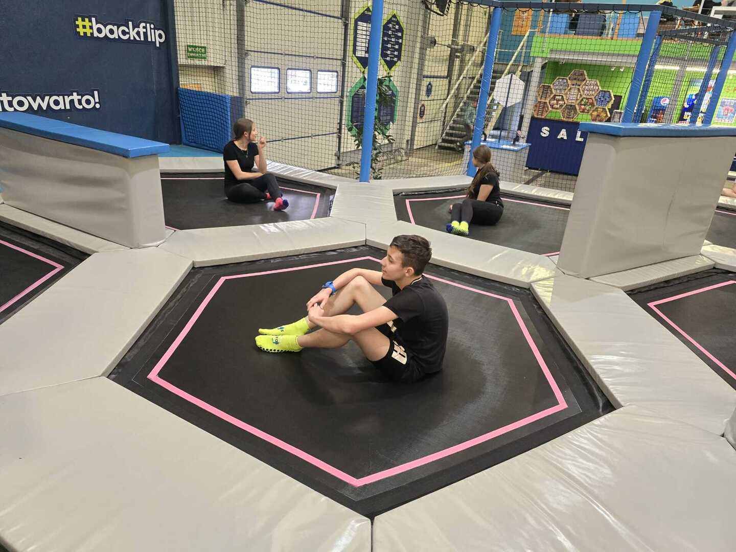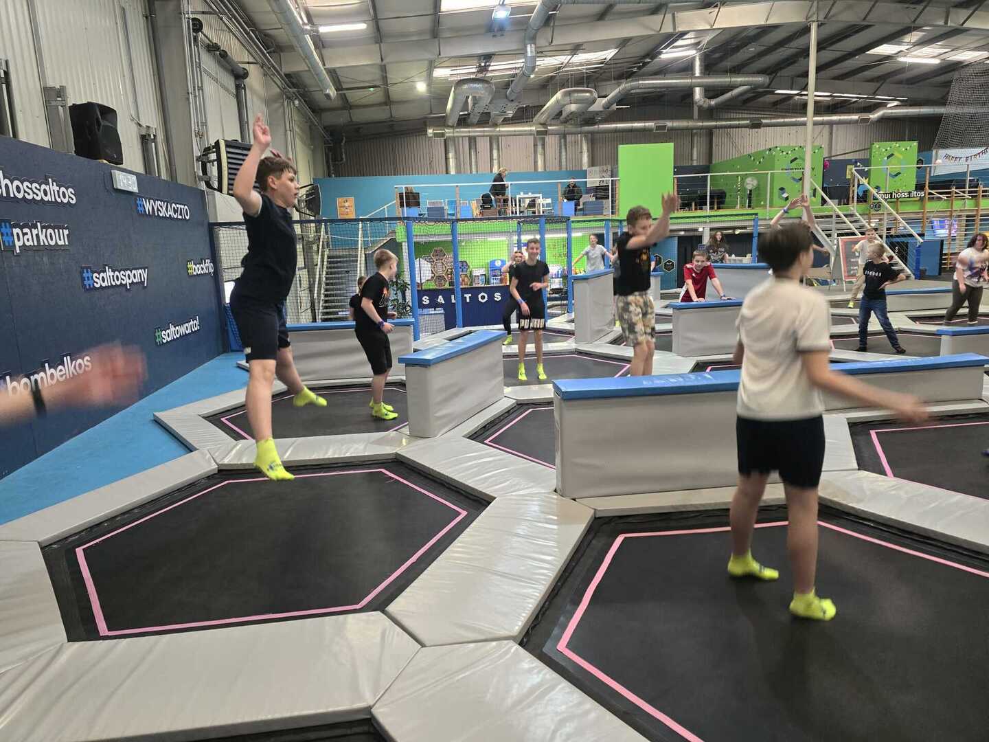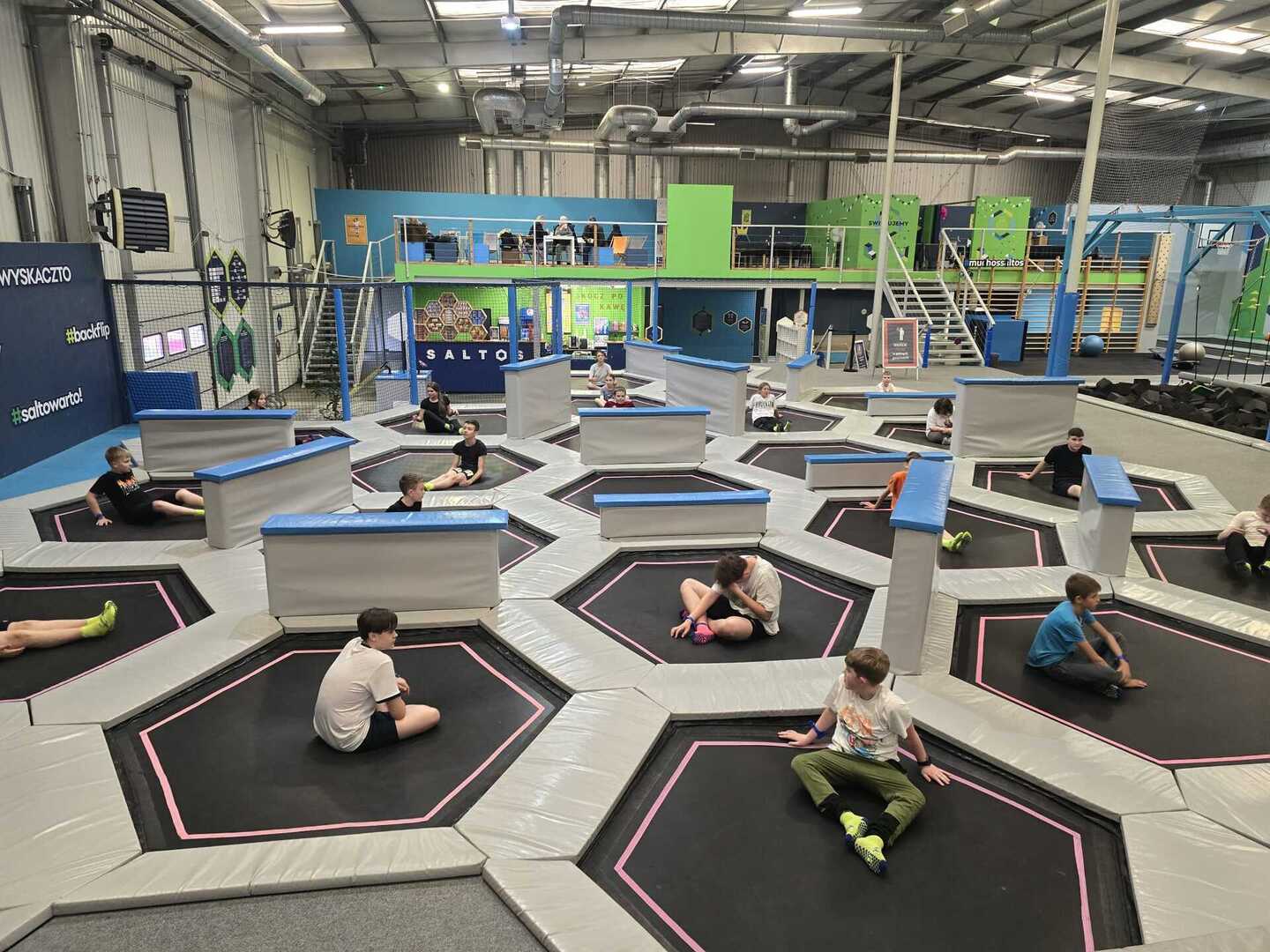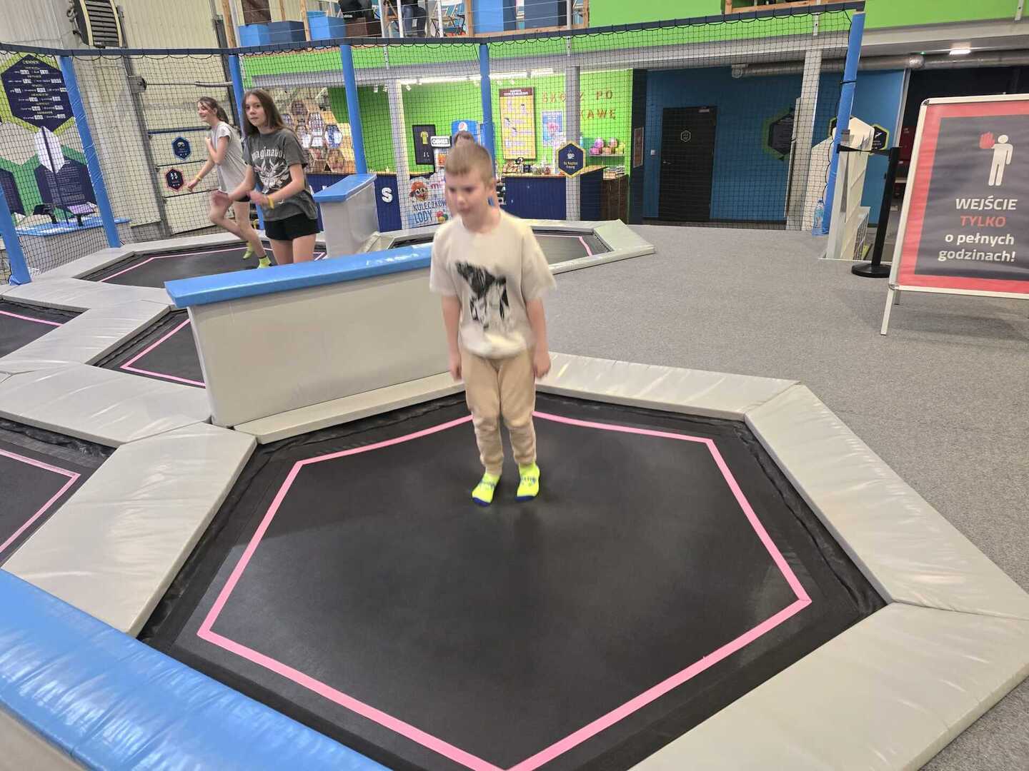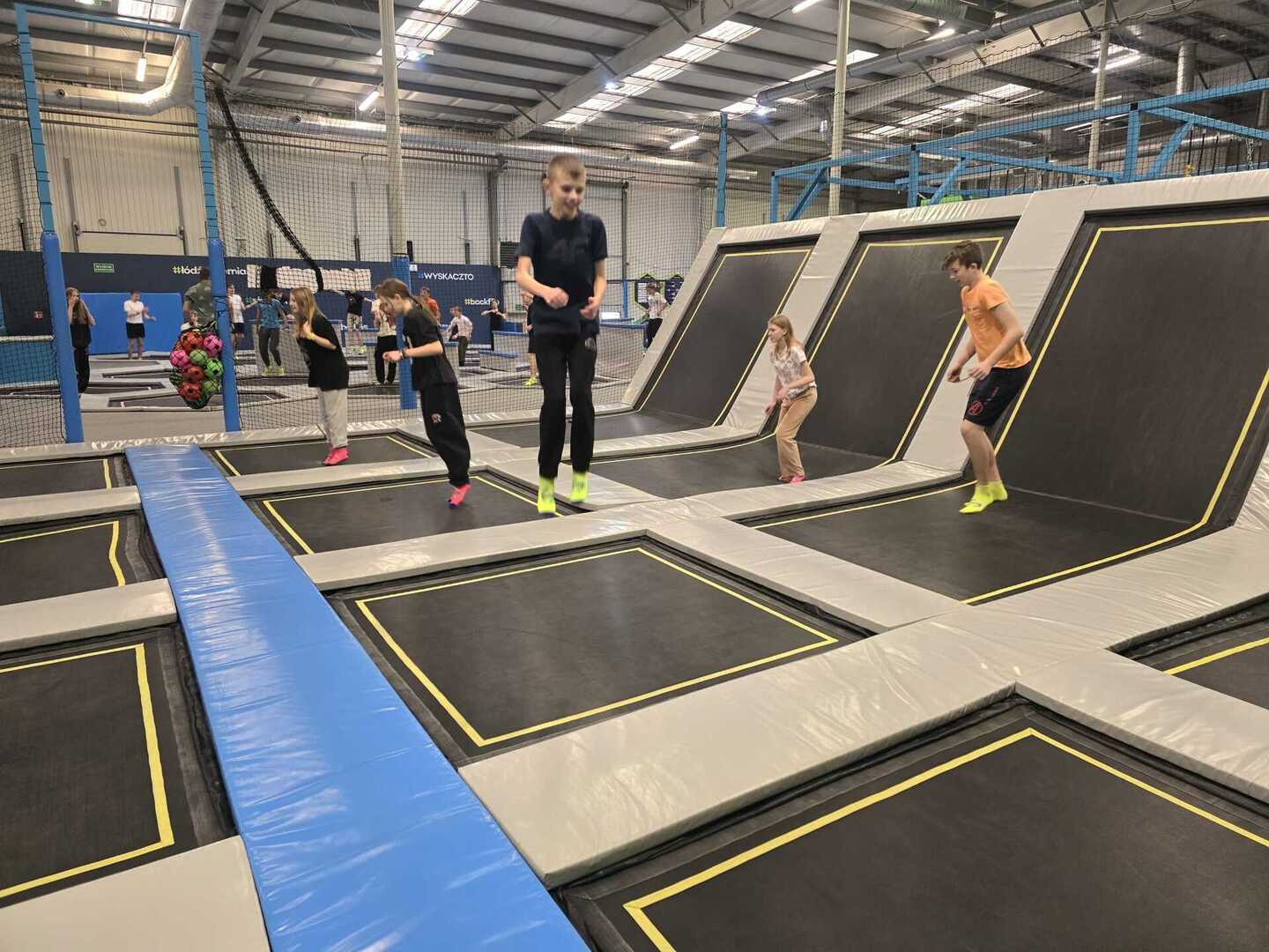 Kolejnym celem wycieczki był pobyt w parku trampolin z matami gimnastycznymi i basenem z gąbkami. Najpierw uczniowie przeszli szkolenie z zakresu bezpieczeństwa i techniki skoków. Następnie po profesjonalnej rozgrzewce pod okiem instruktorów korzystali z szeregu atrakcji. Wszyscy z radością skakali na różne sposoby. Dużym zainteresowaniem cieszyły się skoki do basenu z gąbkami.
