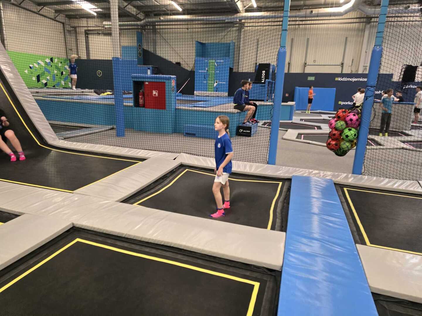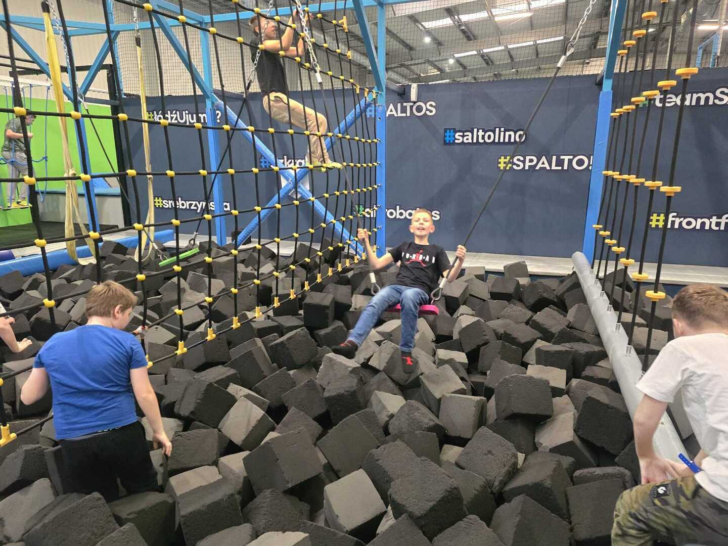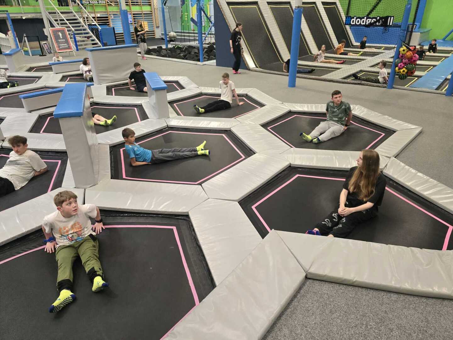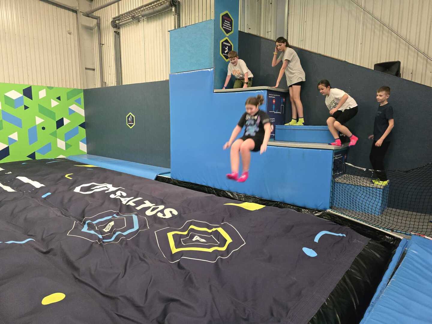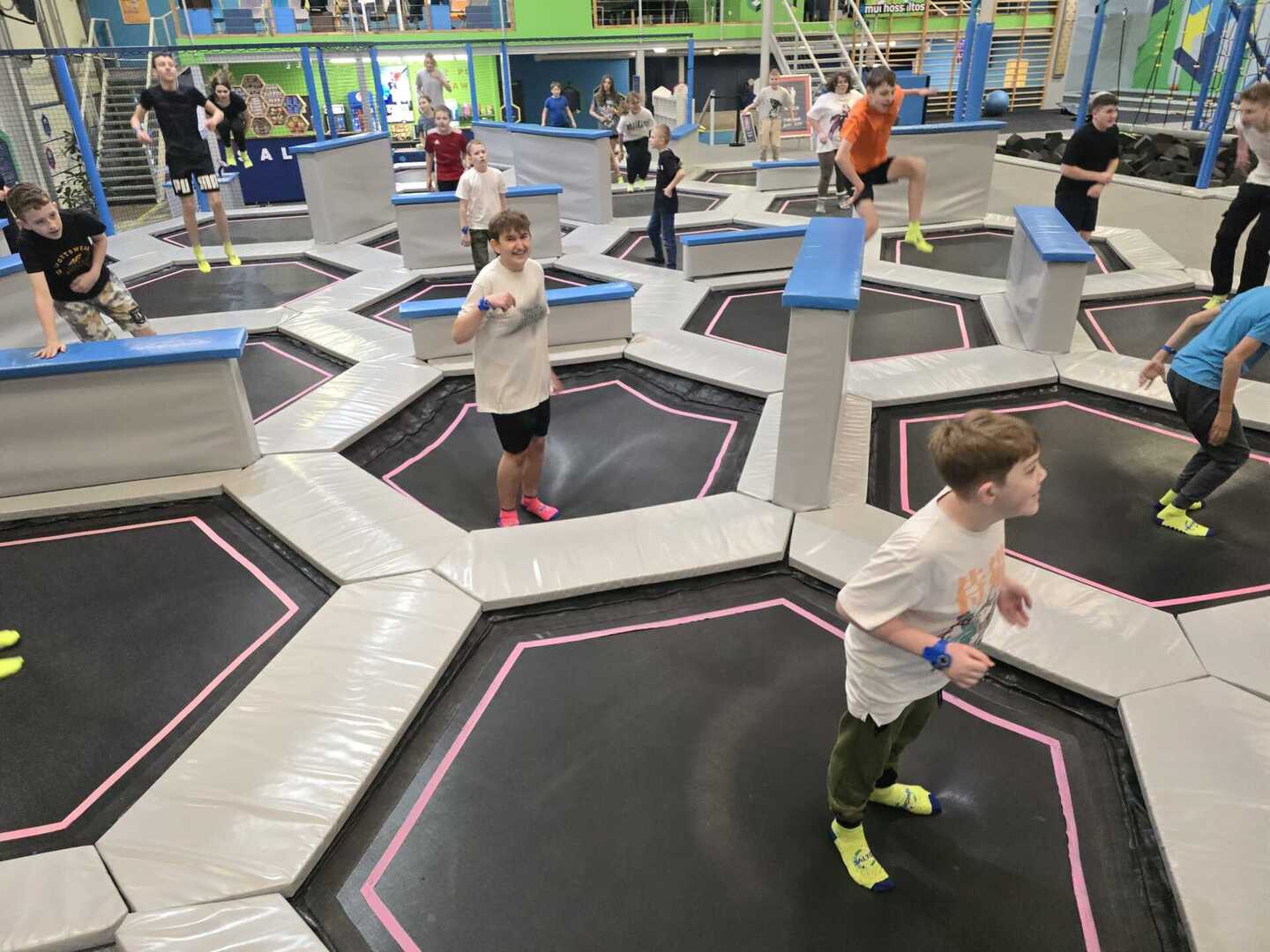 Kolejnym celem wycieczki był pobyt w parku trampolin z matami gimnastycznymi i basenem z gąbkami. Najpierw uczniowie przeszli szkolenie z zakresu bezpieczeństwa i techniki skoków. Następnie po profesjonalnej rozgrzewce pod okiem instruktorów korzystali z szeregu atrakcji. Wszyscy z radością skakali na różne sposoby. Dużym zainteresowaniem cieszyły się skoki do basenu z gąbkami.