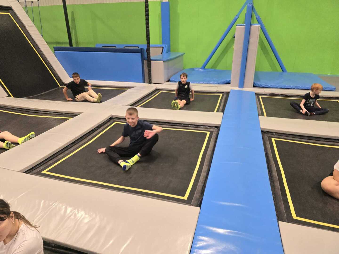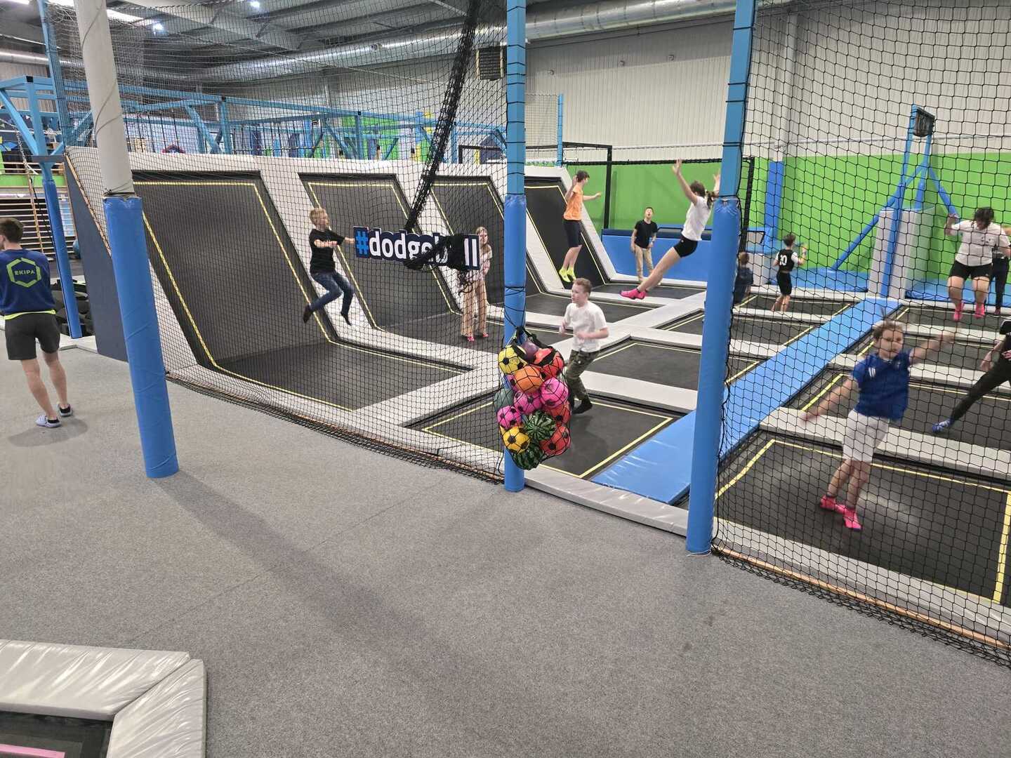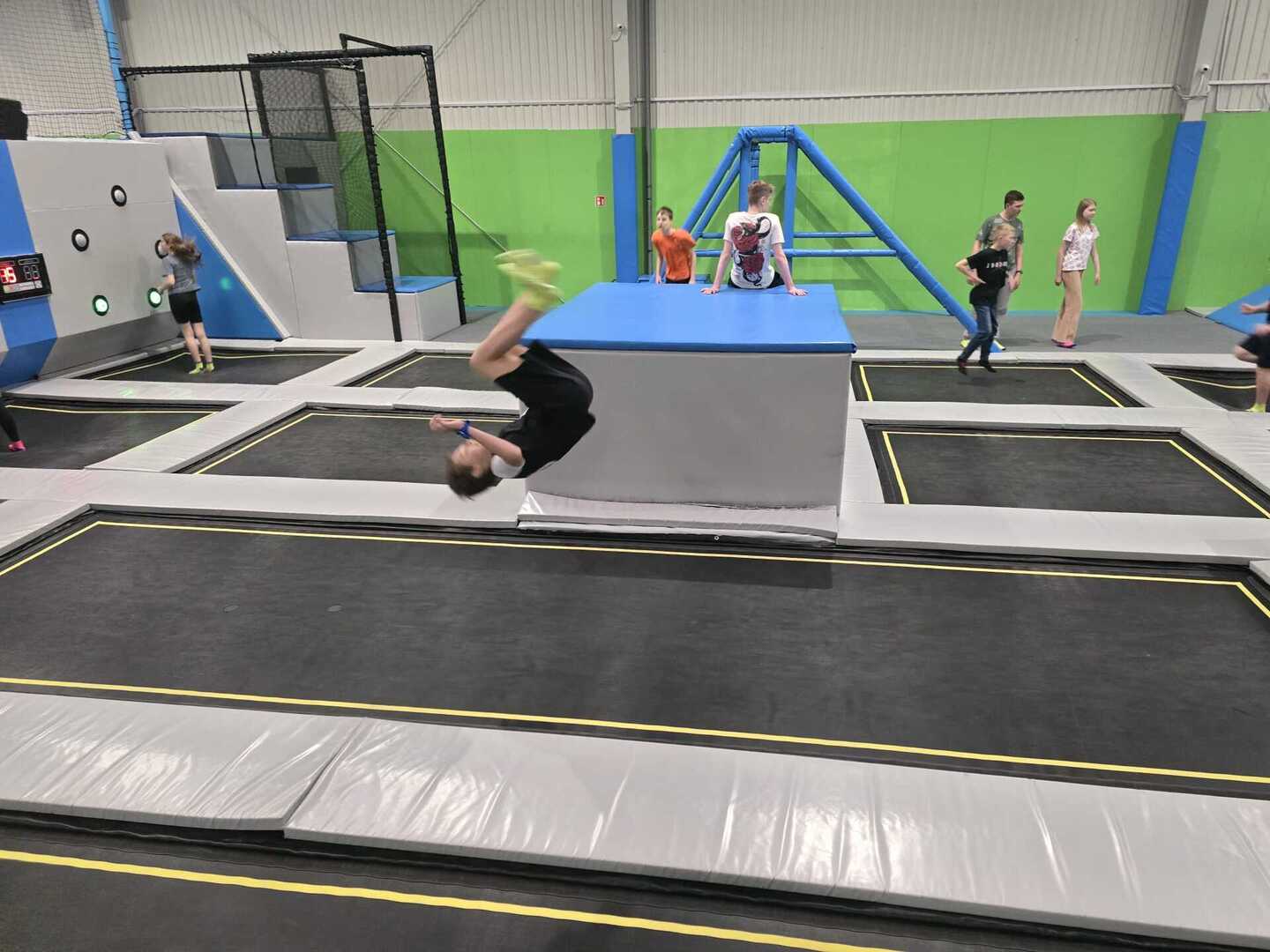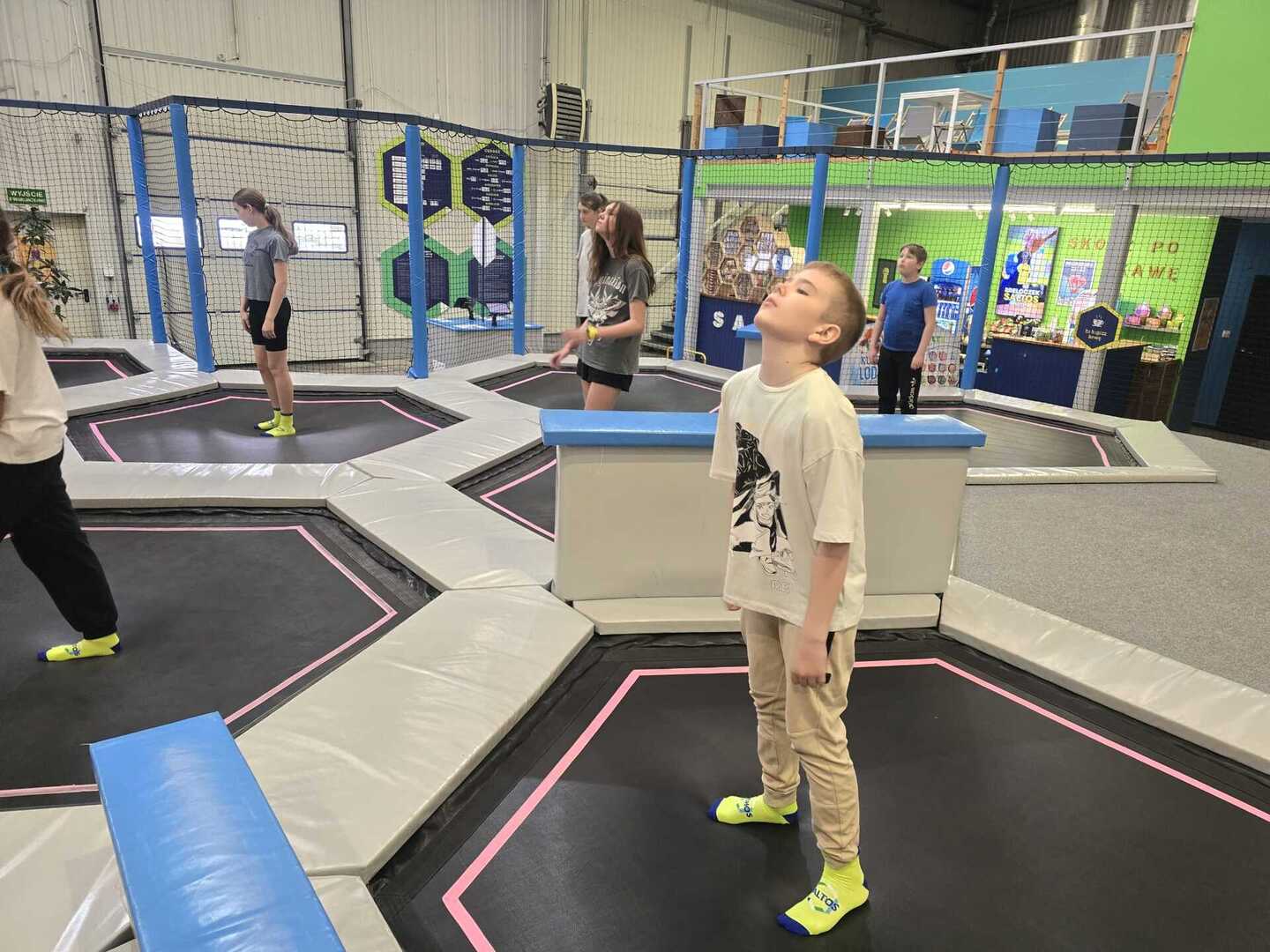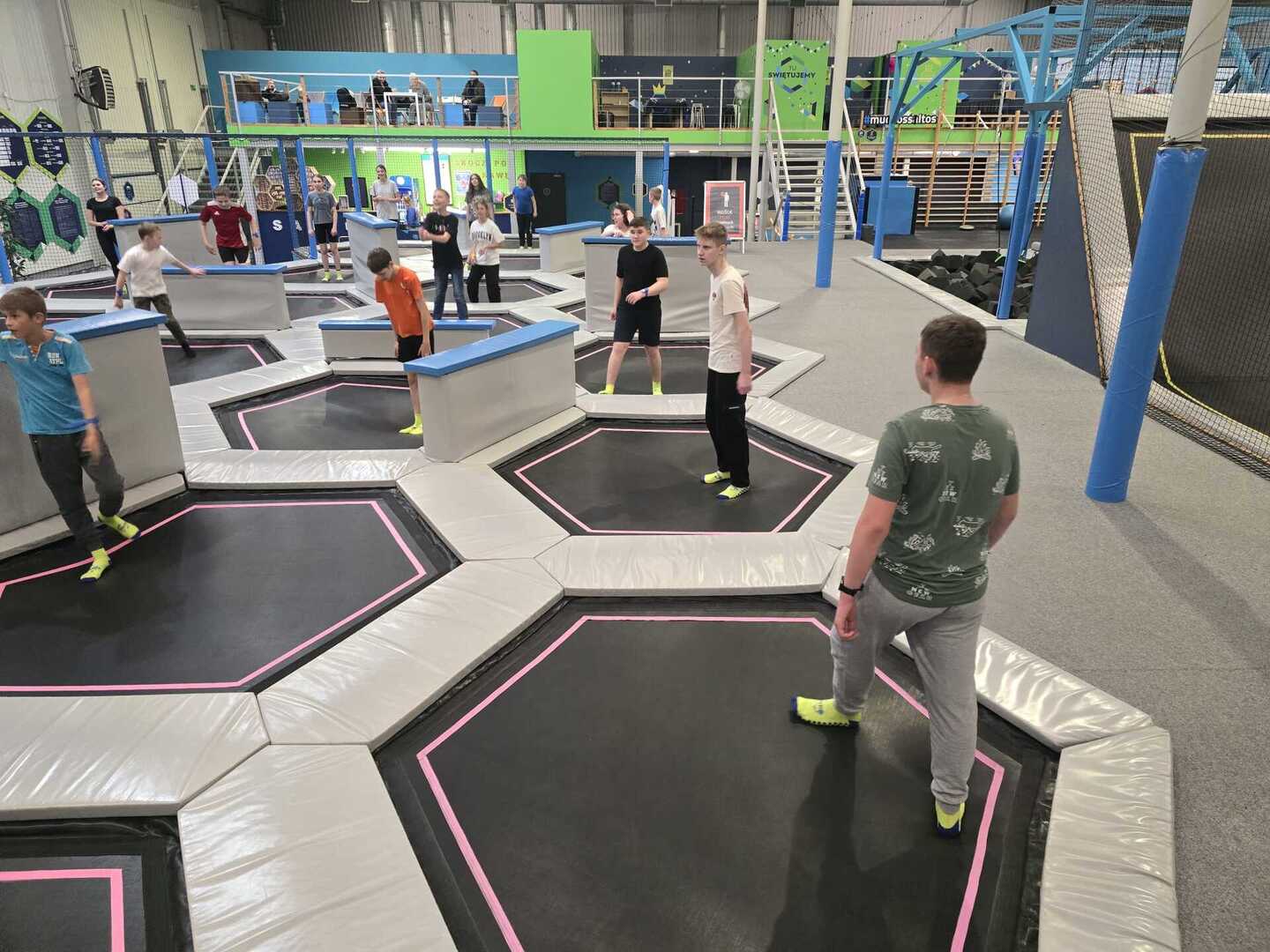 Kolejnym celem wycieczki był pobyt w parku trampolin z matami gimnastycznymi i basenem z gąbkami. Najpierw uczniowie przeszli szkolenie z zakresu bezpieczeństwa i techniki skoków. Następnie po profesjonalnej rozgrzewce pod okiem instruktorów korzystali z szeregu atrakcji. Wszyscy z radością skakali na różne sposoby. Dużym zainteresowaniem cieszyły się skoki do basenu z gąbkami.