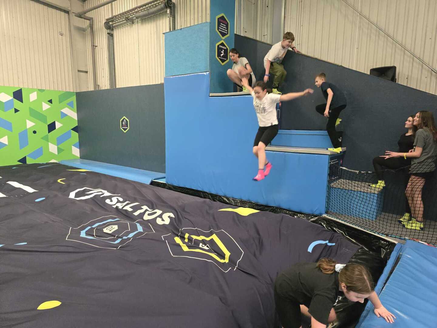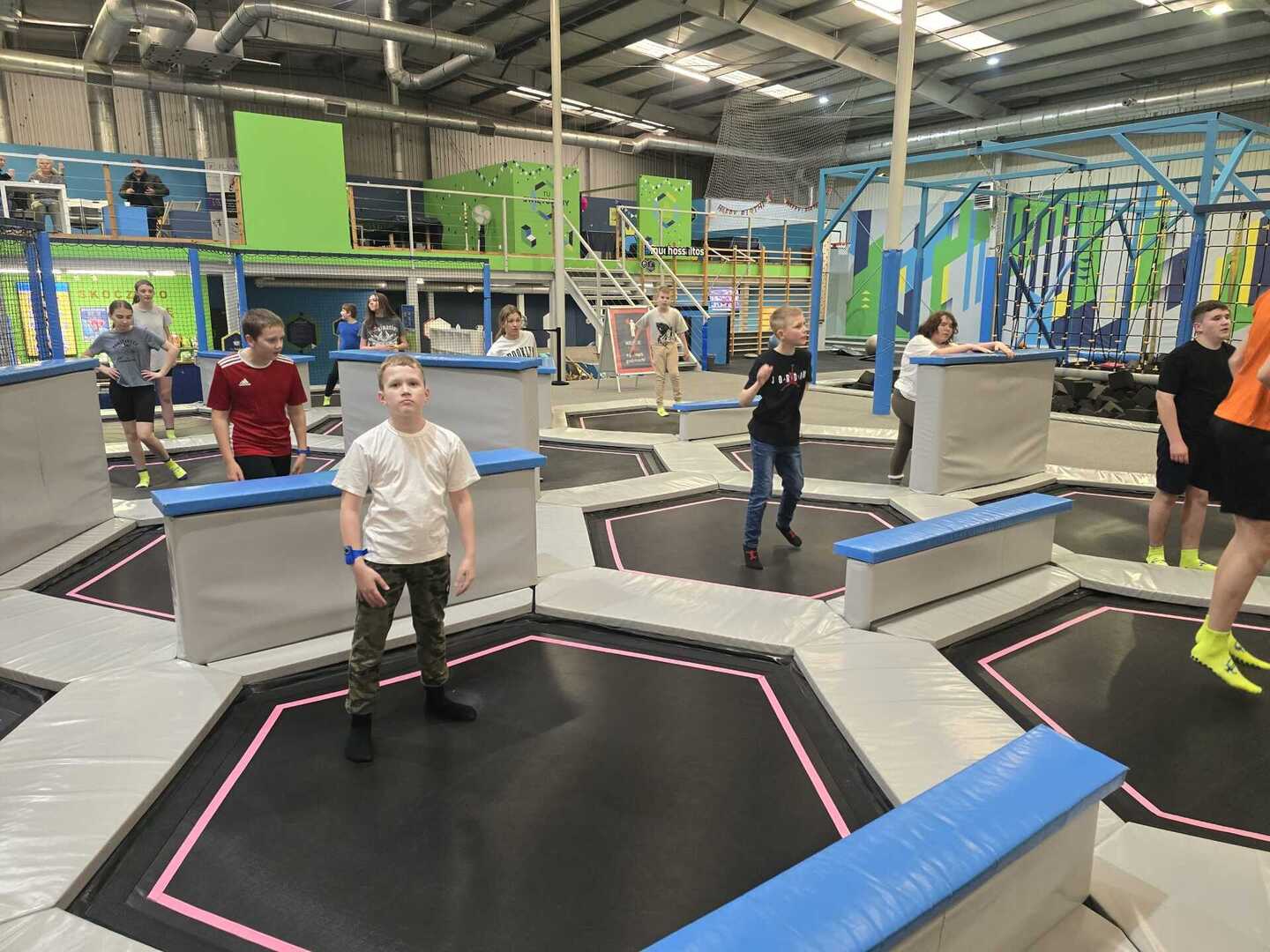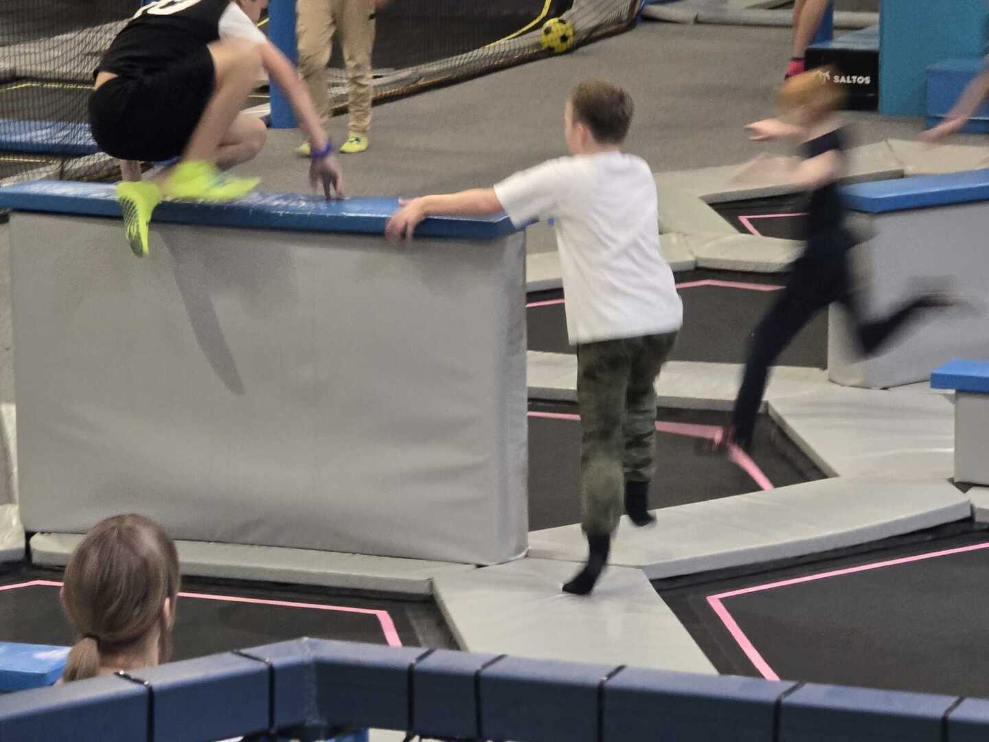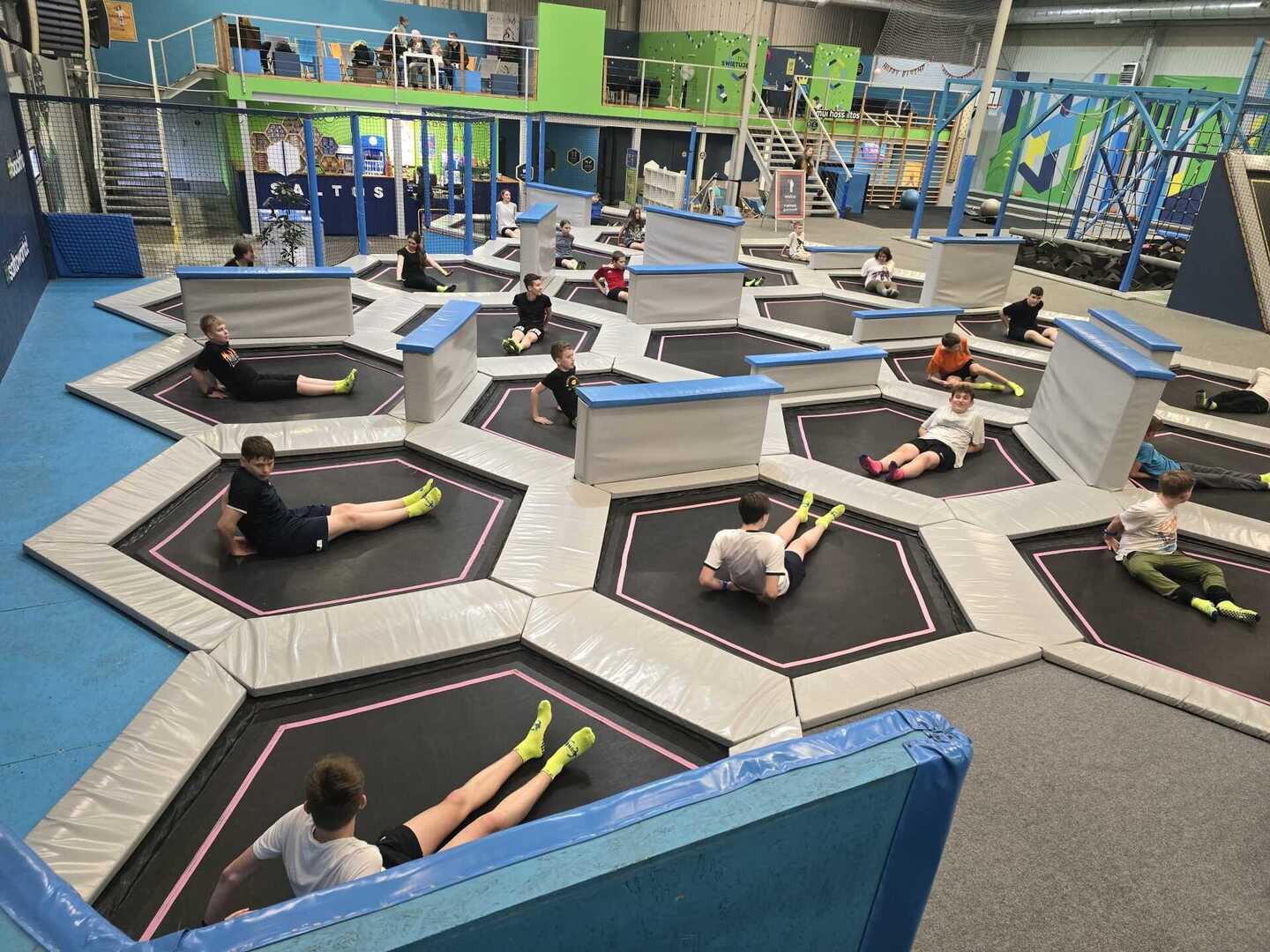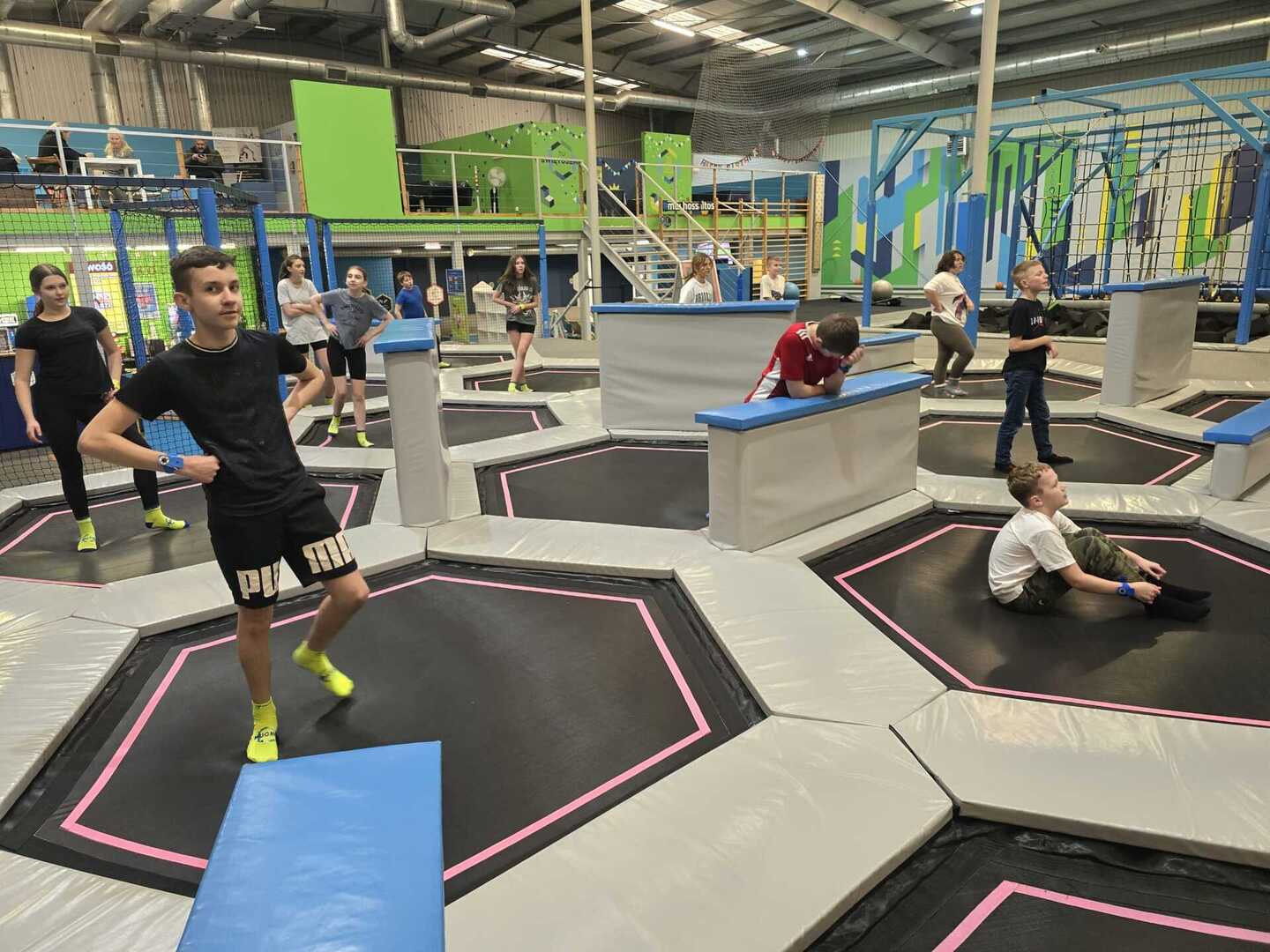 Kolejnym celem wycieczki był pobyt w parku trampolin z matami gimnastycznymi i basenem z gąbkami. Najpierw uczniowie przeszli szkolenie z zakresu bezpieczeństwa i techniki skoków. Następnie po profesjonalnej rozgrzewce pod okiem instruktorów korzystali z szeregu atrakcji. Wszyscy z radością skakali na różne sposoby. Dużym zainteresowaniem cieszyły się skoki do basenu z gąbkami.