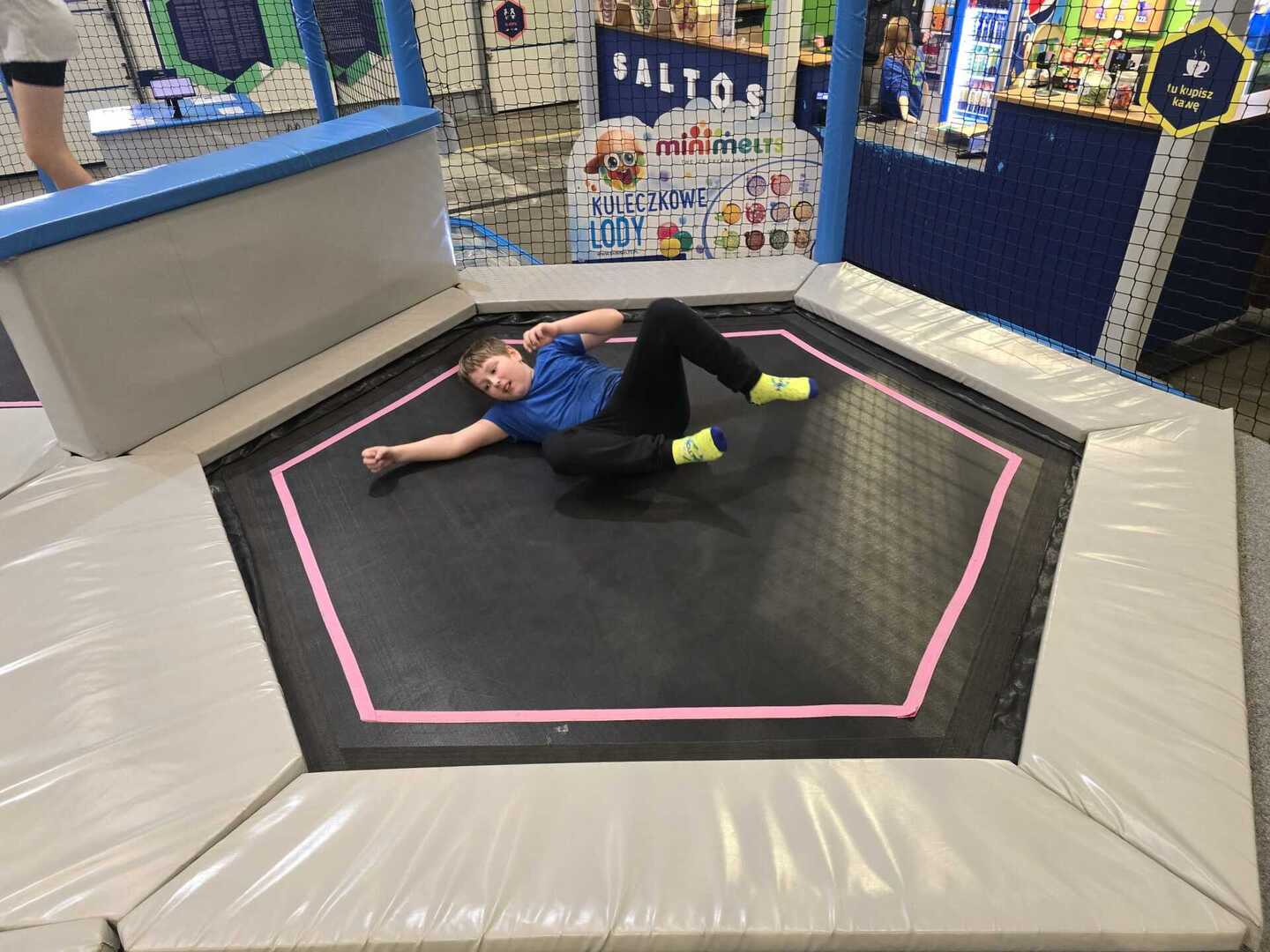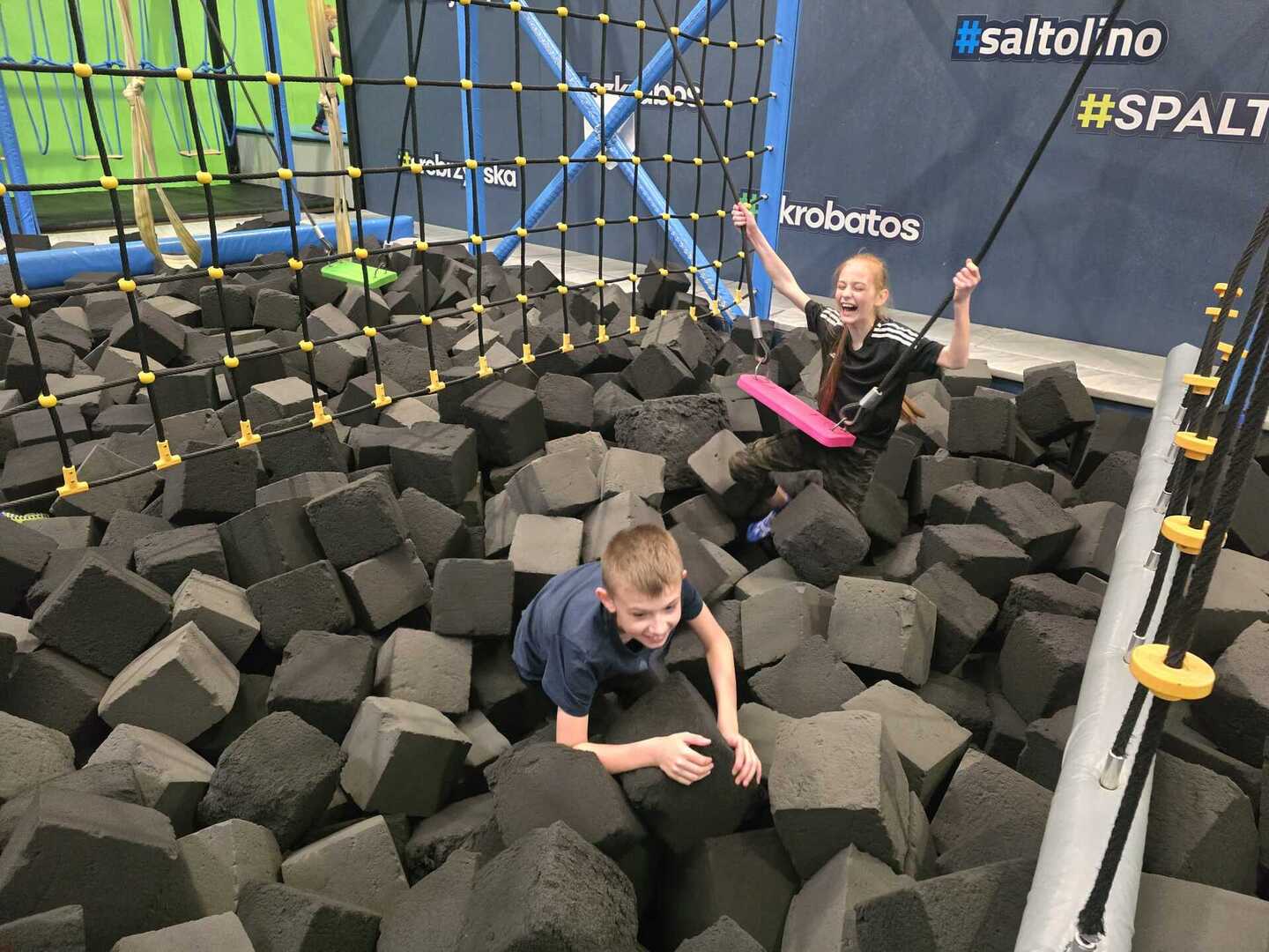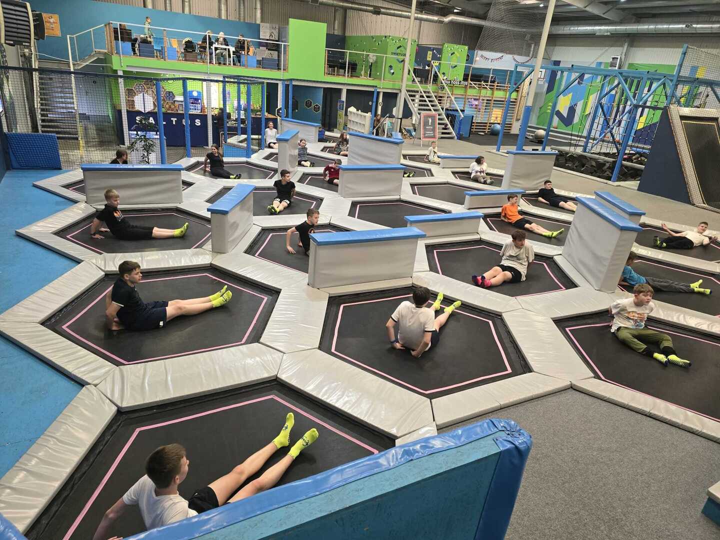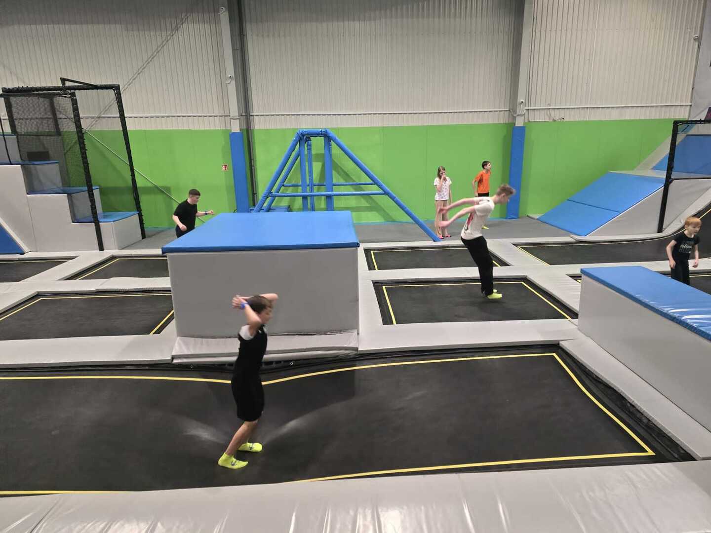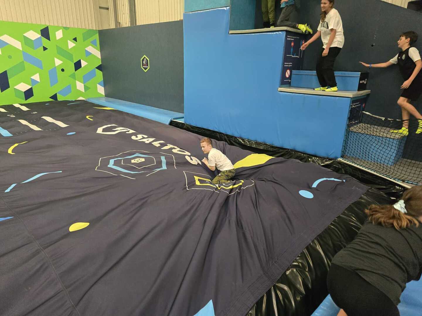 Kolejnym celem wycieczki był pobyt w parku trampolin z matami gimnastycznymi i basenem z gąbkami. Najpierw uczniowie przeszli szkolenie z zakresu bezpieczeństwa i techniki skoków. Następnie po profesjonalnej rozgrzewce pod okiem instruktorów korzystali z szeregu atrakcji. Wszyscy z radością skakali na różne sposoby. Dużym zainteresowaniem cieszyły się skoki do basenu z gąbkami.
