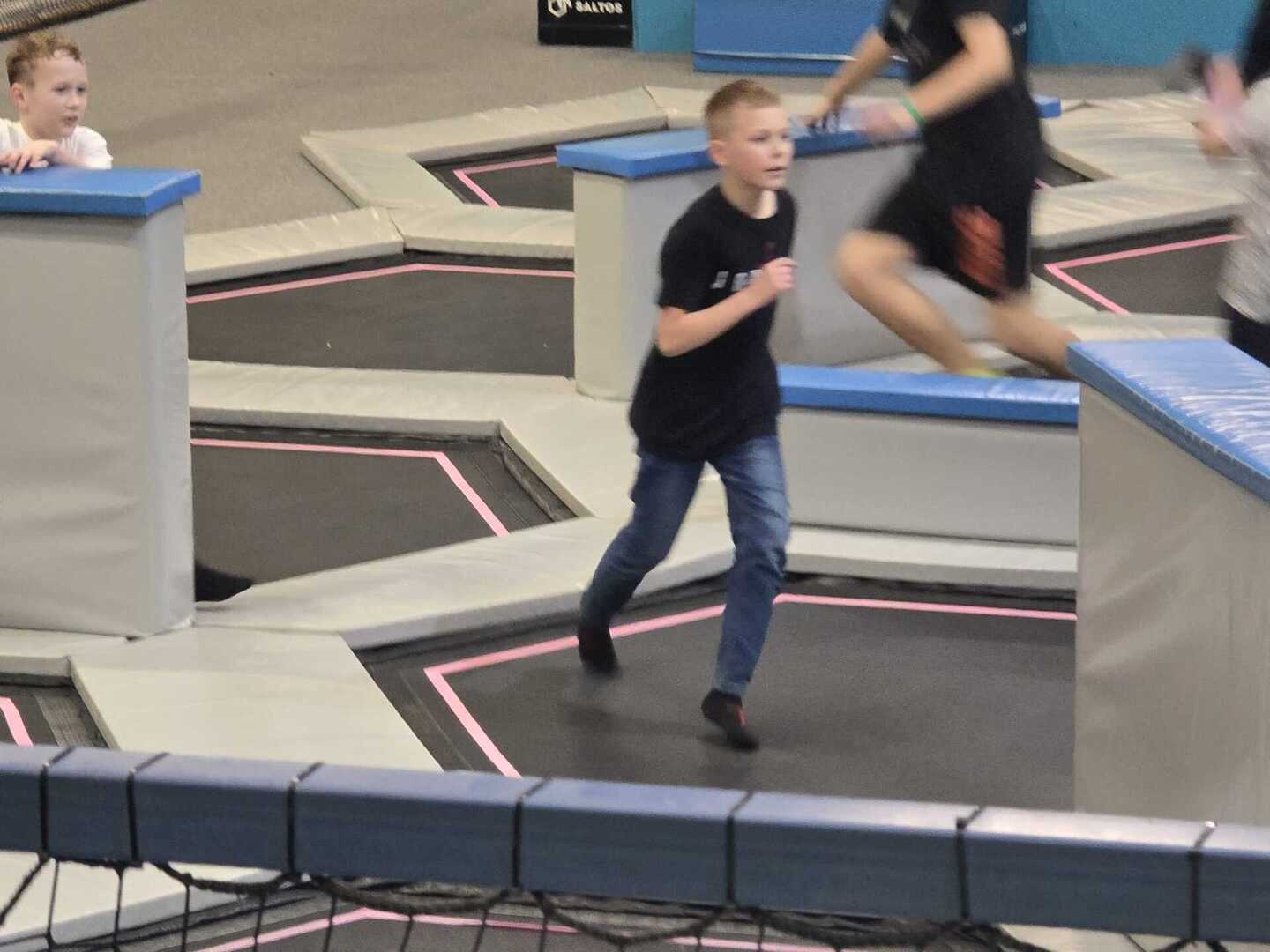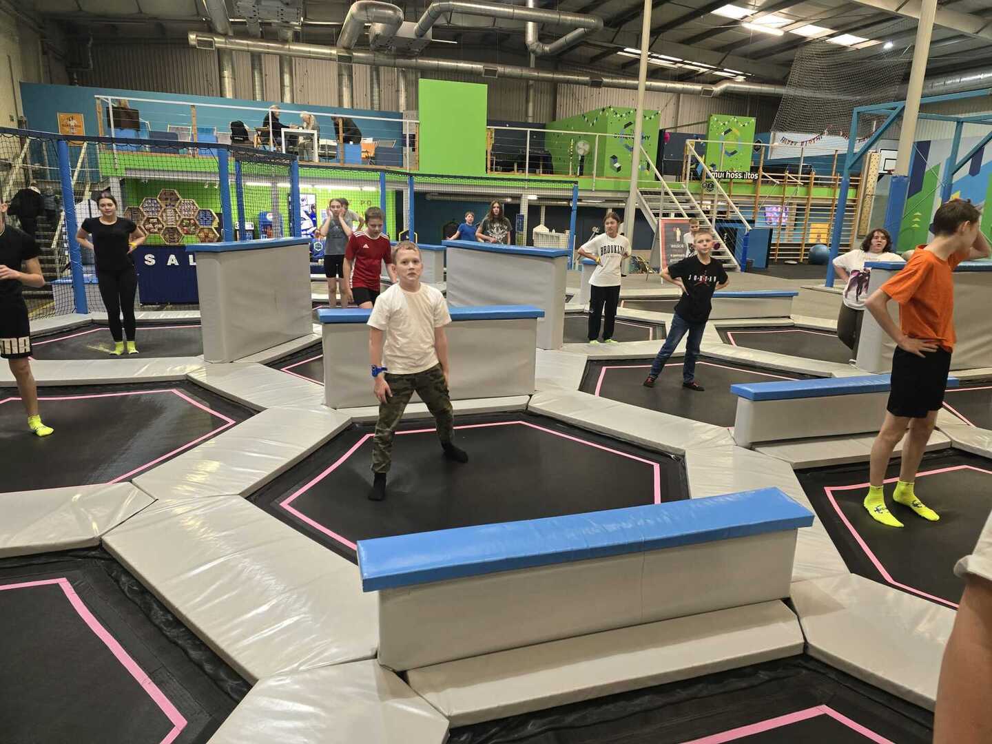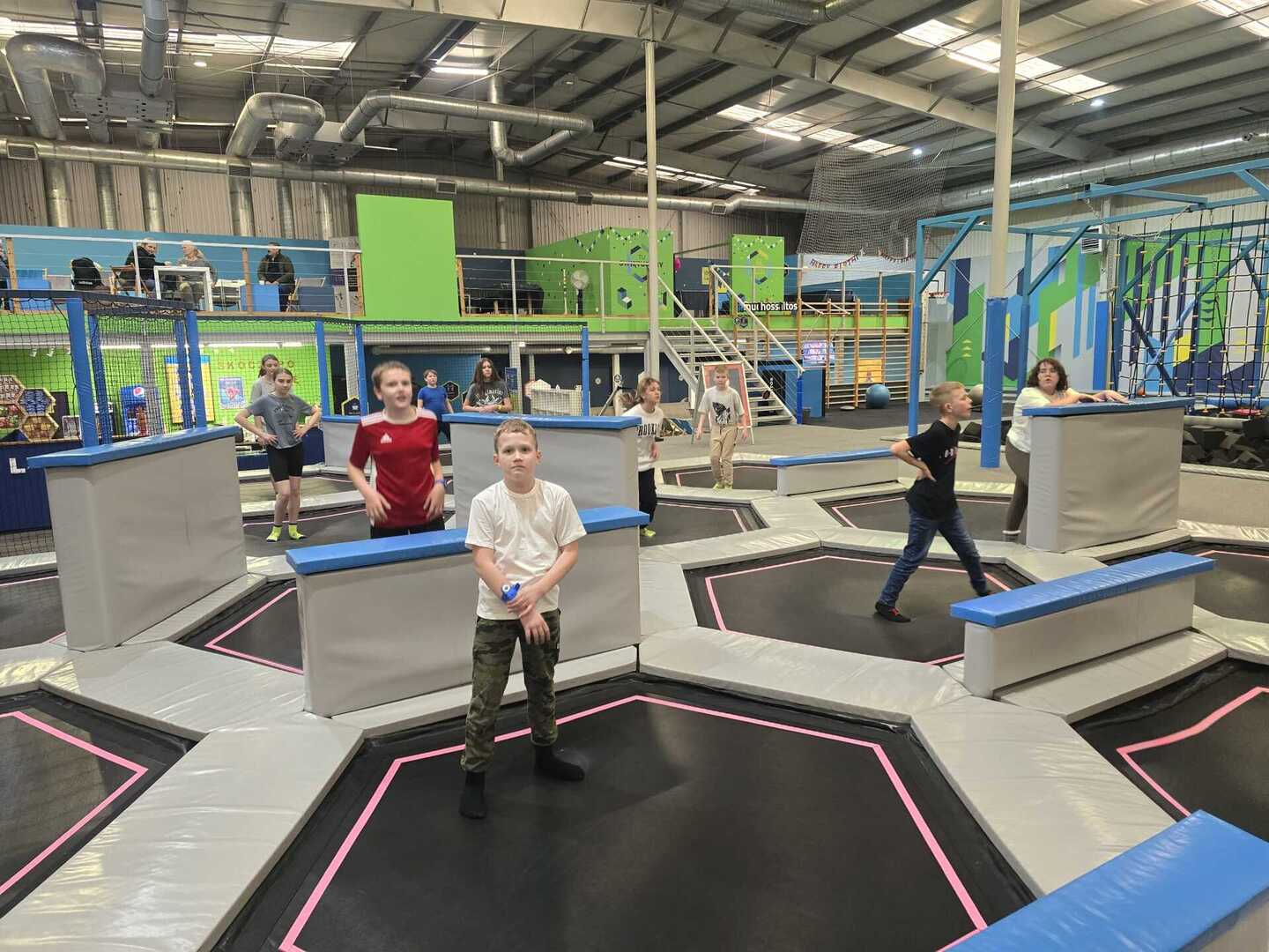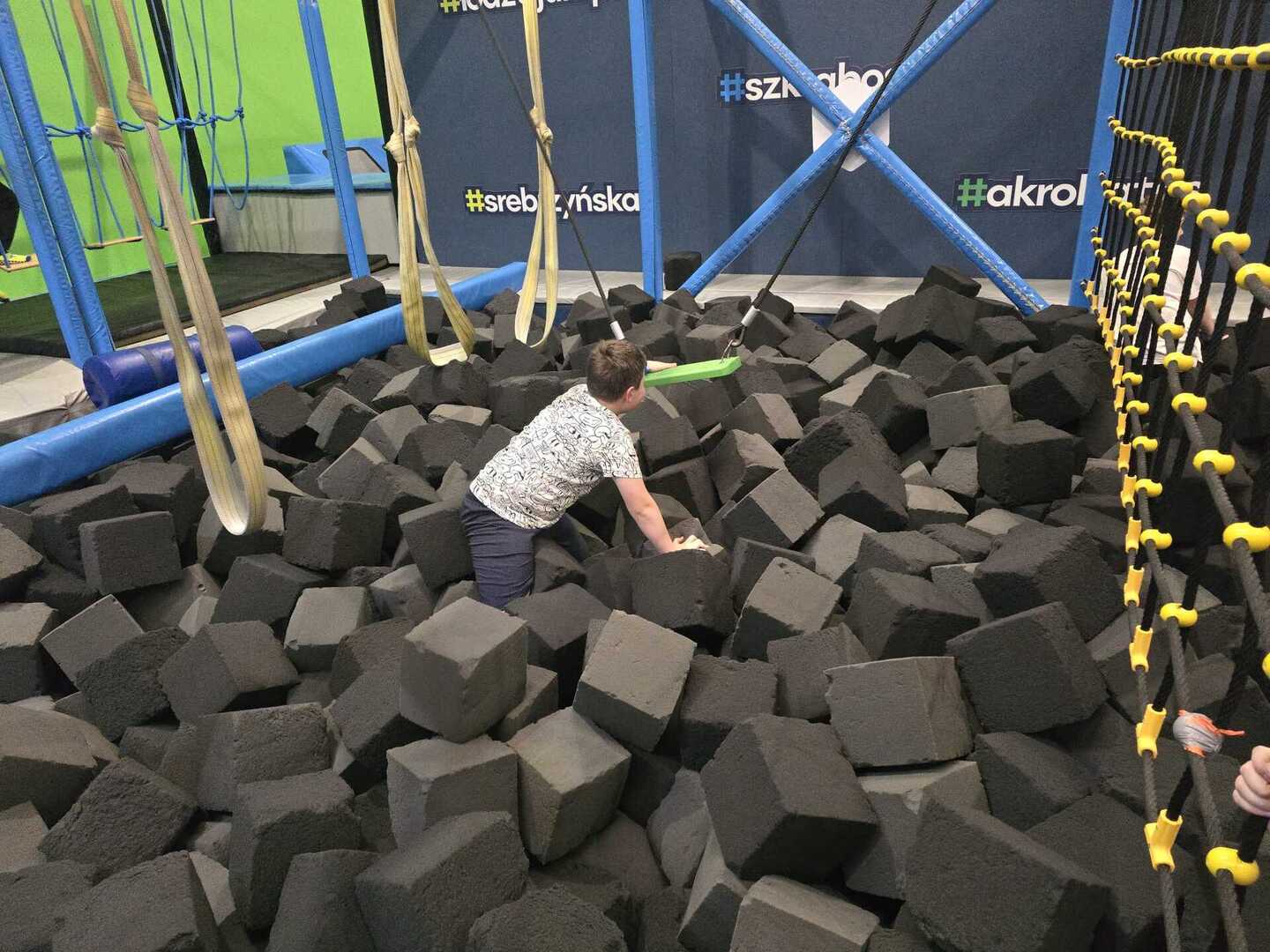 Kolejnym celem wycieczki był pobyt w parku trampolin z matami gimnastycznymi i basenem z gąbkami. Najpierw uczniowie przeszli szkolenie z zakresu bezpieczeństwa i techniki skoków. Następnie po profesjonalnej rozgrzewce pod okiem instruktorów korzystali z szeregu atrakcji. Wszyscy z radością skakali na różne sposoby. Dużym zainteresowaniem cieszyły się skoki do basenu z gąbkami.