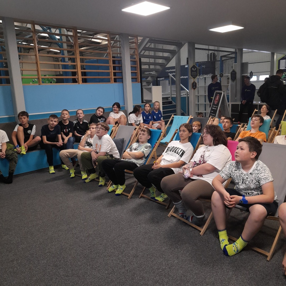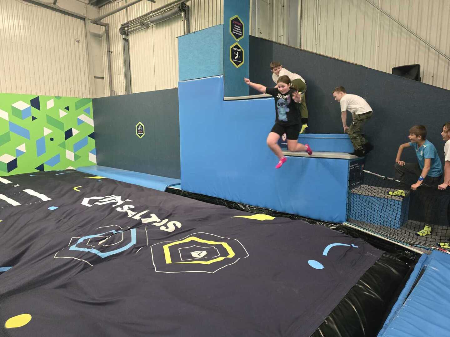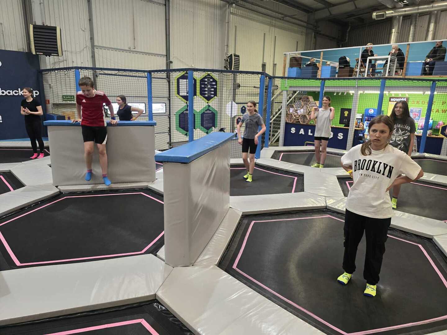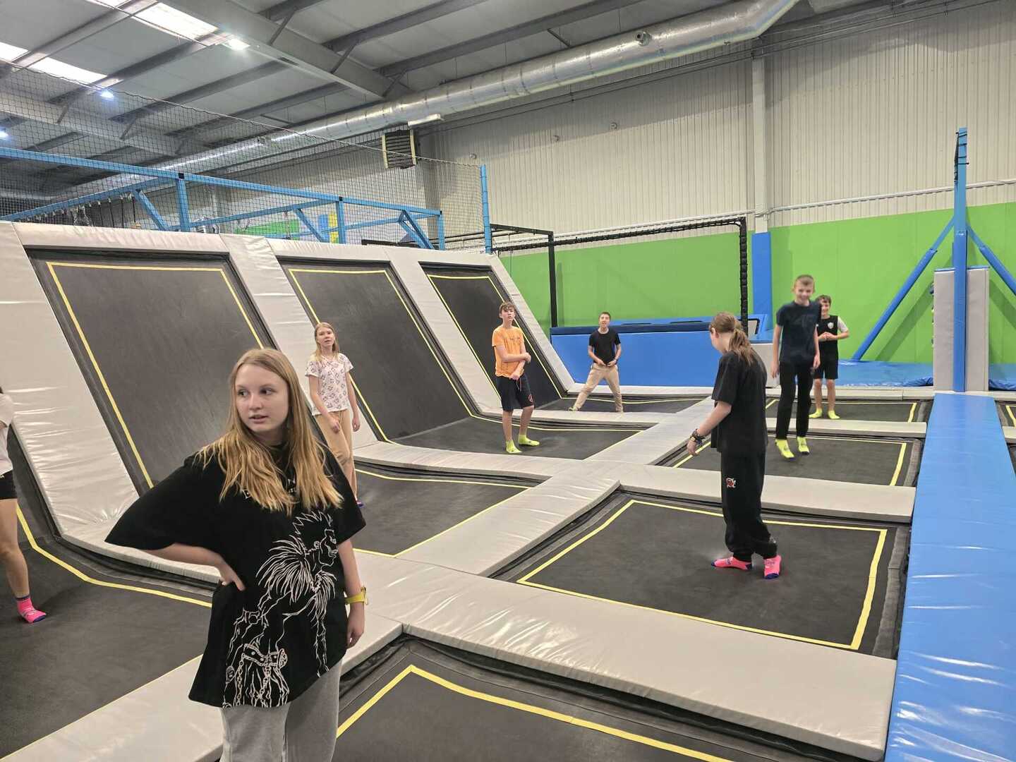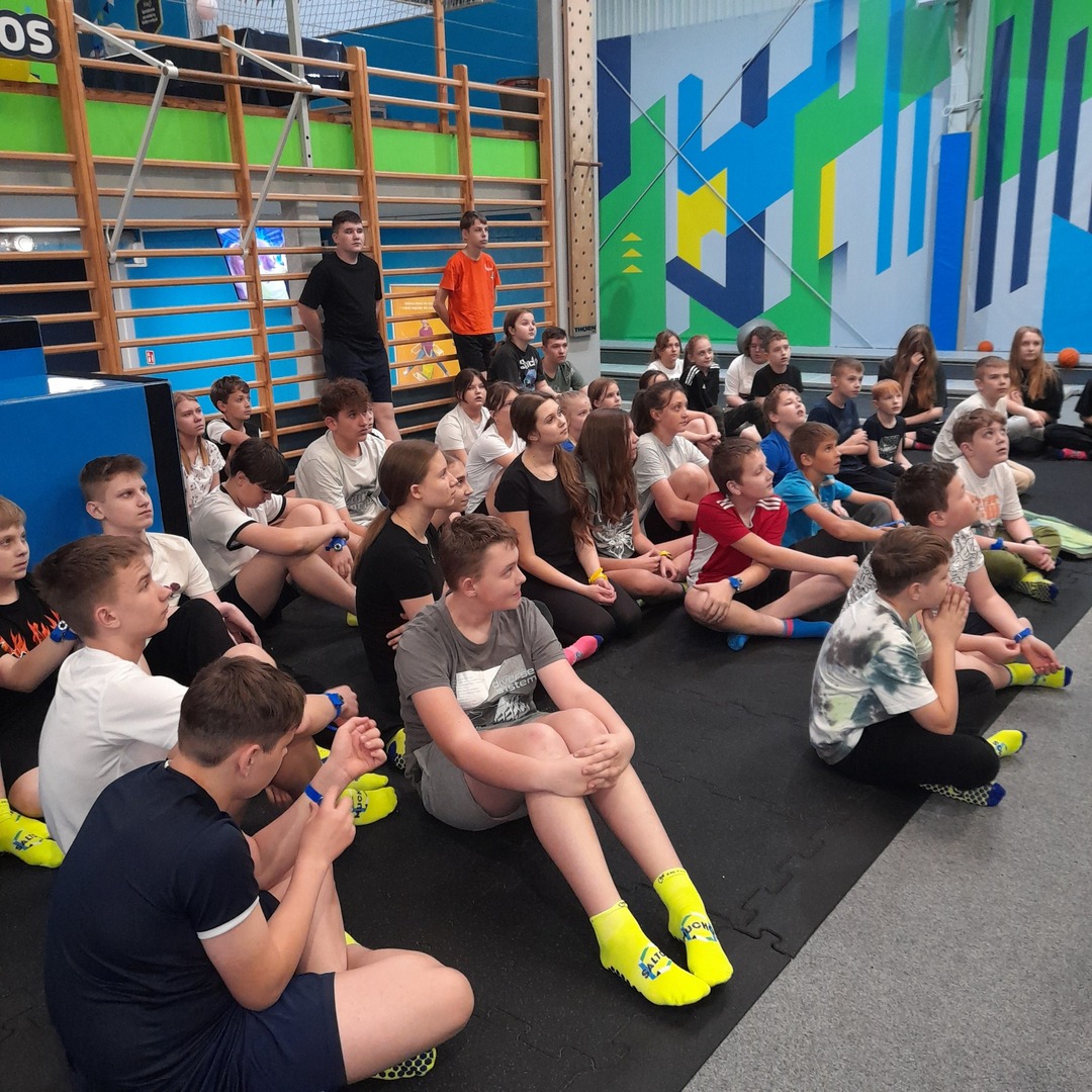 Kolejnym celem wycieczki był pobyt w parku trampolin z matami gimnastycznymi i basenem z gąbkami. Najpierw uczniowie przeszli szkolenie z zakresu bezpieczeństwa i techniki skoków. Następnie po profesjonalnej rozgrzewce pod okiem instruktorów korzystali z szeregu atrakcji. Wszyscy z radością skakali na różne sposoby. Dużym zainteresowaniem cieszyły się skoki do basenu z gąbkami.