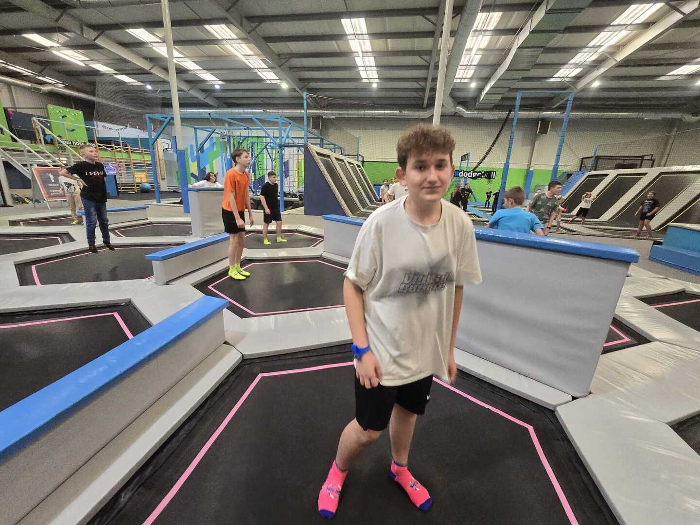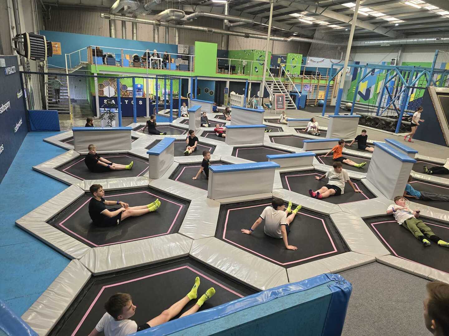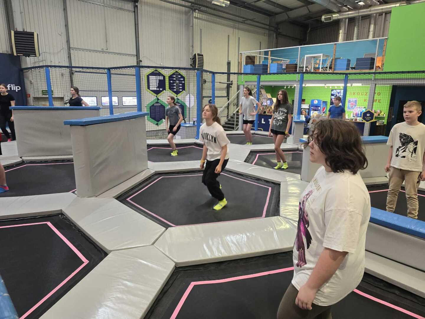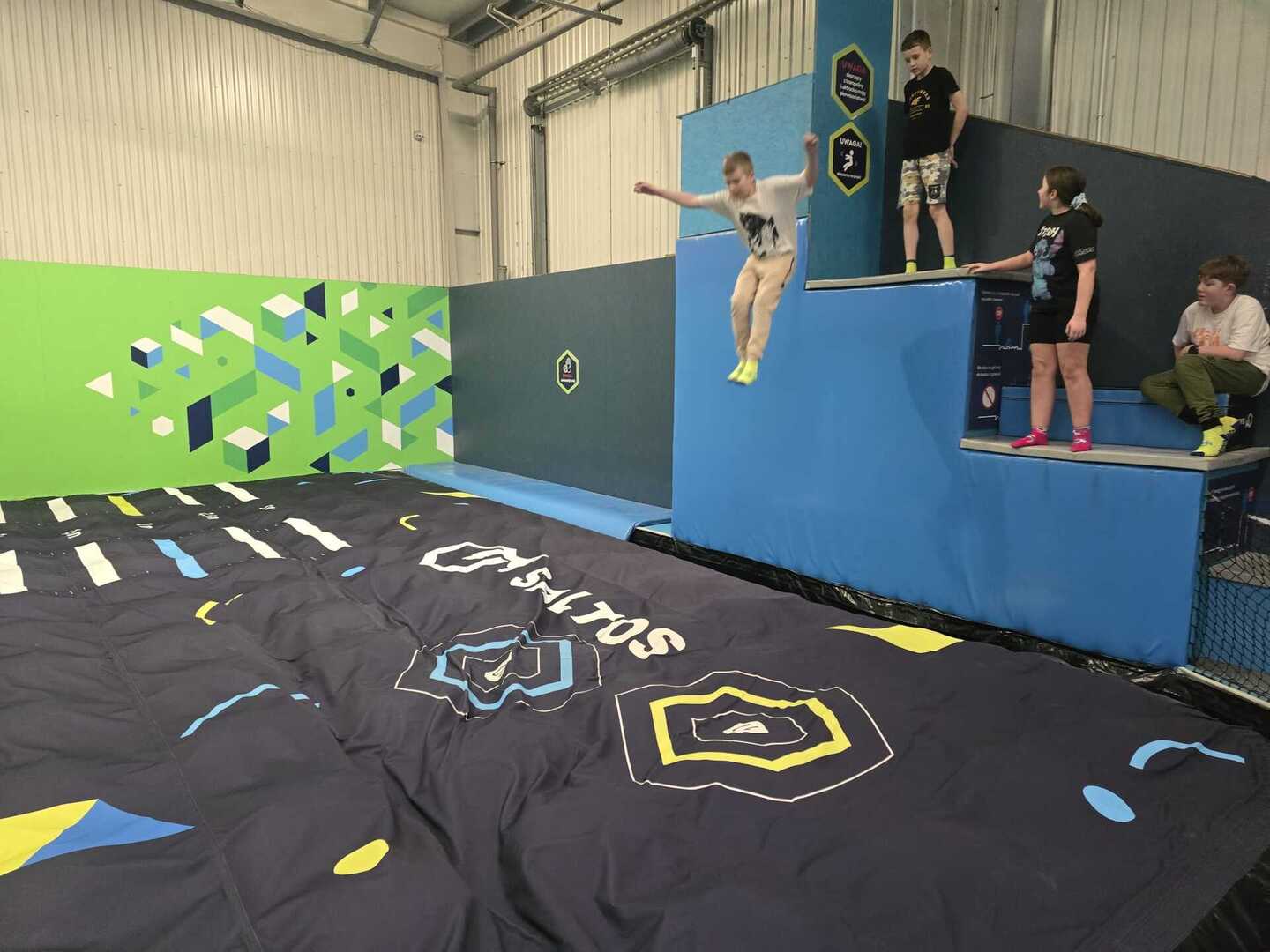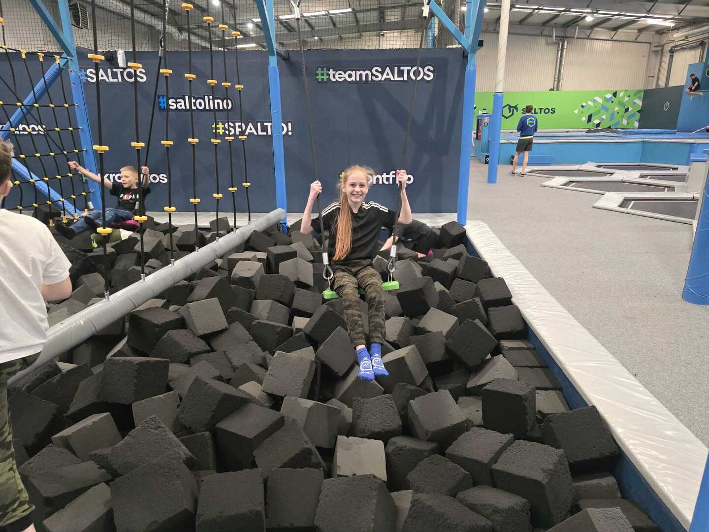 Kolejnym celem wycieczki był pobyt w parku trampolin z matami gimnastycznymi i basenem z gąbkami. Najpierw uczniowie przeszli szkolenie z zakresu bezpieczeństwa i techniki skoków. Następnie po profesjonalnej rozgrzewce pod okiem instruktorów korzystali z szeregu atrakcji. Wszyscy z radością skakali na różne sposoby. Dużym zainteresowaniem cieszyły się skoki do basenu z gąbkami.