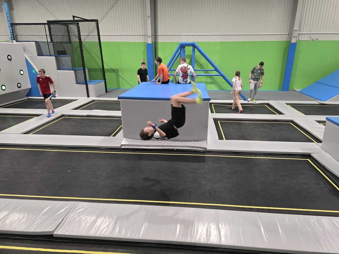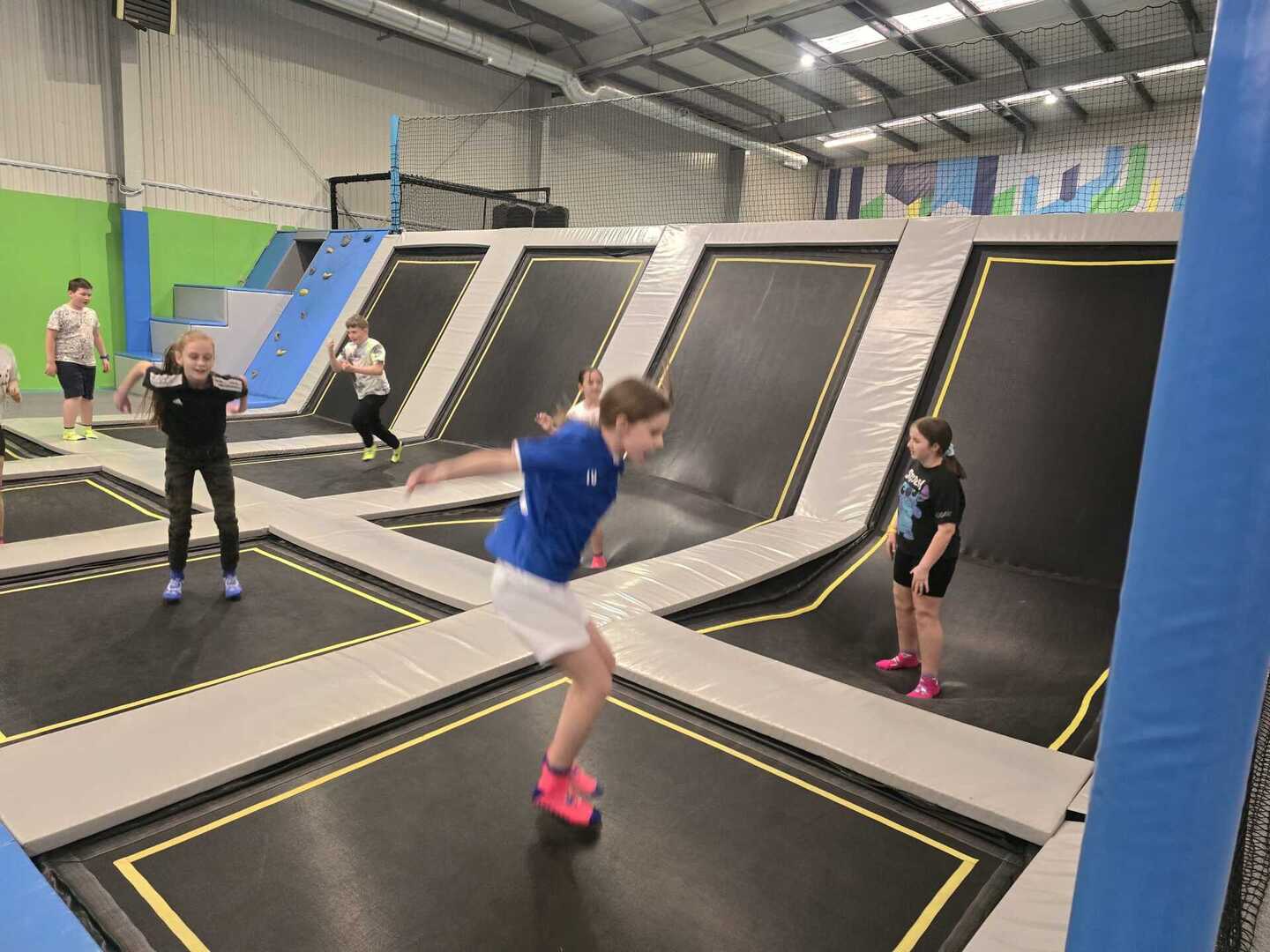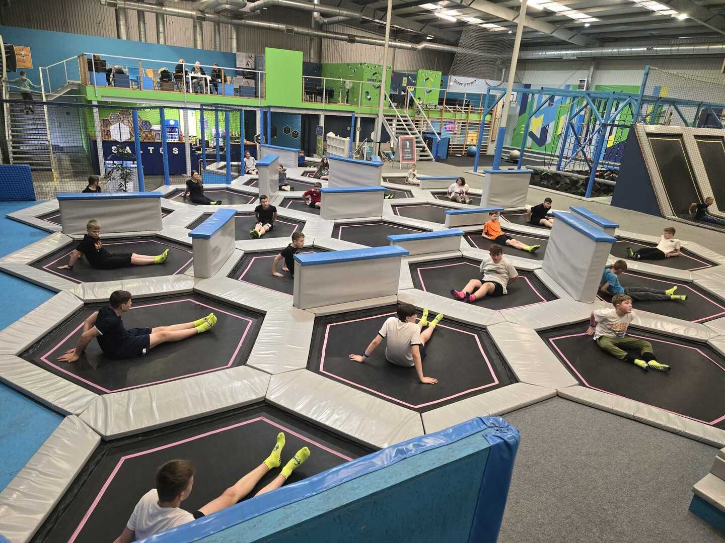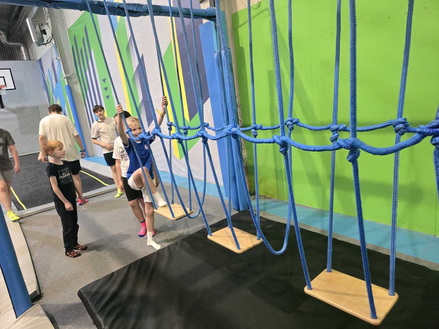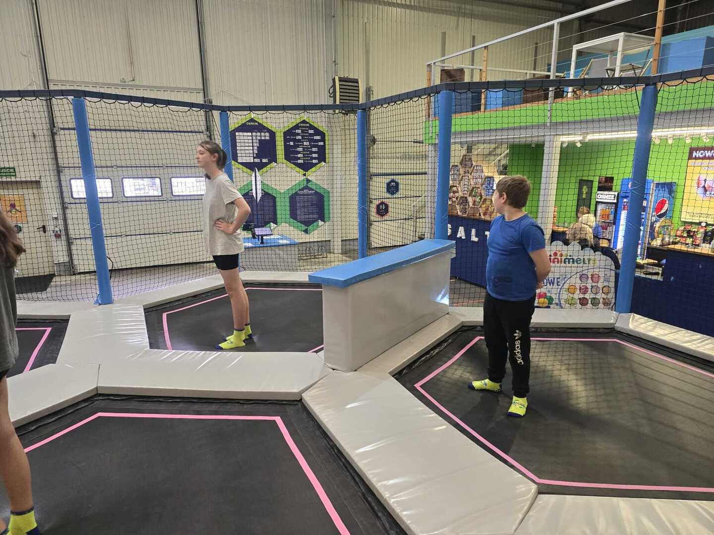 Kolejnym celem wycieczki był pobyt w parku trampolin z matami gimnastycznymi i basenem z gąbkami. Najpierw uczniowie przeszli szkolenie z zakresu bezpieczeństwa i techniki skoków. Następnie po profesjonalnej rozgrzewce pod okiem instruktorów korzystali z szeregu atrakcji. Wszyscy z radością skakali na różne sposoby. Dużym zainteresowaniem cieszyły się skoki do basenu z gąbkami.