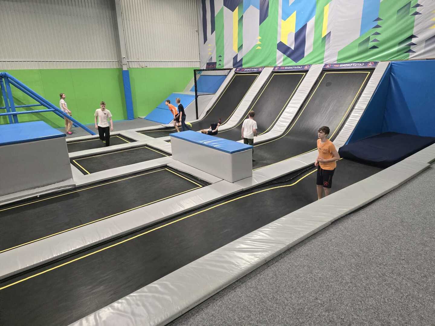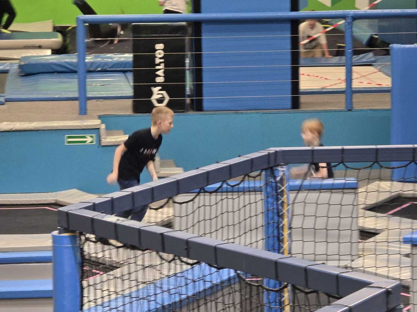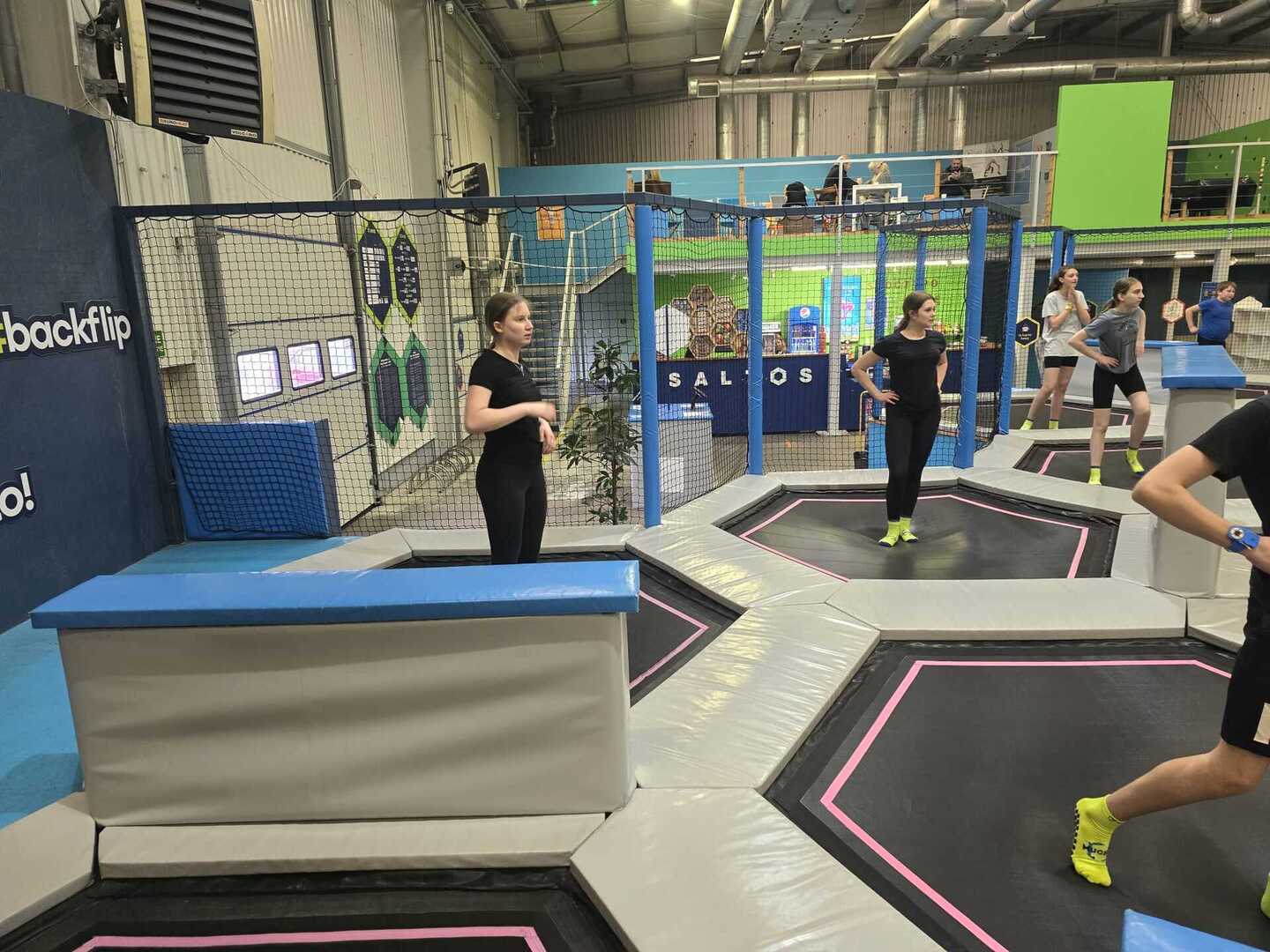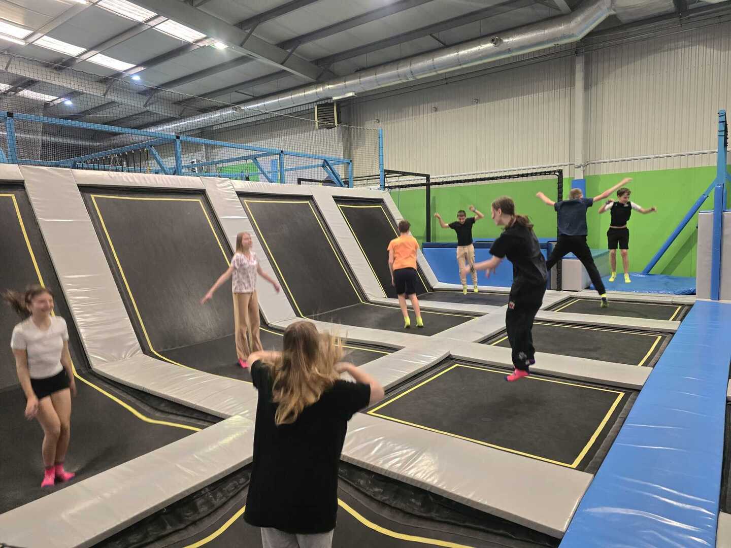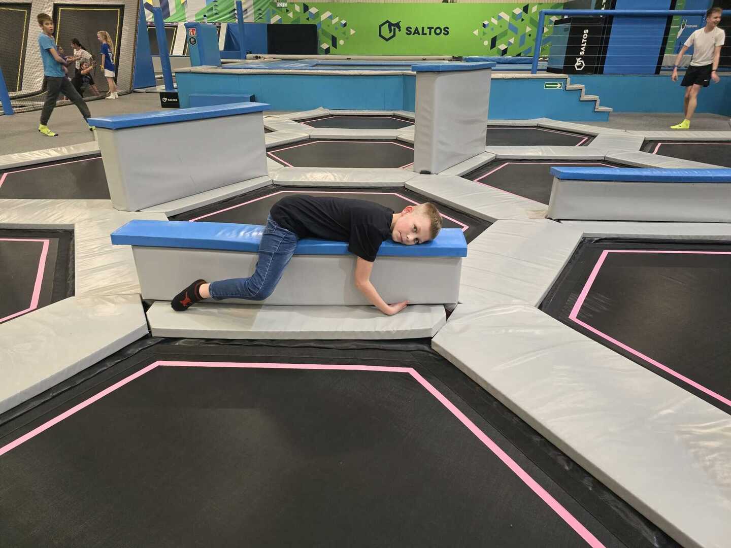 Kolejnym celem wycieczki był pobyt w parku trampolin z matami gimnastycznymi i basenem z gąbkami. Najpierw uczniowie przeszli szkolenie z zakresu bezpieczeństwa i techniki skoków. Następnie po profesjonalnej rozgrzewce pod okiem instruktorów korzystali z szeregu atrakcji. Wszyscy z radością skakali na różne sposoby. Dużym zainteresowaniem cieszyły się skoki do basenu z gąbkami.