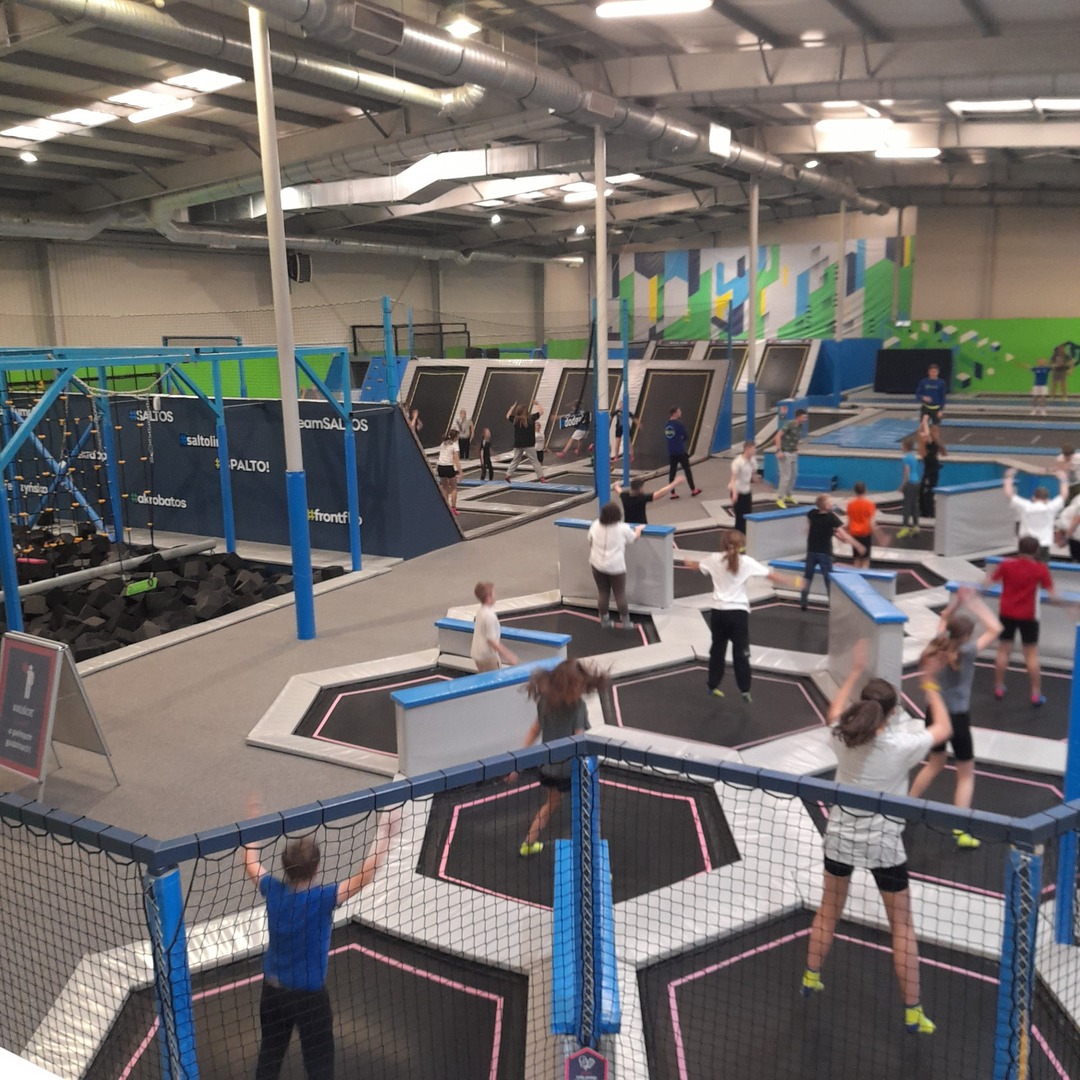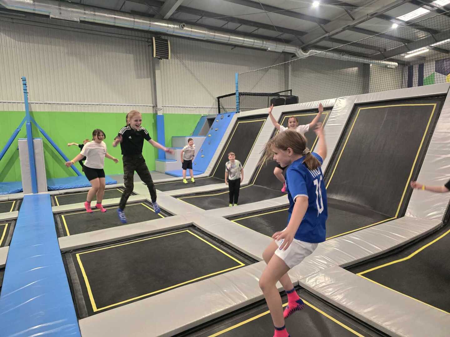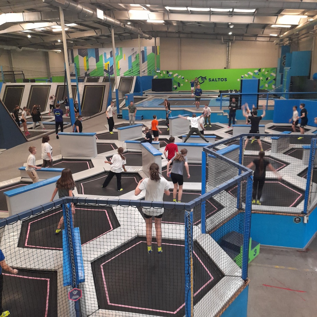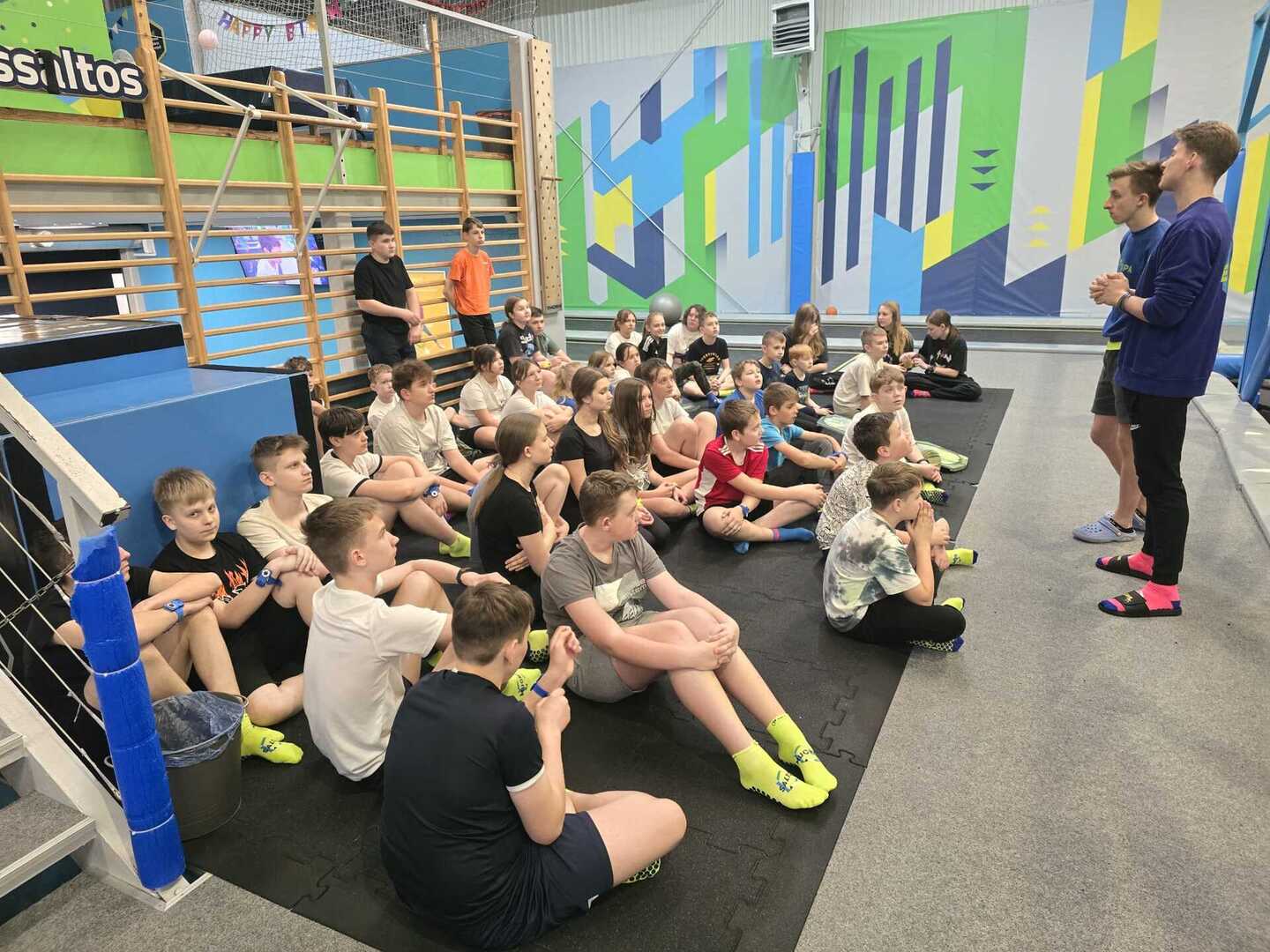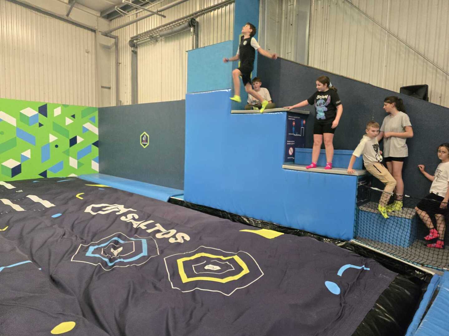 Kolejnym celem wycieczki był pobyt w parku trampolin z matami gimnastycznymi i basenem z gąbkami. Najpierw uczniowie przeszli szkolenie z zakresu bezpieczeństwa i techniki skoków. Następnie po profesjonalnej rozgrzewce pod okiem instruktorów korzystali z szeregu atrakcji. Wszyscy z radością skakali na różne sposoby. Dużym zainteresowaniem cieszyły się skoki do basenu z gąbkami.
