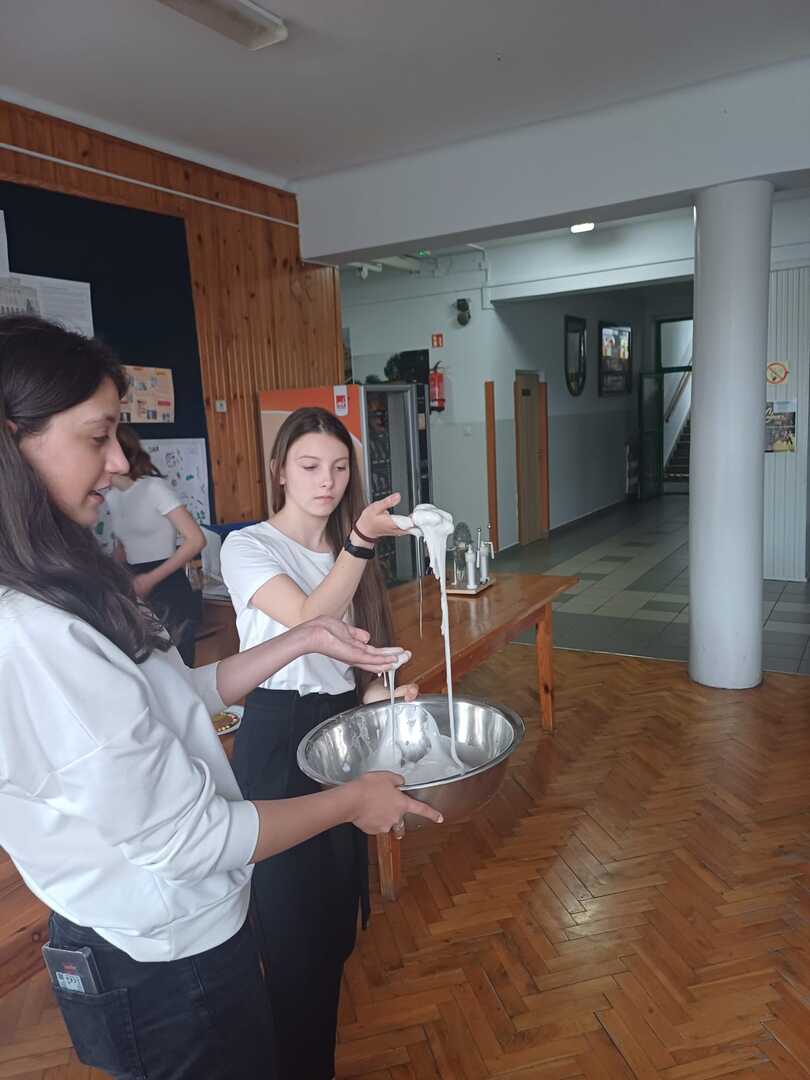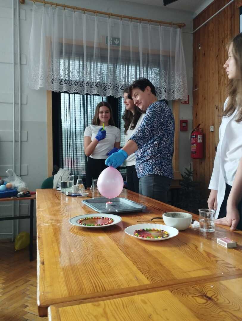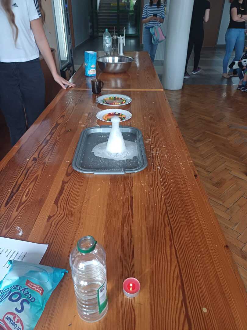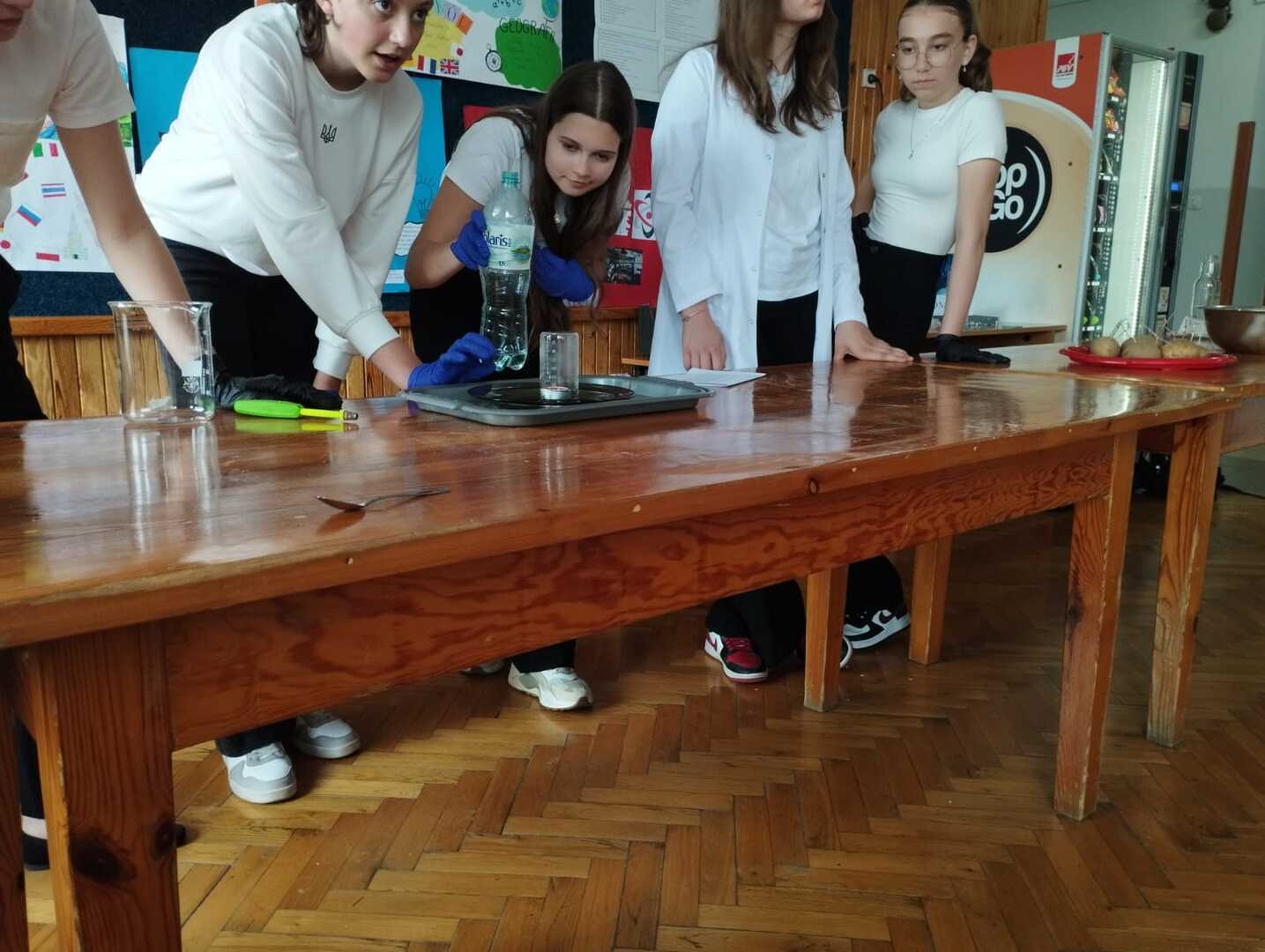 Aleksandra Idzikowska, Natalia Pawlak, Julianna Kaczurowska, Julia Kaczmarek, Zofia Filipiak, Klaudia Wójcik oraz Katarzyna Rosińska, z pomocą pani Ambrozik, zaprezentowały m.in. "jajko w butelce", ciecz nienewtonowską, lampę lawową, baterię z ziemniaków, samopopmujący balon i inne fascynujące doświadczenia, które każdy może wykonać samodzielnie w domu, wykorzystując np. sodę oczyszczoną, płyn do mycia naczyń oraz ocet.