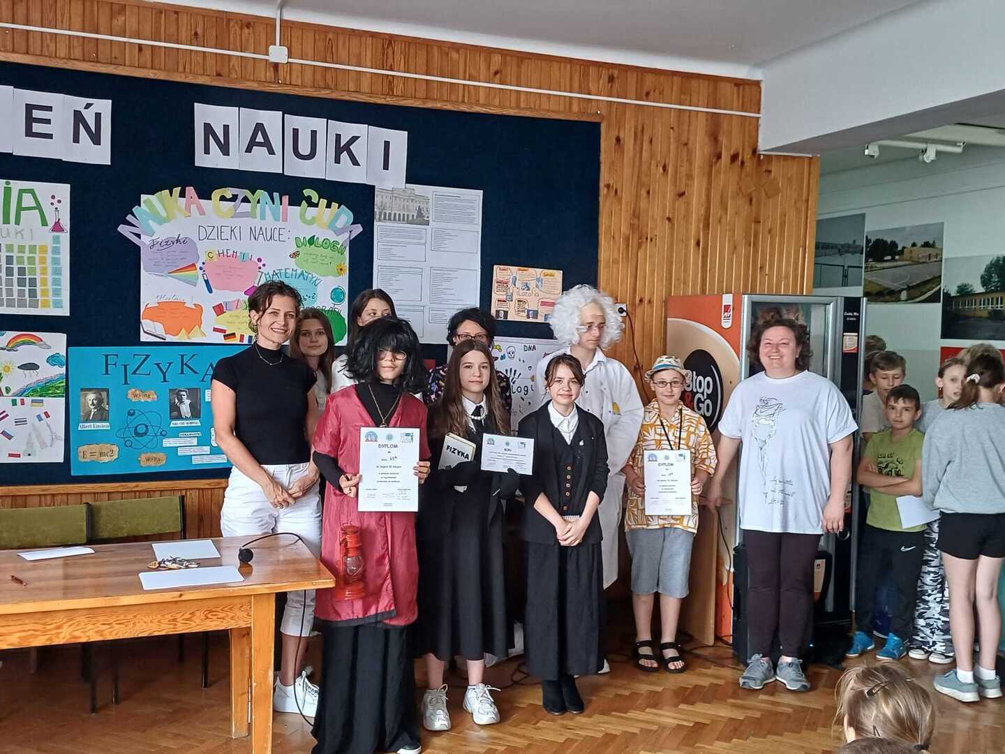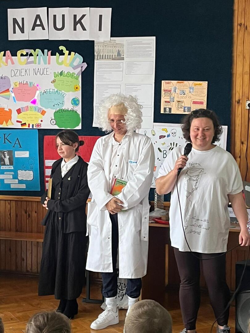 Na wyróżnienie zasługuje również klasa 3b, która jako jedyna z klas I-III wzięła udział w konkursie na najciekawsze przebranie za naukowca oraz najlepsze hasło reklamujące naukę.