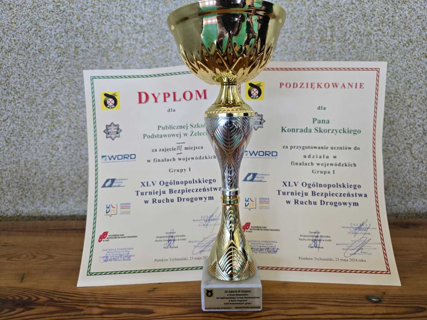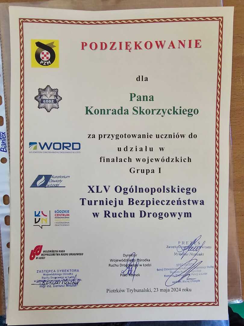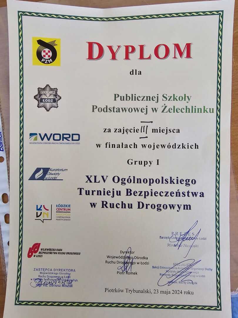 23 maja 2024 r. na terenie WORD w Piotrkowie Trybunalskim odbył się WOJEWÓDZKI Finał XLV Ogólnopolskiego Turnieju Wiedzy o Bezpieczeństwie Ruchu Drogowego dla uczniów szkół podstawowych. W konkursie udział wzięły najlepsze drużyny wyłonione podczas eliminacji powiatowych, w poszczególnych kategoriach wiekowych. Powiat tomaszowski w grupie I - klasy IV i V - reprezentowali uczniowie z Publicznej Szkoły Podstawowej w Żelechlinku, w składzie: Maksymilian Koperniak, kl. Vb, Aleksander Mucha, kl. Va oraz Jan Pecyna i Jakub Kwiatkowski, kl. IVa. Zawodnicy, pod okiem sędziów, rywalizowali w kilku konkurencjach. Po uroczystym otwarciu Turnieju zmagania konkursowe rozpoczął test wiedzy ogólnej o ruchu pieszych i rowerzystów oraz test z zasad przejazdu przez skrzyżowania drogowe. Kolejne konkurencje obejmowały jazdę rowerem po specjalnie przygotowanym torze przeszkód oraz sprawdzenie umiejętności poruszania się po miasteczku ruchu drogowego. Na koniec zawodnicy musieli wykonać zadanie z zakresu udzielania pierwszej pomocy przedmedycznej. Chłopcy z naszej szkoły zajęli drużynowo III miejsce na 21 szkół, które wzięły udział w turnieju. Maksymilian Koperniak indywidualnie uplasował się na V miejscu (z 63 uczestników), Aleksander Mucha na X miejscu, a Jan Pecyna na XV. Do turnieju uczniów naszej szkoły przygotował nauczyciel wychowania fizycznego i techniki pan Konrad Skorzycki. Gratulujemy chłopakom i życzymy dalszych sukcesów w kolejnych edycjach.