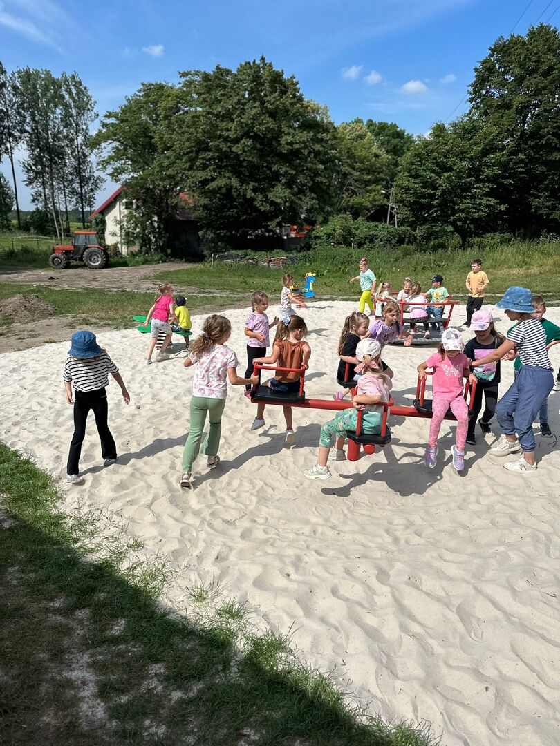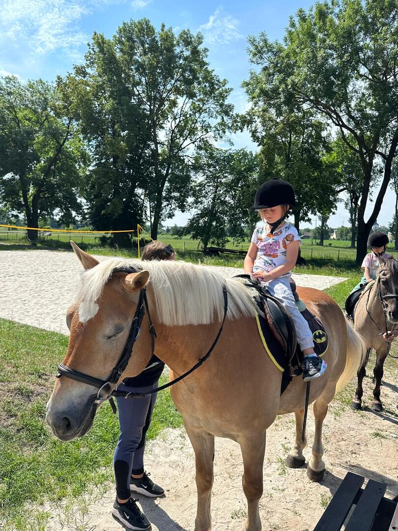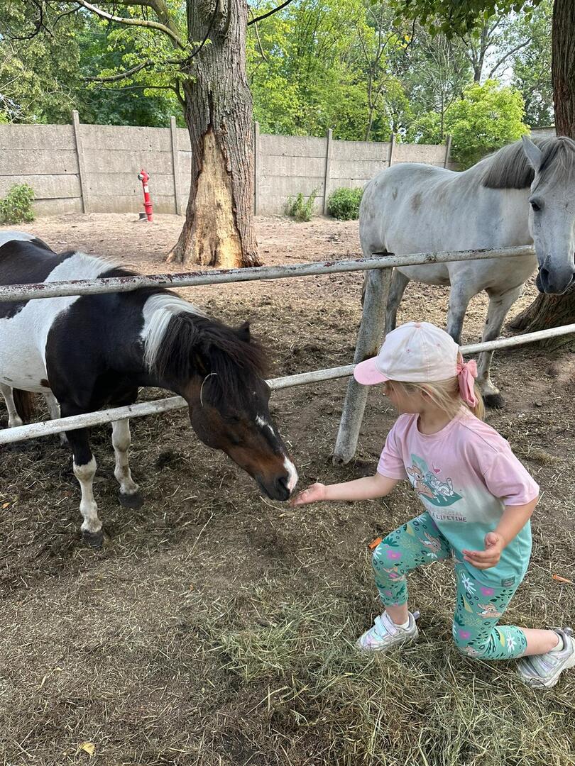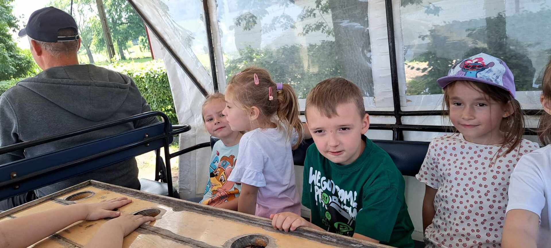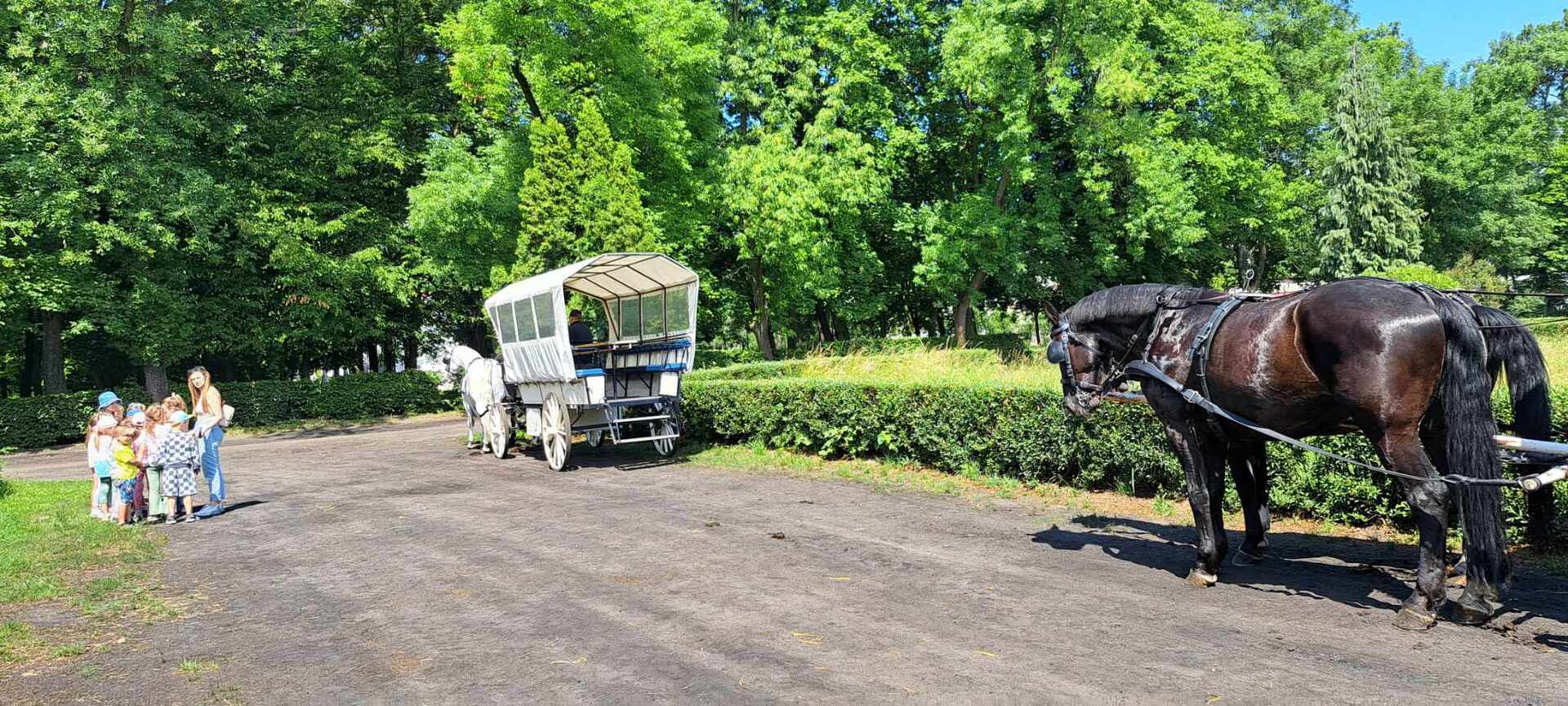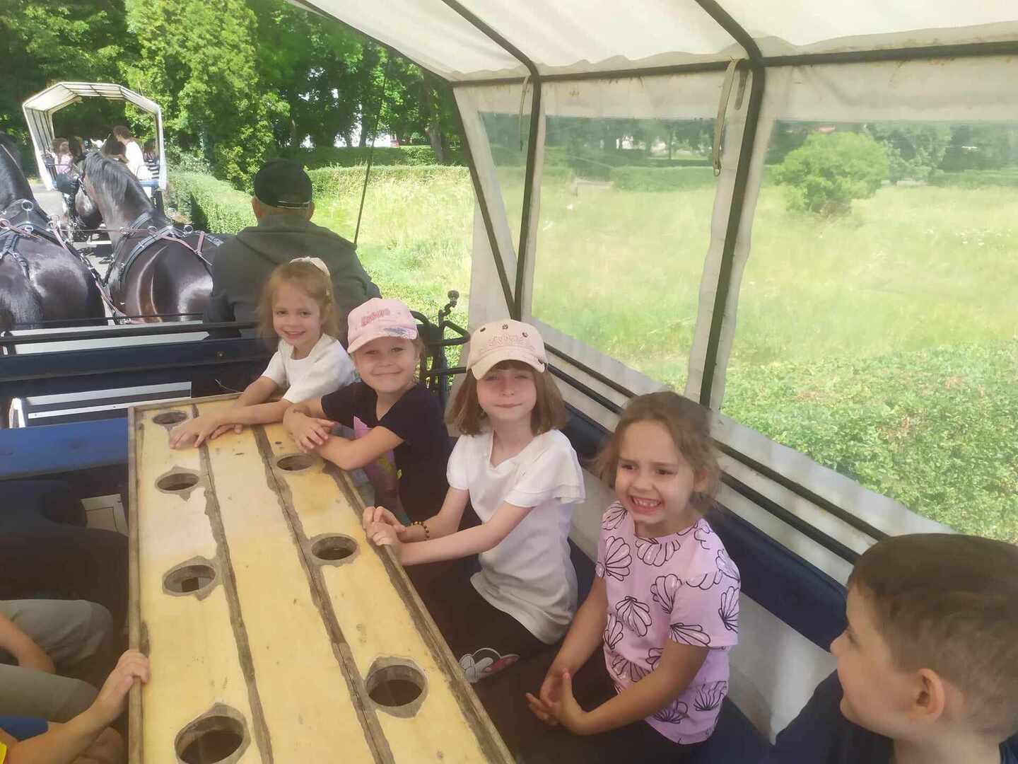 11 czerwca 2024 roku dzieci z grup 0a, 0b i 0c wraz opiekunami wybrały się na wycieczkę do Bogusławic. Pierwszym punktem wyjazdu było zwiedzanie z przewodnikiem terenu Stada Ogierów. Przedszkolaki dowiedziały się wielu cennych informacji na temat tych sympatycznych zwierząt (nazewnictwo, sposób żywienia, opieka, życie w stajni). Zapoznały się także z historią Stada oraz zwiedziły: Pałac, stajnię, krytą ujeżdżalnię, wybieg dla koni, zabytkową powozownię, zagrodę dla kucyków. Wśród atrakcji znalazły się m.in. karmienie kucyków, przejażdżka bryczką, oprowadzanie na kucyku każdego dziecka, ognisko wraz z pieczeniem kiełbasek, zestaw dmuchawców: zjeżdżalnia i zamek dmuchany.