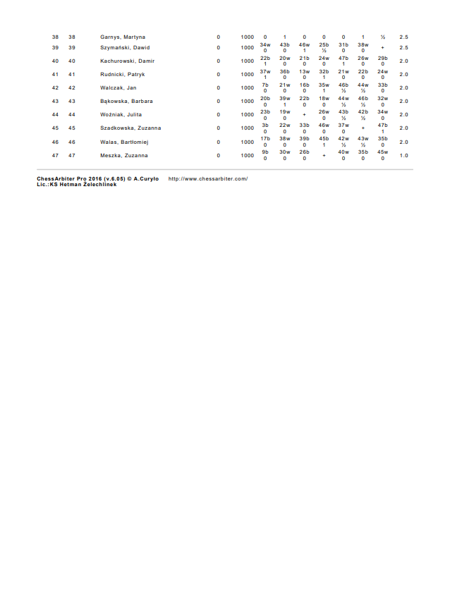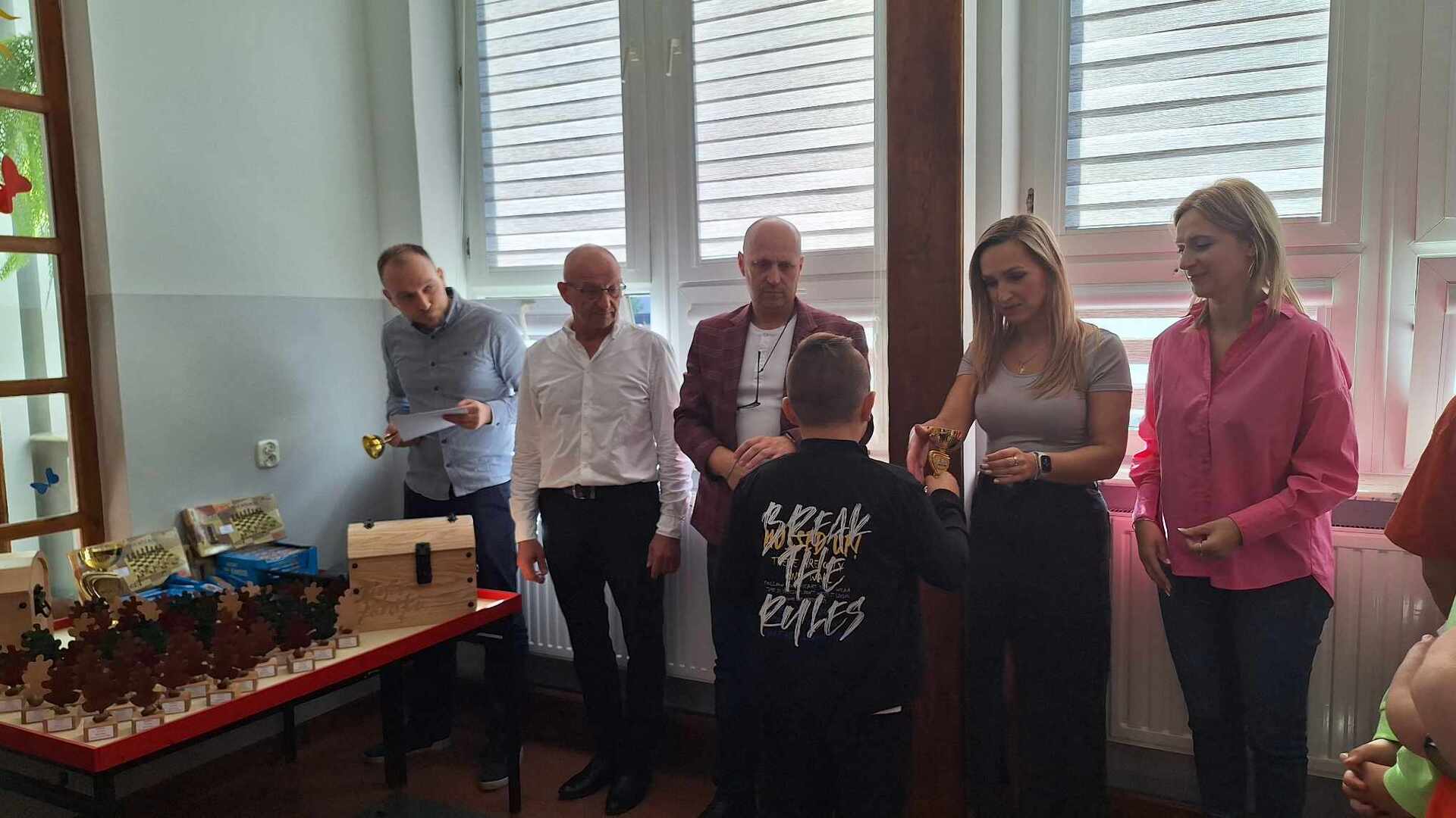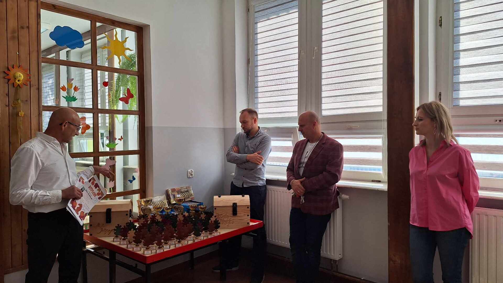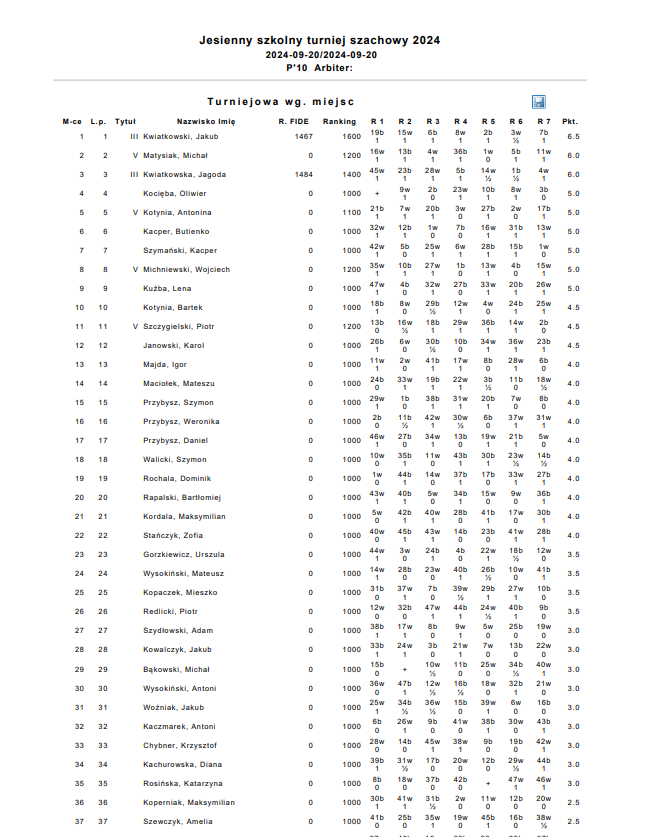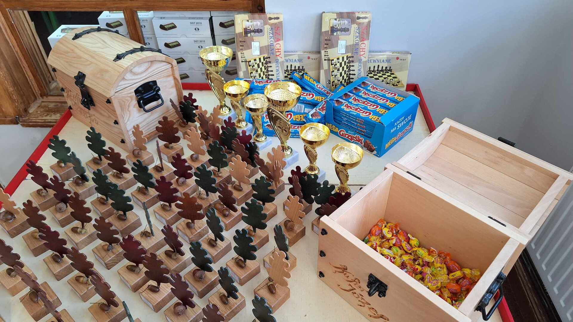 W piątek, 20.09.2024 r., w świetlicy szkolnej rozegraliśmy pierwszy z czterech, Jesienny Turniej Szachowy. Do rozgrywek zgłosiło się 47 zawodników z klas od 0 do VIII, jest to rekordowa liczba! Bardzo nas cieszy, że szachy są coraz bardziej popularne. Dzięki nim wzmacniamy rozwój intelektualny, towarzyski i społeczny - BRAWO!!!. Turniej rozegrano systemem szwajcarskim na dystansie 7 rund, w tempie 10 minut na zawodnika. Wyniki klasyfikacji końcowej przedstawione są w tabeli, w dalszej części materiału. W kategorii kl. 0 - IV najlepsze wyniki osiągnęli: 1. KACPER SZYMAŃSKI kl. 3a; 2. BARTOSZ KOTYNIA kl. 3b; 3. SZYMON PRZYBYSZ kl. 3b. W kategorii kl. V - VIII kolejność na podium przedstawia się następująco: 1. JAKUB KWIATKOWSKI kl. 5a; 2. MICHAŁ MATYSIAK kl.6b; 3. JAGODA KWIATKOWSKA kl. 7a. Zwycięzcy otrzymali pamiątkowe dyplomy oraz puchary. W ulubionej przez uczniów atrakcji podsumowującej turniej - " SZCZĘŚLIWY LOS ", kuleczki z numerami zawodników, z "KUFRA MONIKI" wylosowali kolejno: Pani Monika Matysiak, miłośnik szachów, Pani Justyna Pecyna, przewodnicząca Rady Rodziców, Pan Piotr Mikinka, dyrektor szkoły i sympatyk szachów, Pan Józef Wenecki mentor szachistów. Szczęśliwcami okazali się: Dawid Szymański, Amelia Szewczyk, Daniel Przybysz i Lena Kuźba. Uczniowie ci otrzymali pamiątkowe szachy ufundowane przez miłośników szachów. Każdy z zawodników na zakończenie otrzymał słodycze oraz pamiątkową, oryginalną statuetkę nawiązującą do jesieni. Liść dębu w statuetce i żołędzie symbolizują " królewskie drzewo ", bardzo twarde, wytrzymałe, cenione w galanterii wyrobów drewnianych. Oznaczającą potęgę i moc analogicznie do gry królewskiej - szachów. Sponsorami turnieju byli: KS HETMAN ŻELECHLINEK, RADA RODZICÓW PSP ŻELECHLINEK, MIŁOŚNICY SZACHÓW. Składamy serdeczne podziękowania osobom, dzięki którym nasze turnieje możemy realizować: PANI MONICE MATYSIAK dbającej o udostępnienie medialne i wszystkie materiały graficzne, PANU PAWŁOWI KWIATKOWSKIEMU prezesowi KS HETMAN ŻELECHLINEK za ufundowanie pucharów, wsparcie i obsługę techniczną całego turnieju, kreatywnemu wykonawcy oryginalnych statuetek, przyglądającemu się całości, piszącemu te słowa. Z szachowym pozdrowieniem Józef Wenecki.