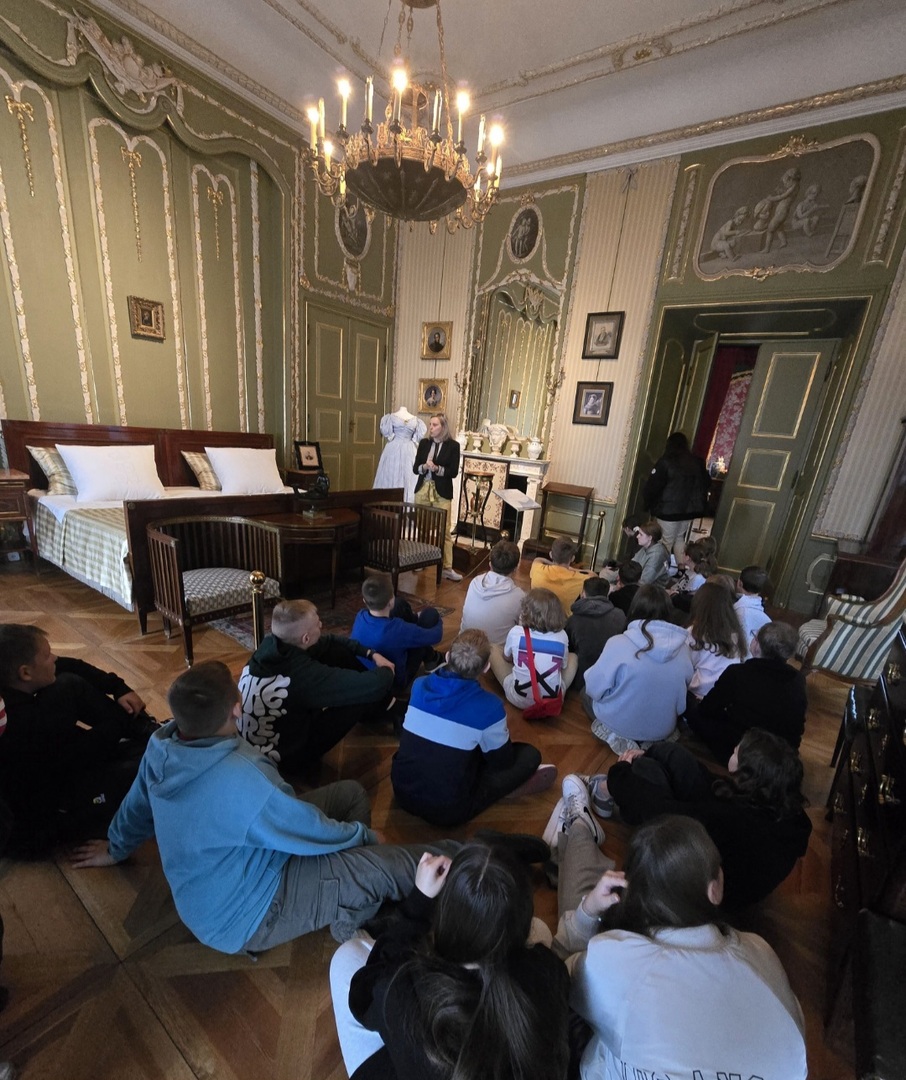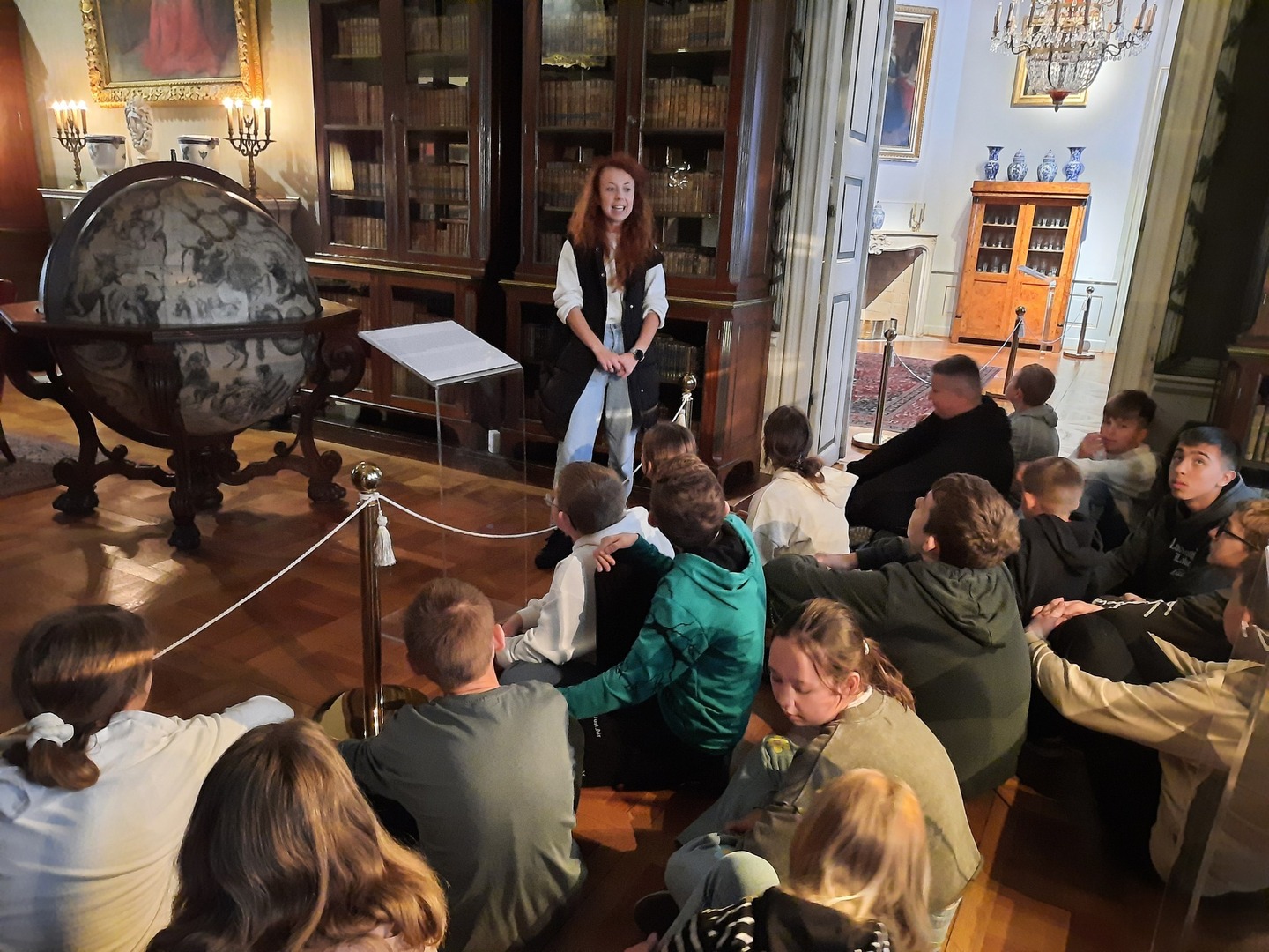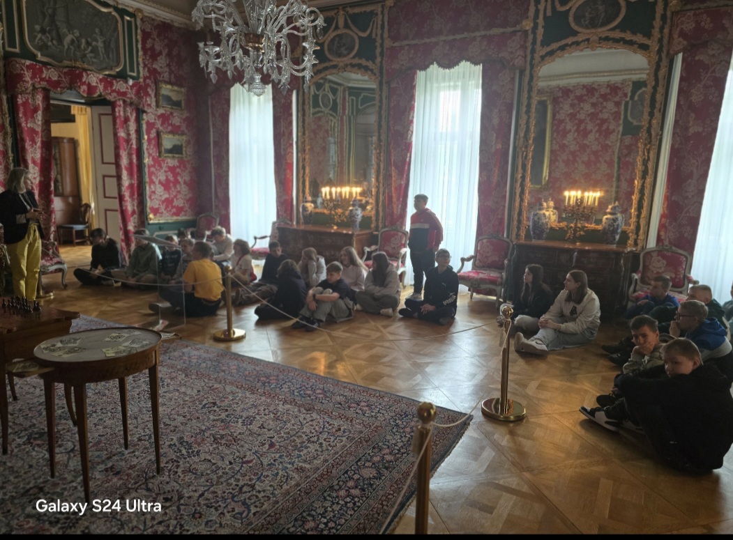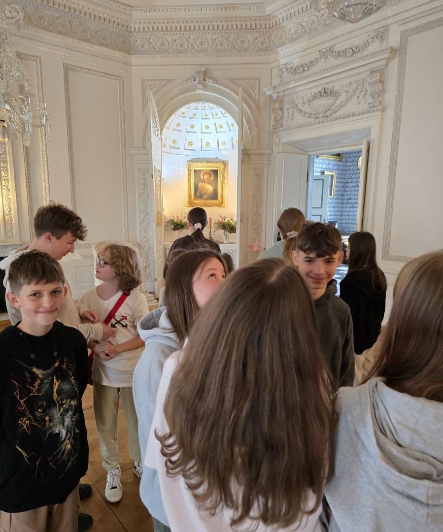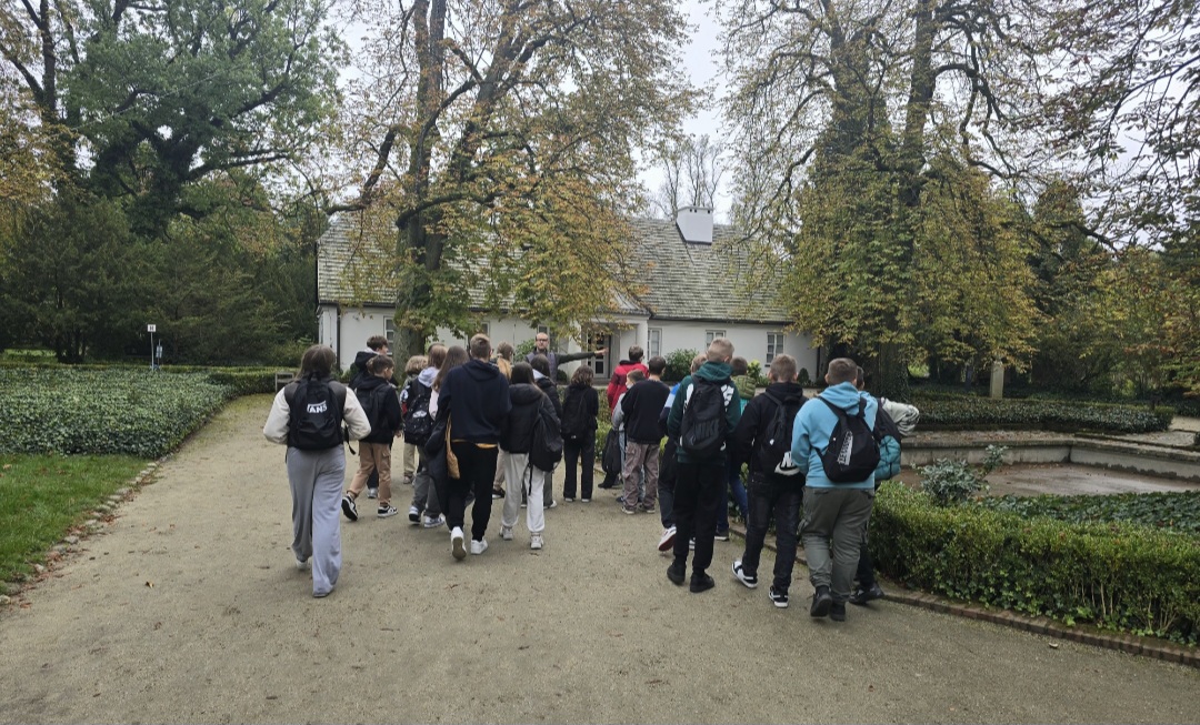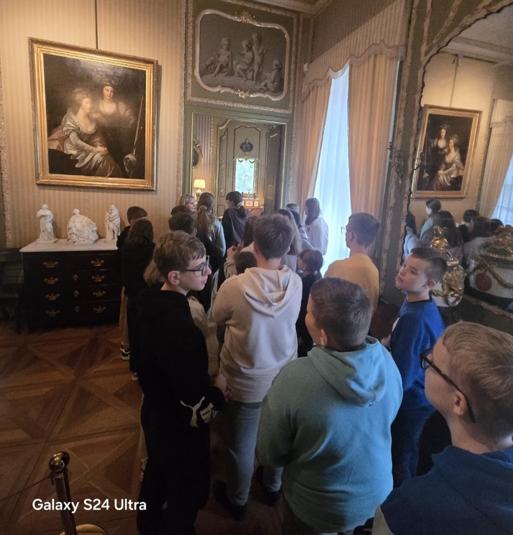 W dniu 4 października 2024 r. dziewczynki i chłopcy z klas: VIb, VIIa i VII b wraz z wychowawcami: p. Dorotą Kowalewską, p. Pauliną Kostrzewą, p. Leszkiem Jarosińskim oraz nauczycielką informatyki panią Iloną Dudą wzięli udział w wycieczce edukacyjno-krajoznawczej do Muzeum w Nieborowie i Żelazowej Woli. W Nieborowie uczniowie uczestniczyli w lekcji muzealnej pt. ,,Zabytki i zbytki”, która była prawdziwą zabawą z historią. Wraz z przewodnikiem zwiedzali muzeum, poznając historię pałacu i jego dawnych właścicieli. Przechodząc przez kolejne sale, podziwiali bogato zdobione wnętrza i zgromadzone tam eksponaty. Podsumowaniem zwiedzania była gra w kalambury, która pozwoliła utrwalić najistotniejsze wiadomości o nieborowskich zabytkach. Pobyt w Nieborowie zakończyliśmy spacerem po pałacowym parku, zachwycając się jesiennym pejzażem.