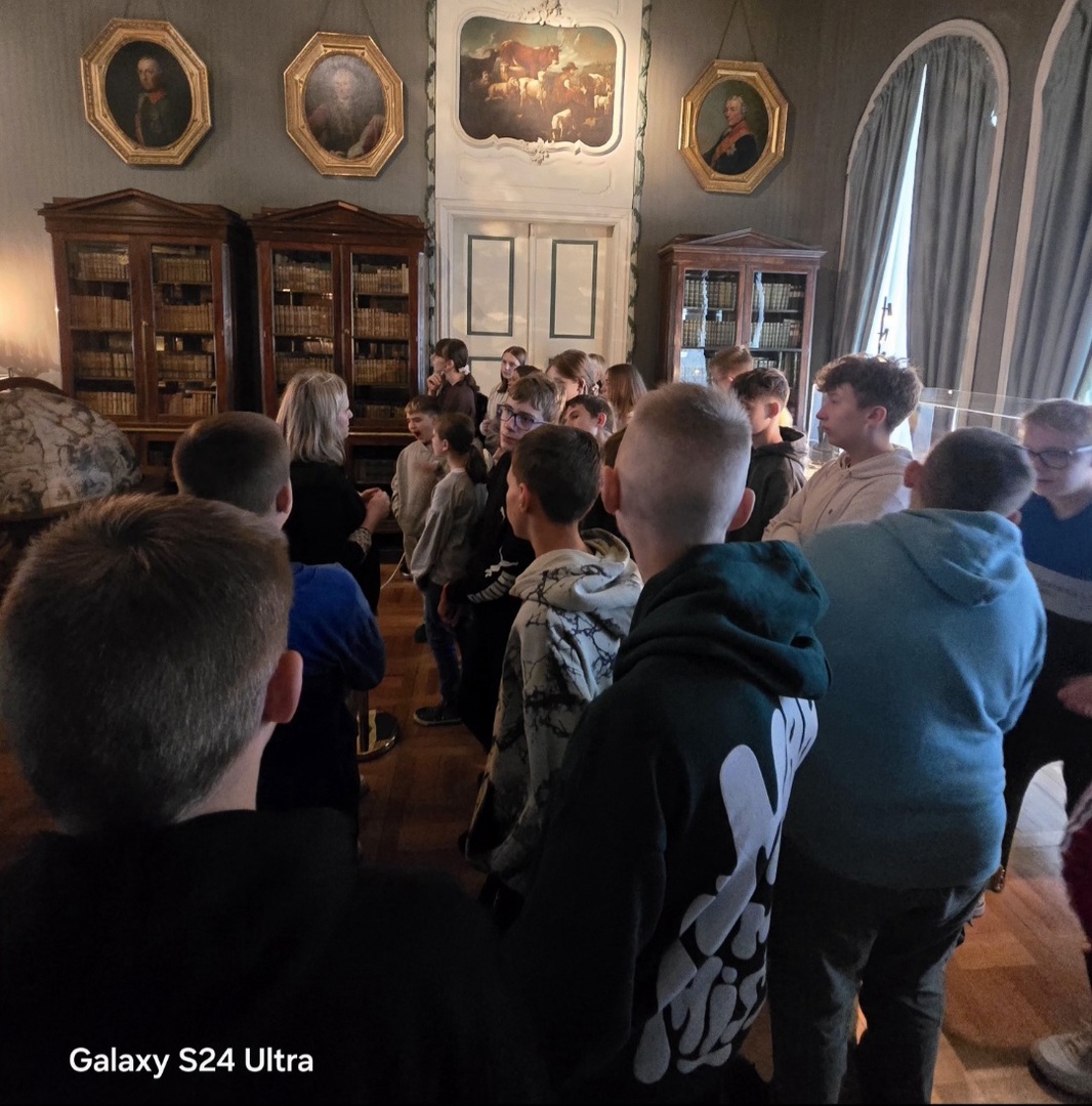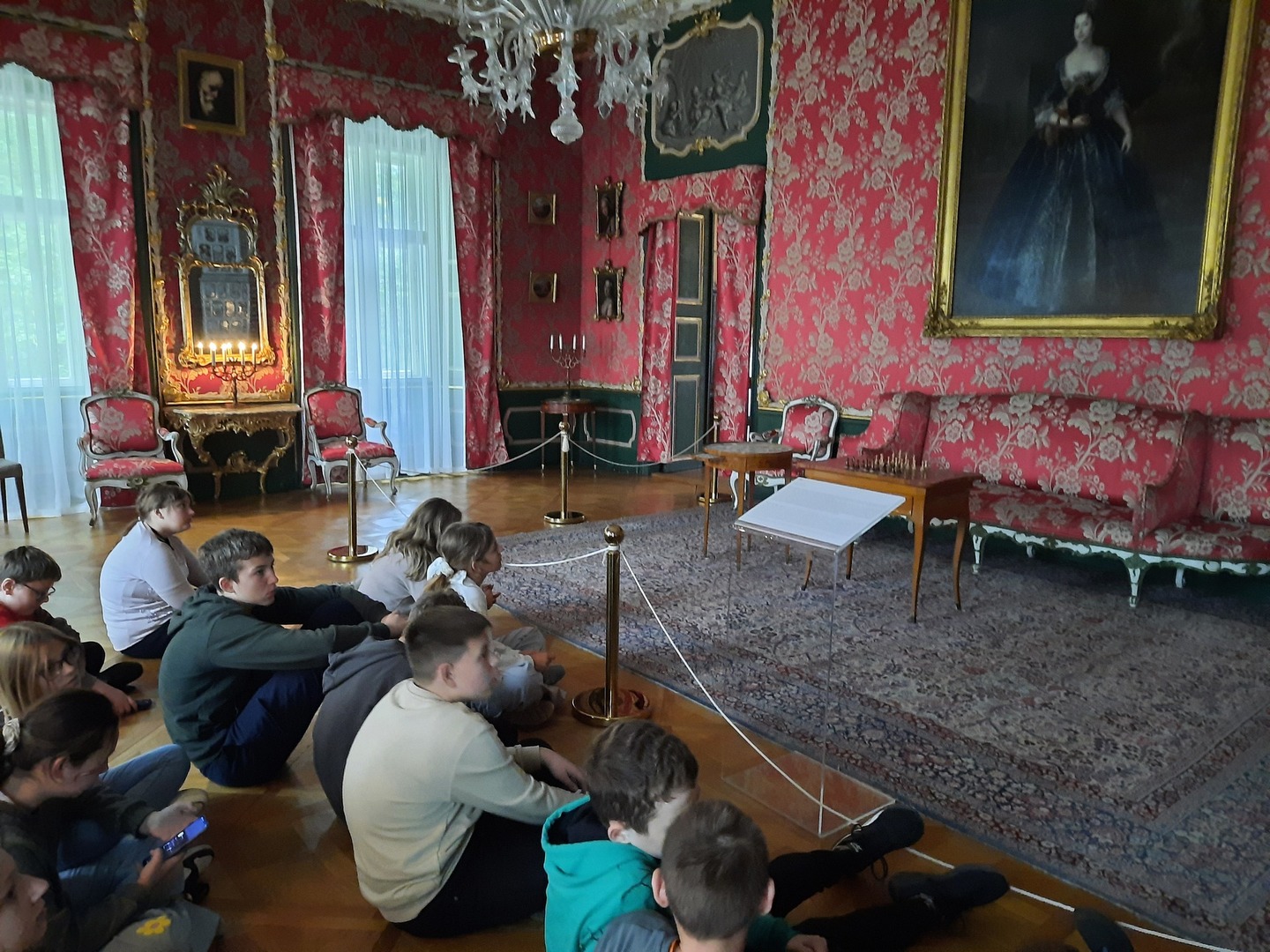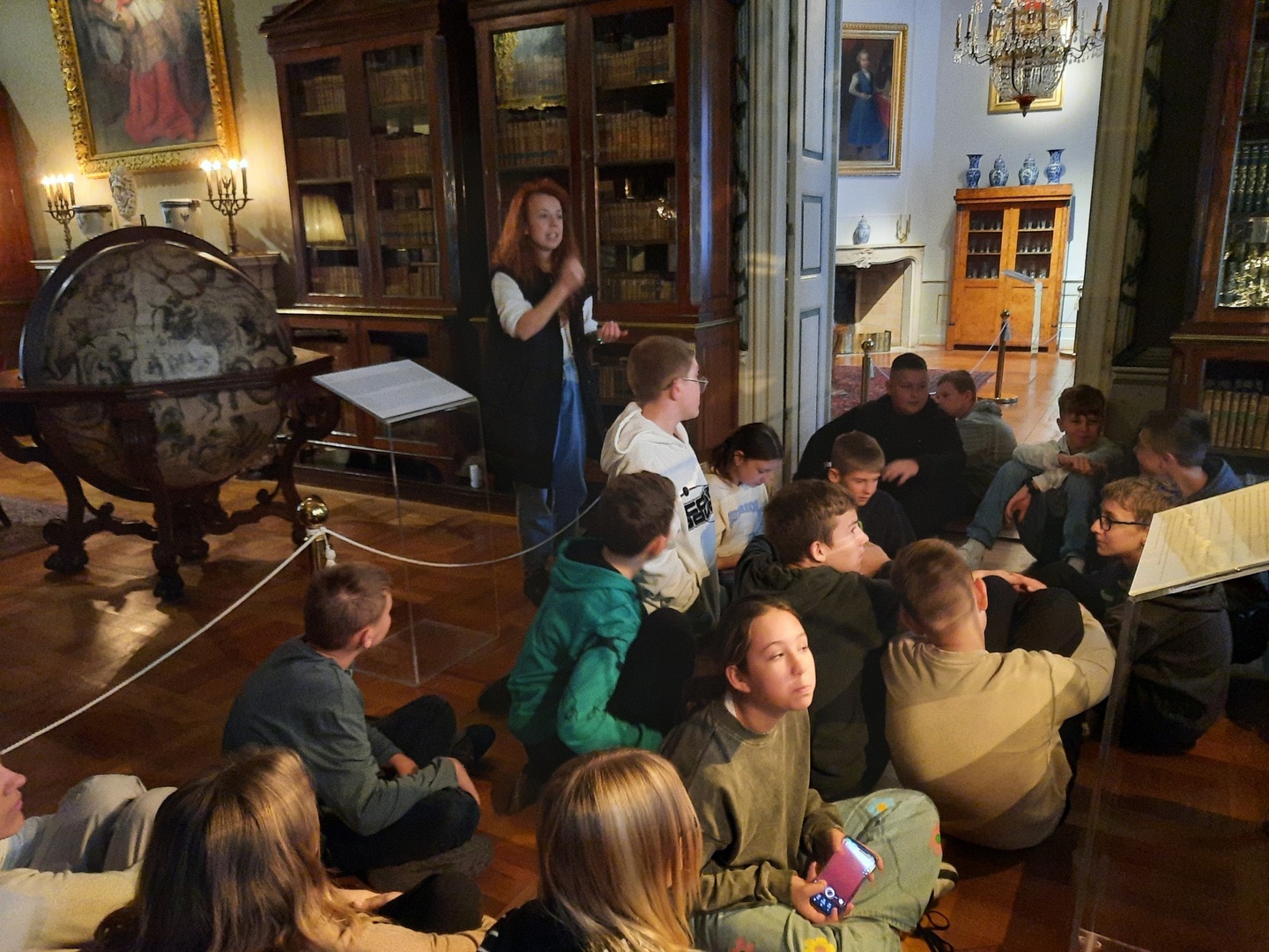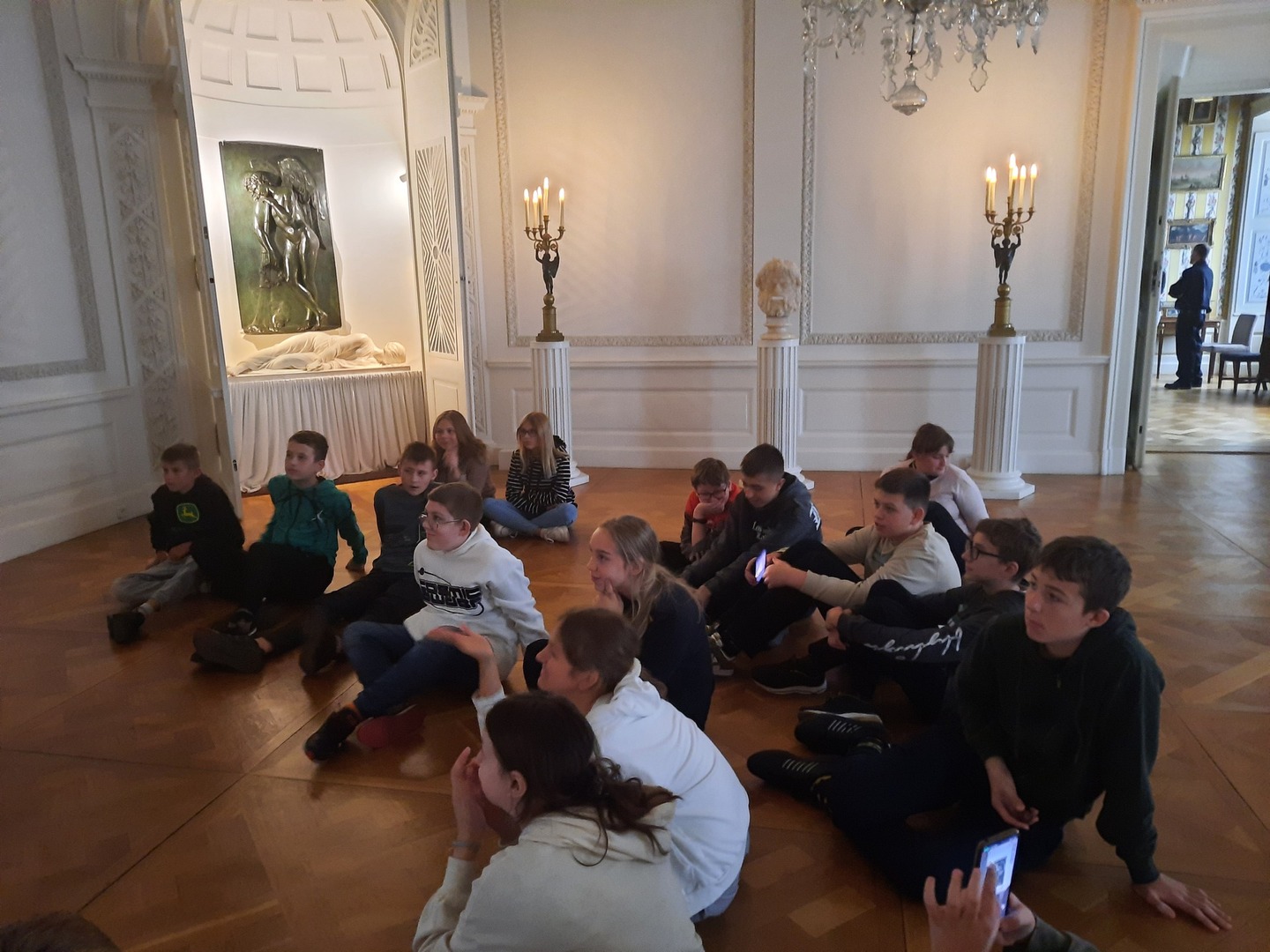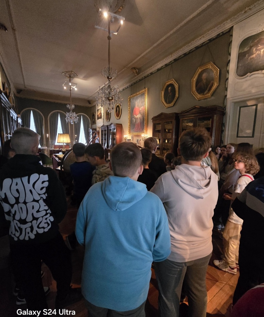 W dniu 4 października 2024 r. dziewczynki i chłopcy z klas: VIb, VIIa i VII b wraz z wychowawcami: p. Dorotą Kowalewską, p. Pauliną Kostrzewą, p. Leszkiem Jarosińskim oraz nauczycielką informatyki panią Iloną Dudą wzięli udział w wycieczce edukacyjno-krajoznawczej do Muzeum w Nieborowie i Żelazowej Woli. W Nieborowie uczniowie uczestniczyli w lekcji muzealnej pt. ,,Zabytki i zbytki”, która była prawdziwą zabawą z historią. Wraz z przewodnikiem zwiedzali muzeum, poznając historię pałacu i jego dawnych właścicieli. Przechodząc przez kolejne sale, podziwiali bogato zdobione wnętrza i zgromadzone tam eksponaty. Podsumowaniem zwiedzania była gra w kalambury, która pozwoliła utrwalić najistotniejsze wiadomości o nieborowskich zabytkach. Pobyt w Nieborowie zakończyliśmy spacerem po pałacowym parku, zachwycając się jesiennym pejzażem.