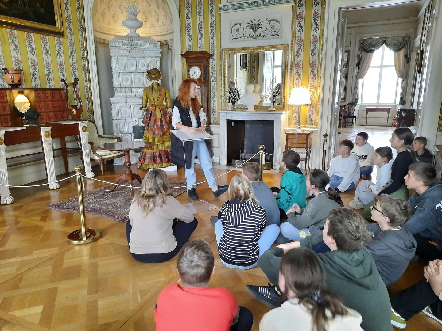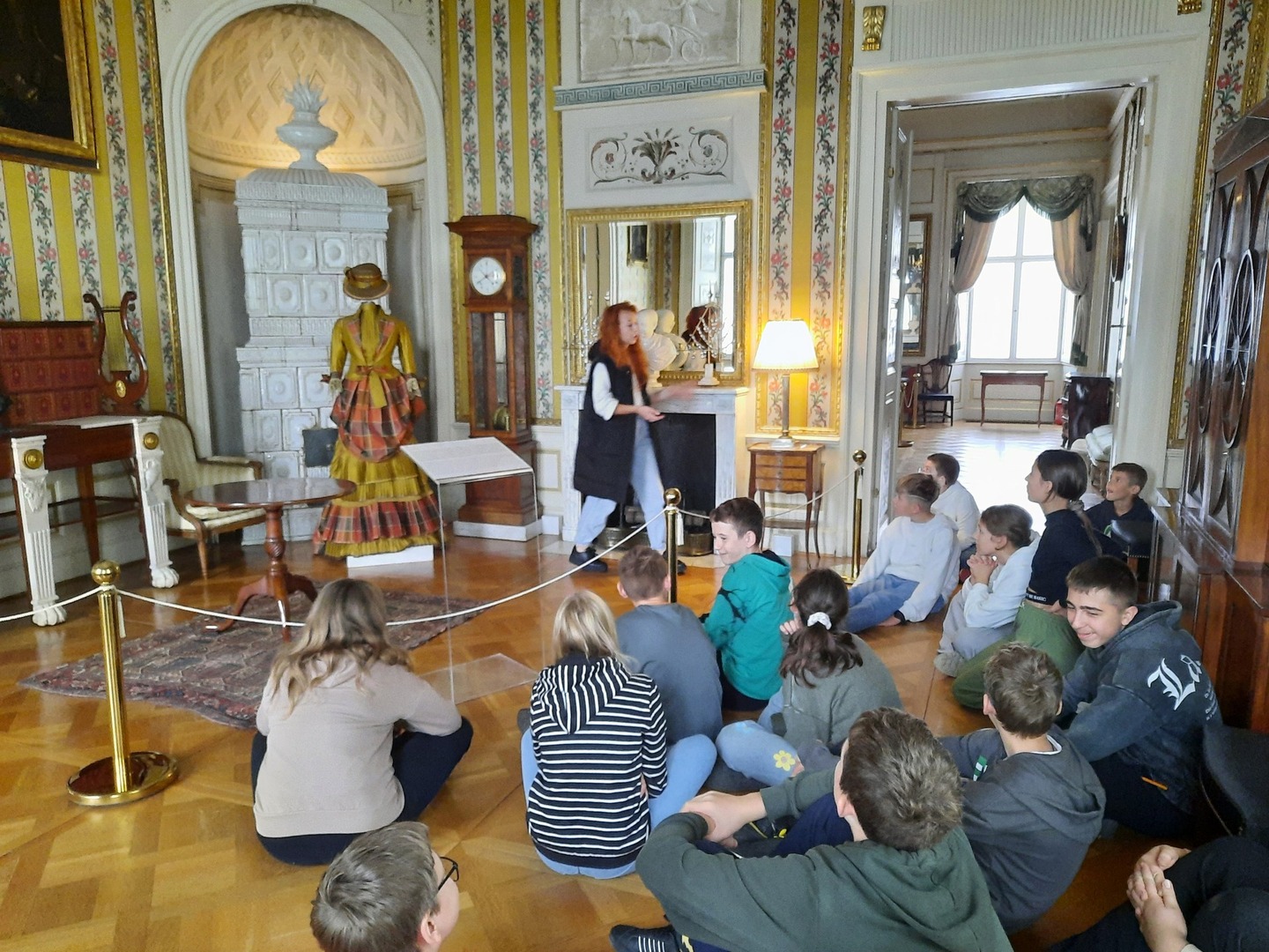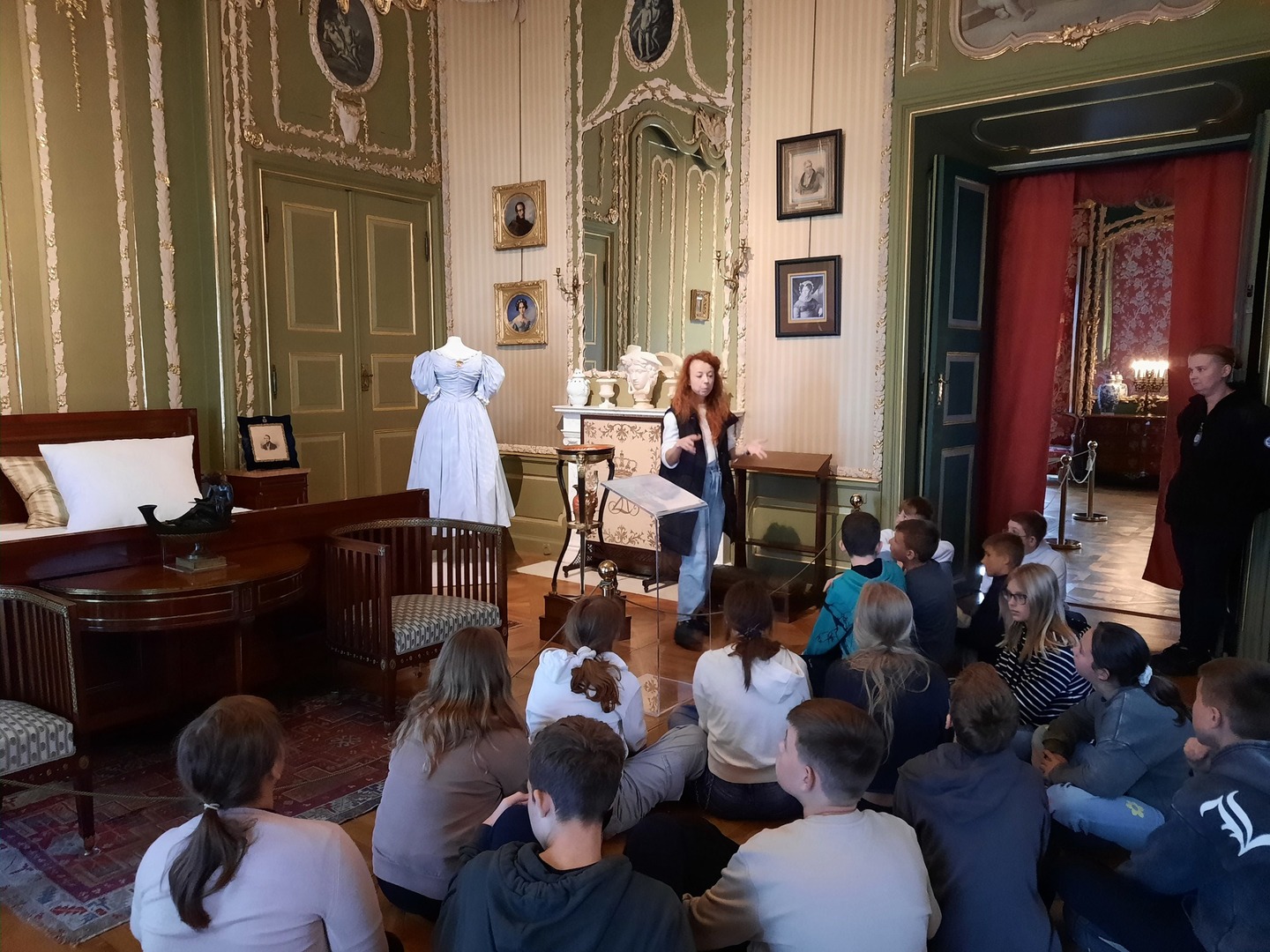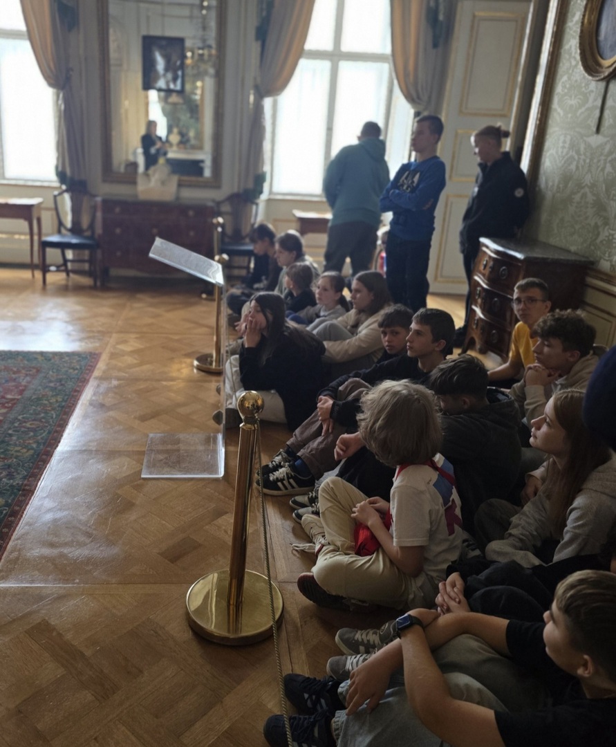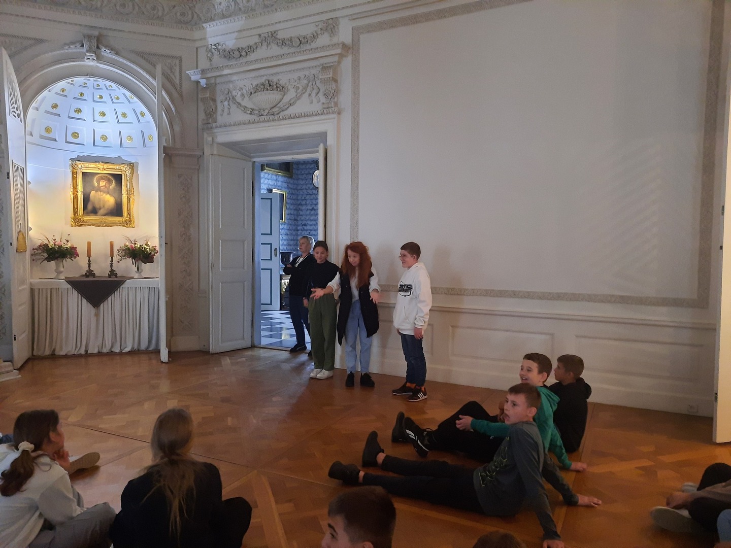 W dniu 4 października 2024 r. dziewczynki i chłopcy z klas: VIb, VIIa i VII b wraz z wychowawcami: p. Dorotą Kowalewską, p. Pauliną Kostrzewą, p. Leszkiem Jarosińskim oraz nauczycielką informatyki panią Iloną Dudą wzięli udział w wycieczce edukacyjno-krajoznawczej do Muzeum w Nieborowie i Żelazowej Woli. W Nieborowie uczniowie uczestniczyli w lekcji muzealnej pt. ,,Zabytki i zbytki”, która była prawdziwą zabawą z historią. Wraz z przewodnikiem zwiedzali muzeum, poznając historię pałacu i jego dawnych właścicieli. Przechodząc przez kolejne sale, podziwiali bogato zdobione wnętrza i zgromadzone tam eksponaty. Podsumowaniem zwiedzania była gra w kalambury, która pozwoliła utrwalić najistotniejsze wiadomości o nieborowskich zabytkach. Pobyt w Nieborowie zakończyliśmy spacerem po pałacowym parku, zachwycając się jesiennym pejzażem.