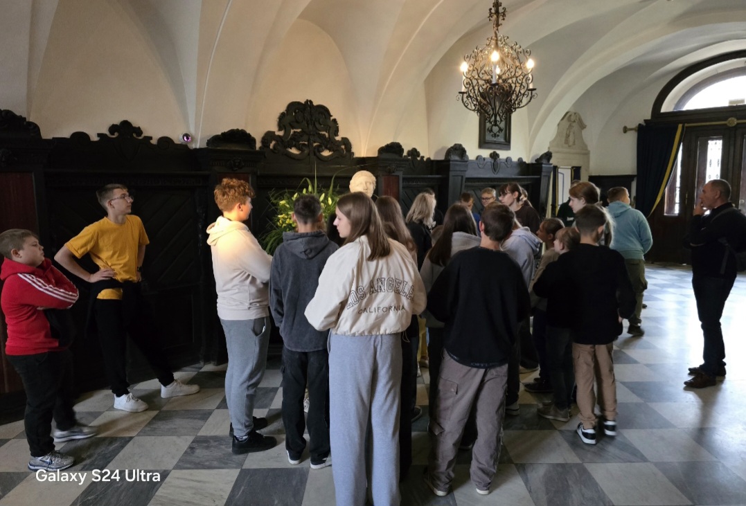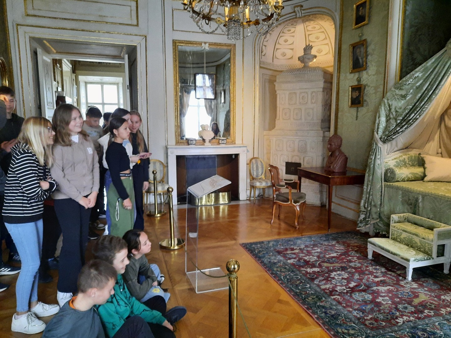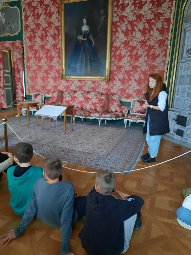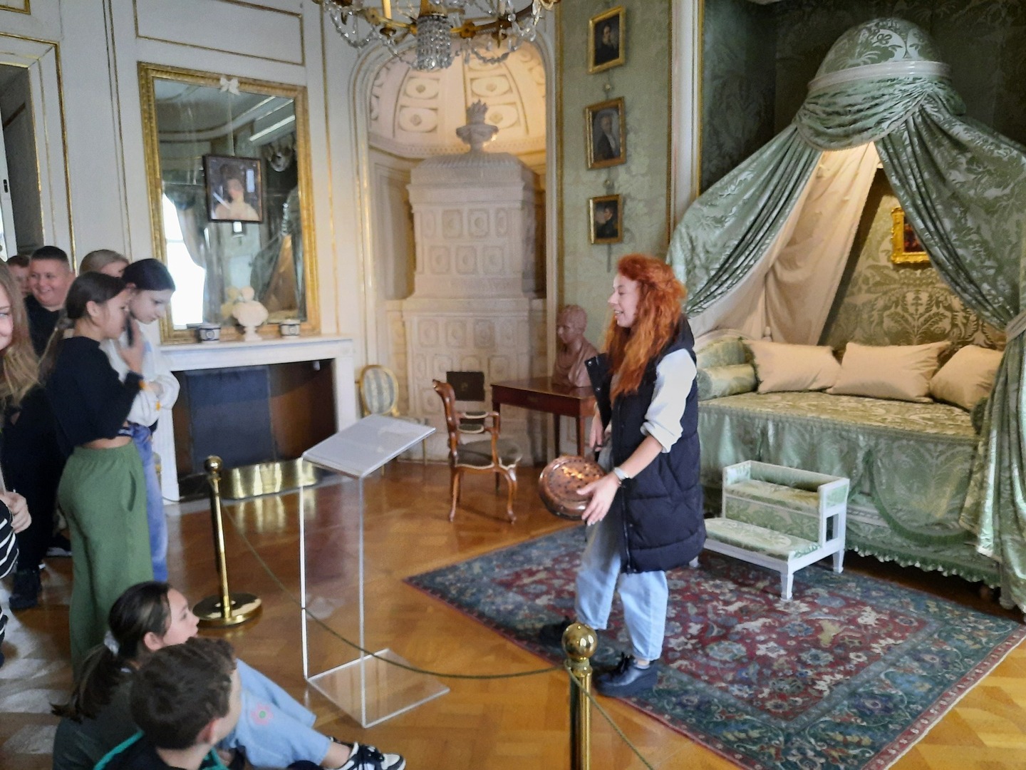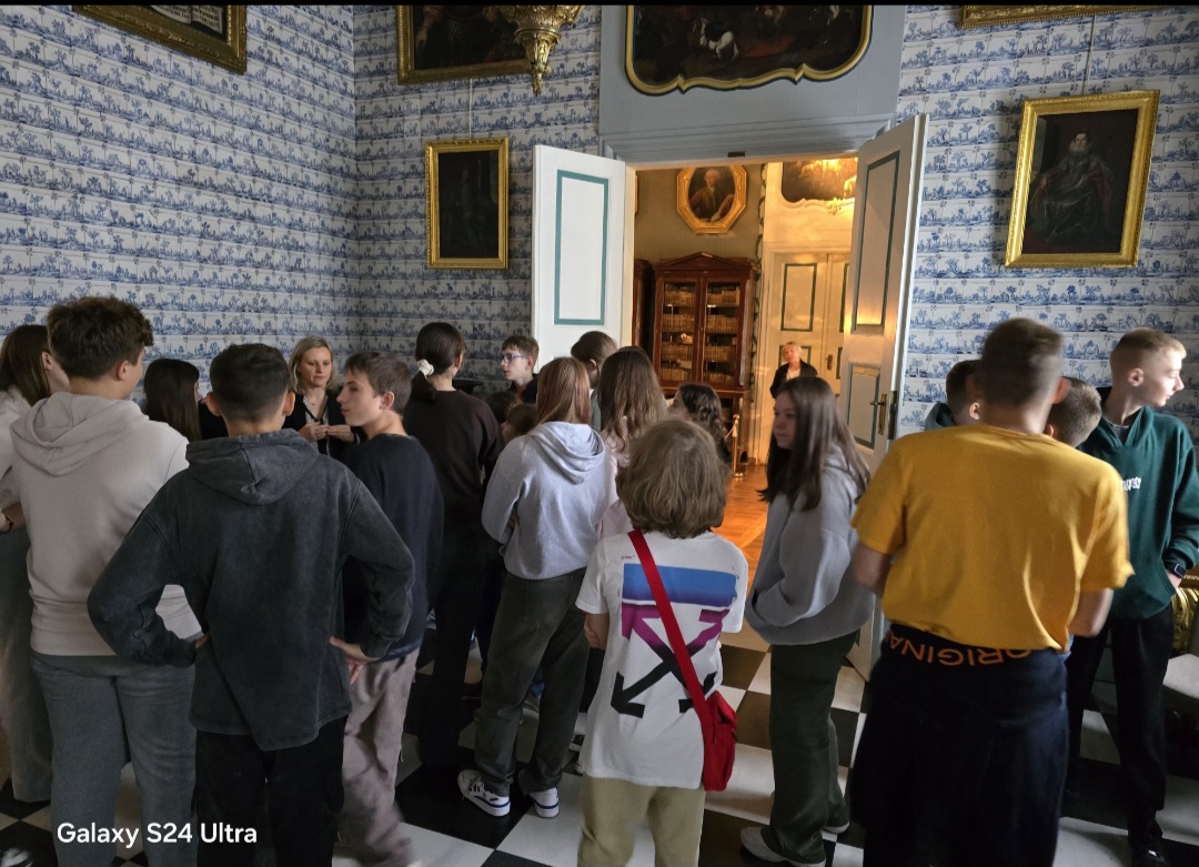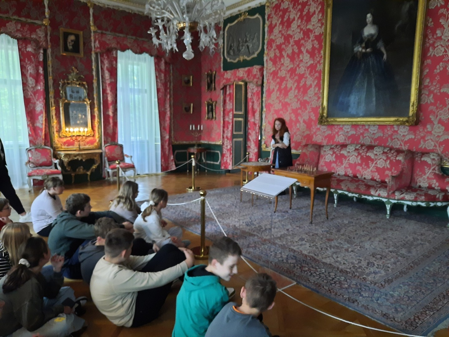 W dniu 4 października 2024 r. dziewczynki i chłopcy z klas: VIb, VIIa i VII b wraz z wychowawcami: p. Dorotą Kowalewską, p. Pauliną Kostrzewą, p. Leszkiem Jarosińskim oraz nauczycielką informatyki panią Iloną Dudą wzięli udział w wycieczce edukacyjno-krajoznawczej do Muzeum w Nieborowie i Żelazowej Woli. W Nieborowie uczniowie uczestniczyli w lekcji muzealnej pt. ,,Zabytki i zbytki”, która była prawdziwą zabawą z historią. Wraz z przewodnikiem zwiedzali muzeum, poznając historię pałacu i jego dawnych właścicieli. Przechodząc przez kolejne sale, podziwiali bogato zdobione wnętrza i zgromadzone tam eksponaty. Podsumowaniem zwiedzania była gra w kalambury, która pozwoliła utrwalić najistotniejsze wiadomości o nieborowskich zabytkach. Pobyt w Nieborowie zakończyliśmy spacerem po pałacowym parku, zachwycając się jesiennym pejzażem.