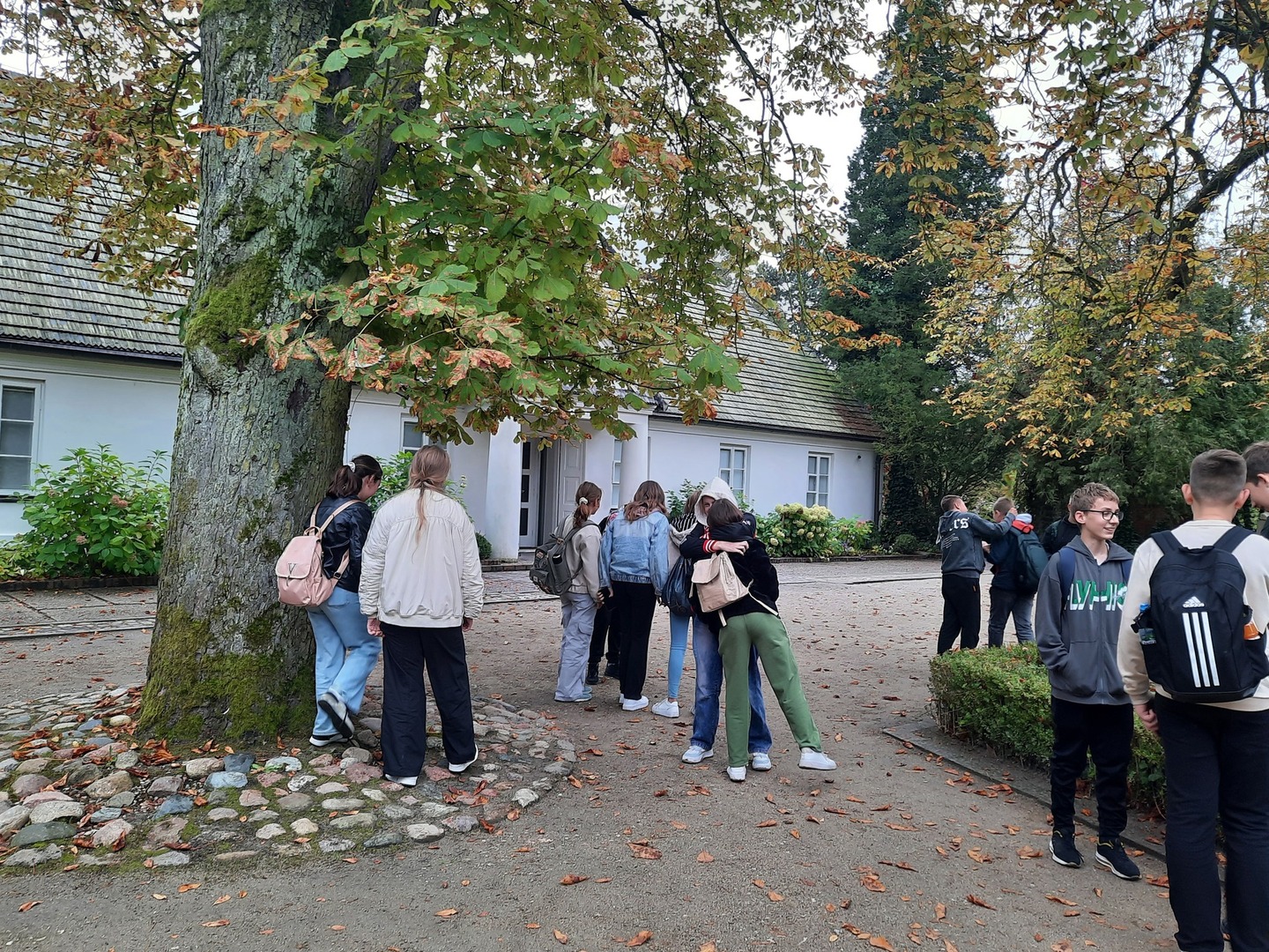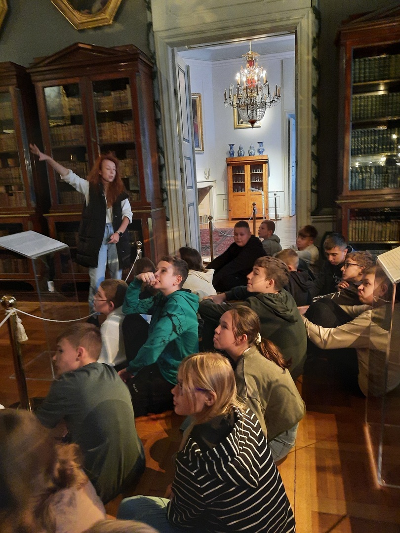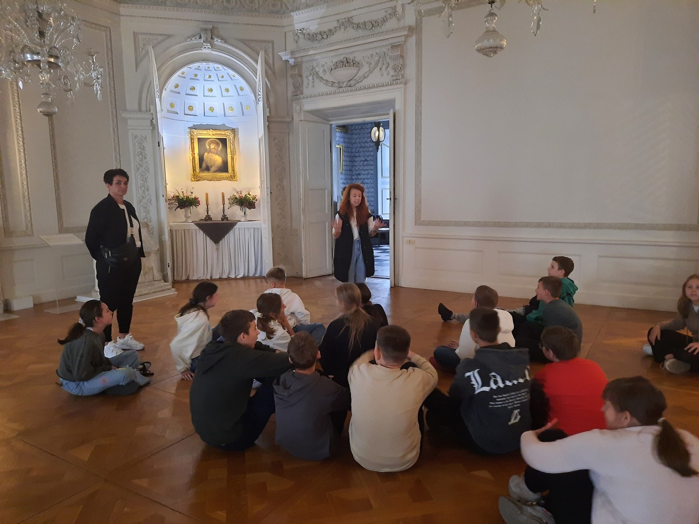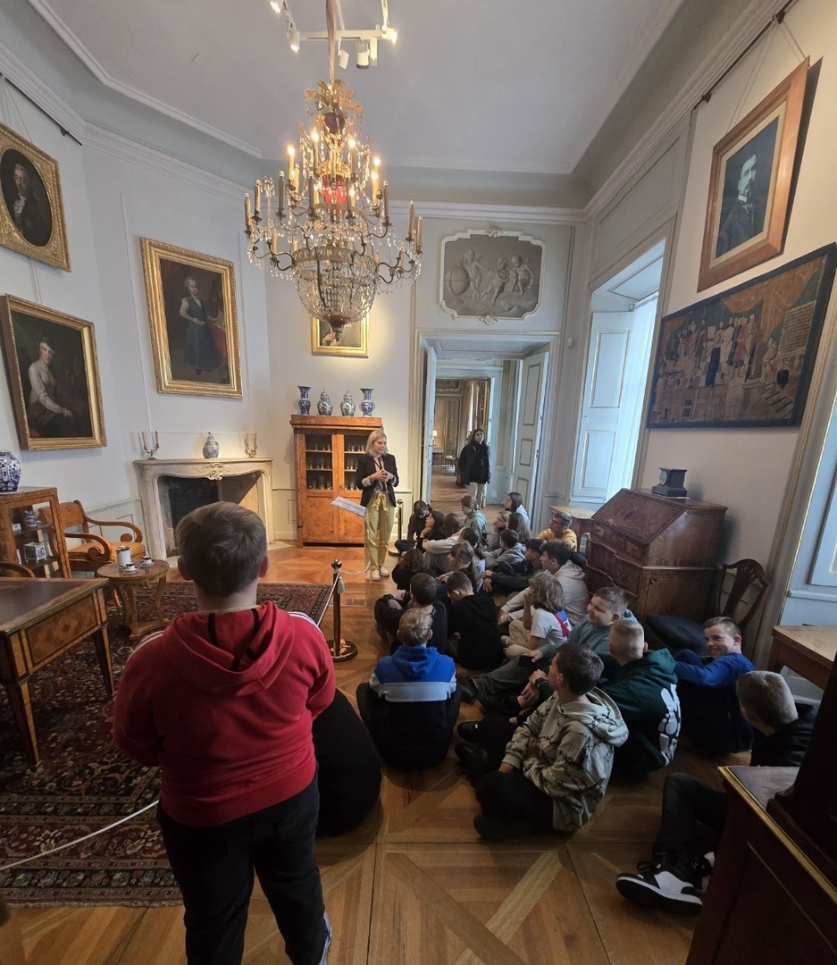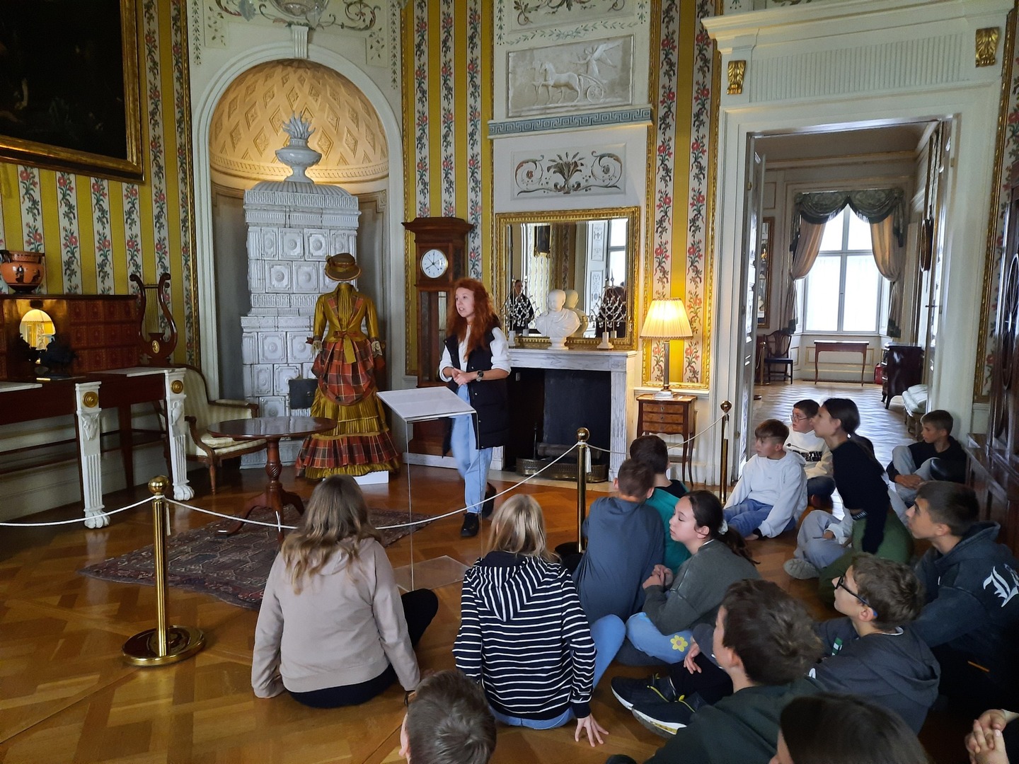 W dniu 4 października 2024 r. dziewczynki i chłopcy z klas: VIb, VIIa i VII b wraz z wychowawcami: p. Dorotą Kowalewską, p. Pauliną Kostrzewą, p. Leszkiem Jarosińskim oraz nauczycielką informatyki panią Iloną Dudą wzięli udział w wycieczce edukacyjno-krajoznawczej do Muzeum w Nieborowie i Żelazowej Woli. W Nieborowie uczniowie uczestniczyli w lekcji muzealnej pt. ,,Zabytki i zbytki”, która była prawdziwą zabawą z historią. Wraz z przewodnikiem zwiedzali muzeum, poznając historię pałacu i jego dawnych właścicieli. Przechodząc przez kolejne sale, podziwiali bogato zdobione wnętrza i zgromadzone tam eksponaty. Podsumowaniem zwiedzania była gra w kalambury, która pozwoliła utrwalić najistotniejsze wiadomości o nieborowskich zabytkach. Pobyt w Nieborowie zakończyliśmy spacerem po pałacowym parku, zachwycając się jesiennym pejzażem.
