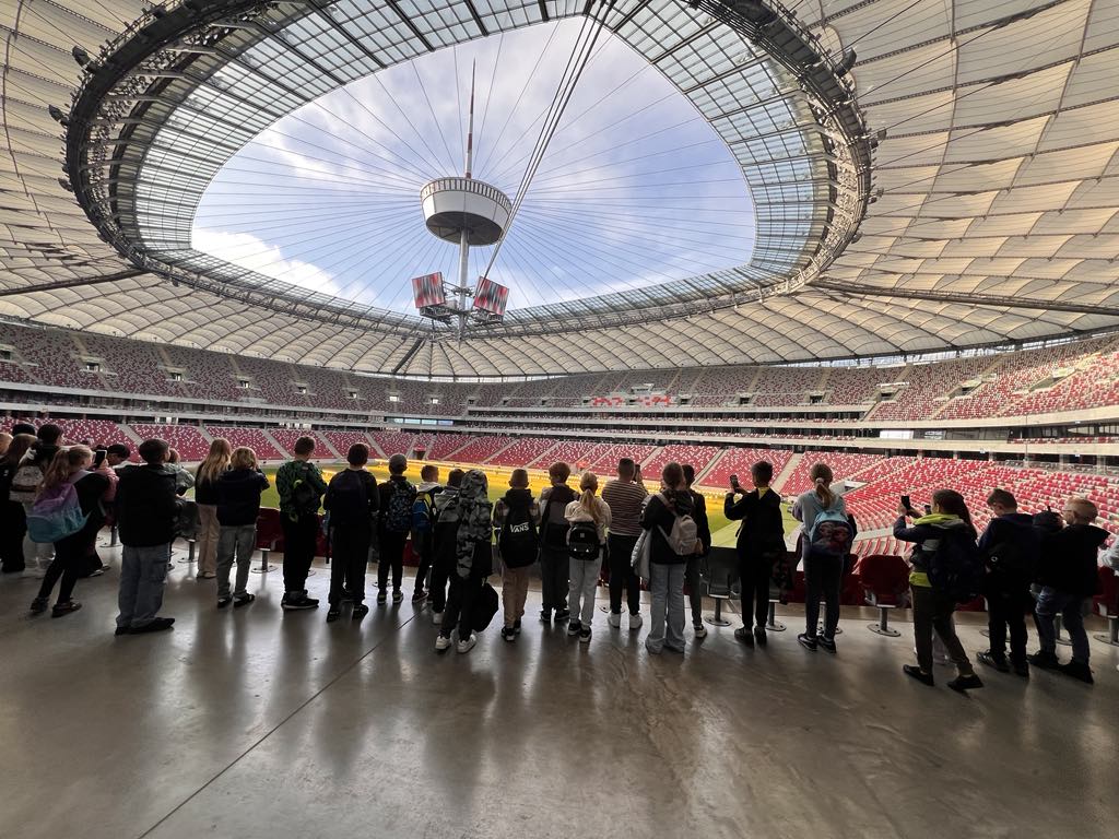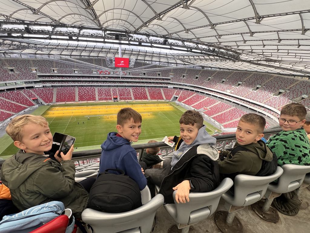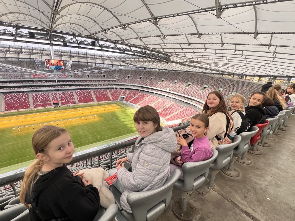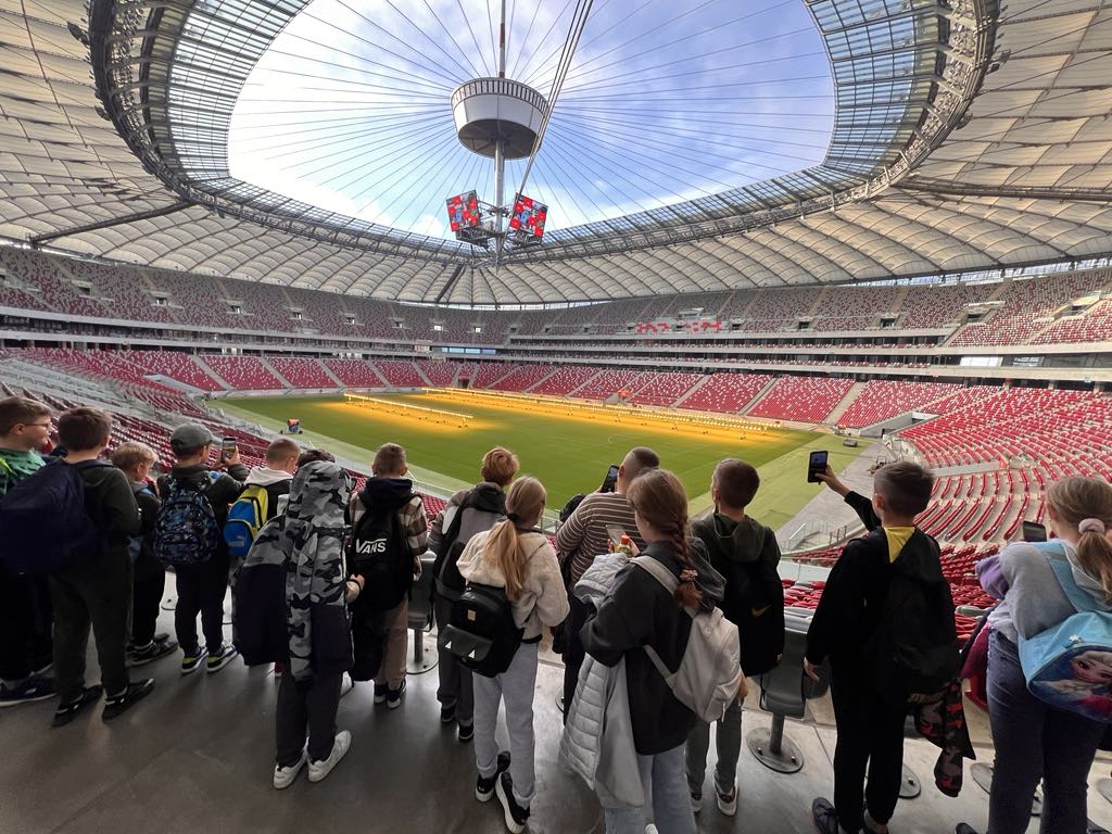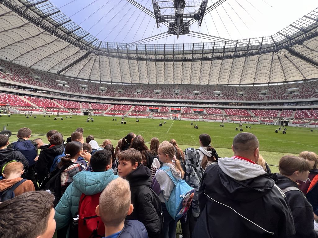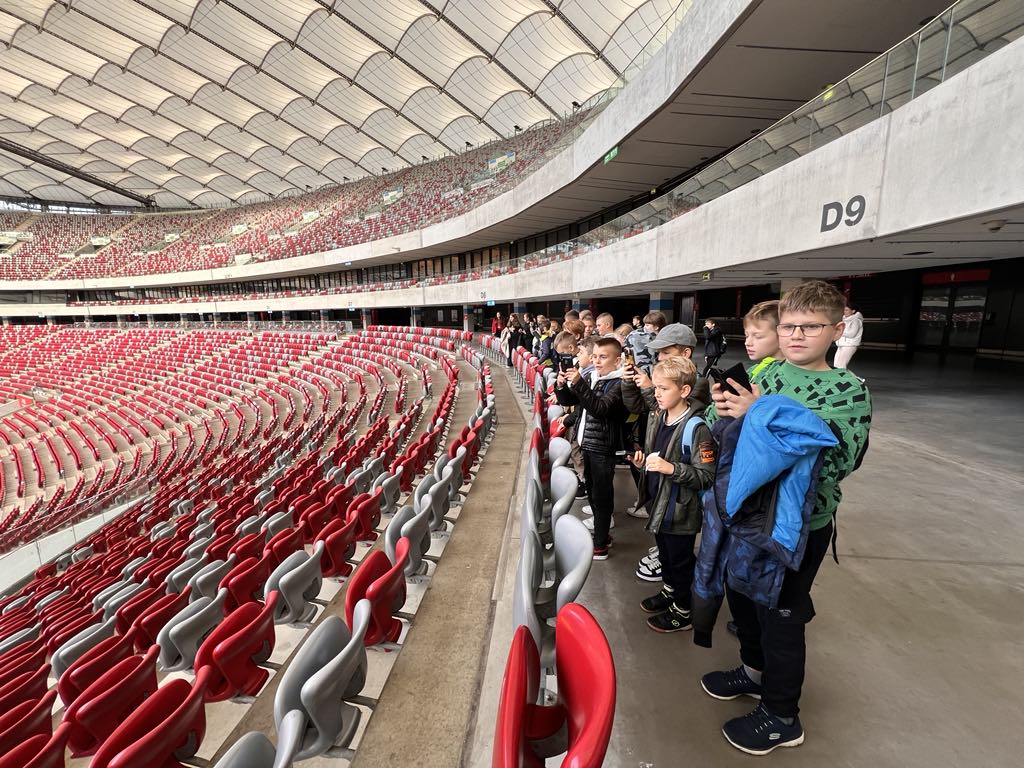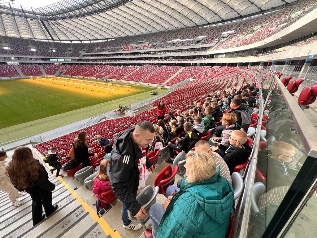 Pierwszym punktem programu był Stadion Narodowy, gdzie przewodnicy oprowadzili grupę po wnętrzu tej imponującej areny sportowej. Dzieci miały okazję zobaczyć miejsca na co dzień niedostępne, takie jak szatnie piłkarskie, loże VIP czy ławki rezerwowych. Zwiedzanie stadionu wzbudziło wiele emocji, zwłaszcza wśród młodych fanów piłki nożnej, którzy mogli poczuć się jak prawdziwi sportowcy.