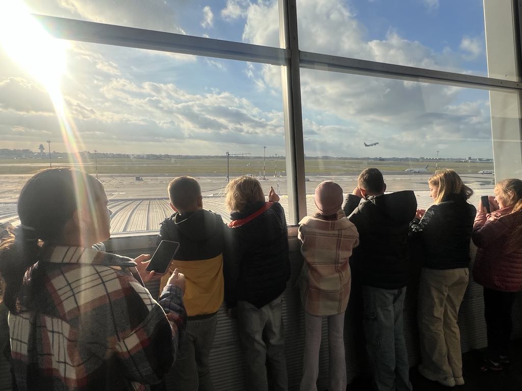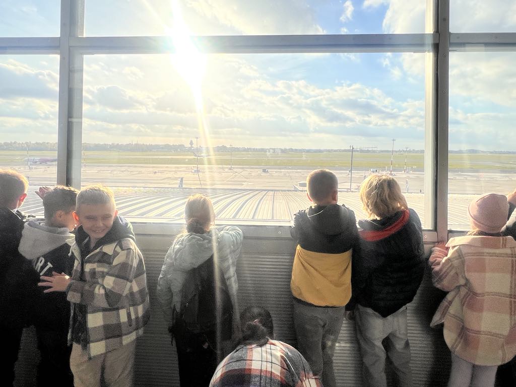 Ostatnim punktem wycieczki był taras widokowy na Lotnisku im. Fryderyka Chopina. Zobaczyliśmy tam starty i lądowania samolotów z bliska, a dla wielu z nas był to pierwszy kontakt z prawdziwym lotniskiem. Opiekunowie opowiedzieli uczniom o zasadach panujących na lotniskach i o tym, jak wygląda praca obsługi naziemnej.