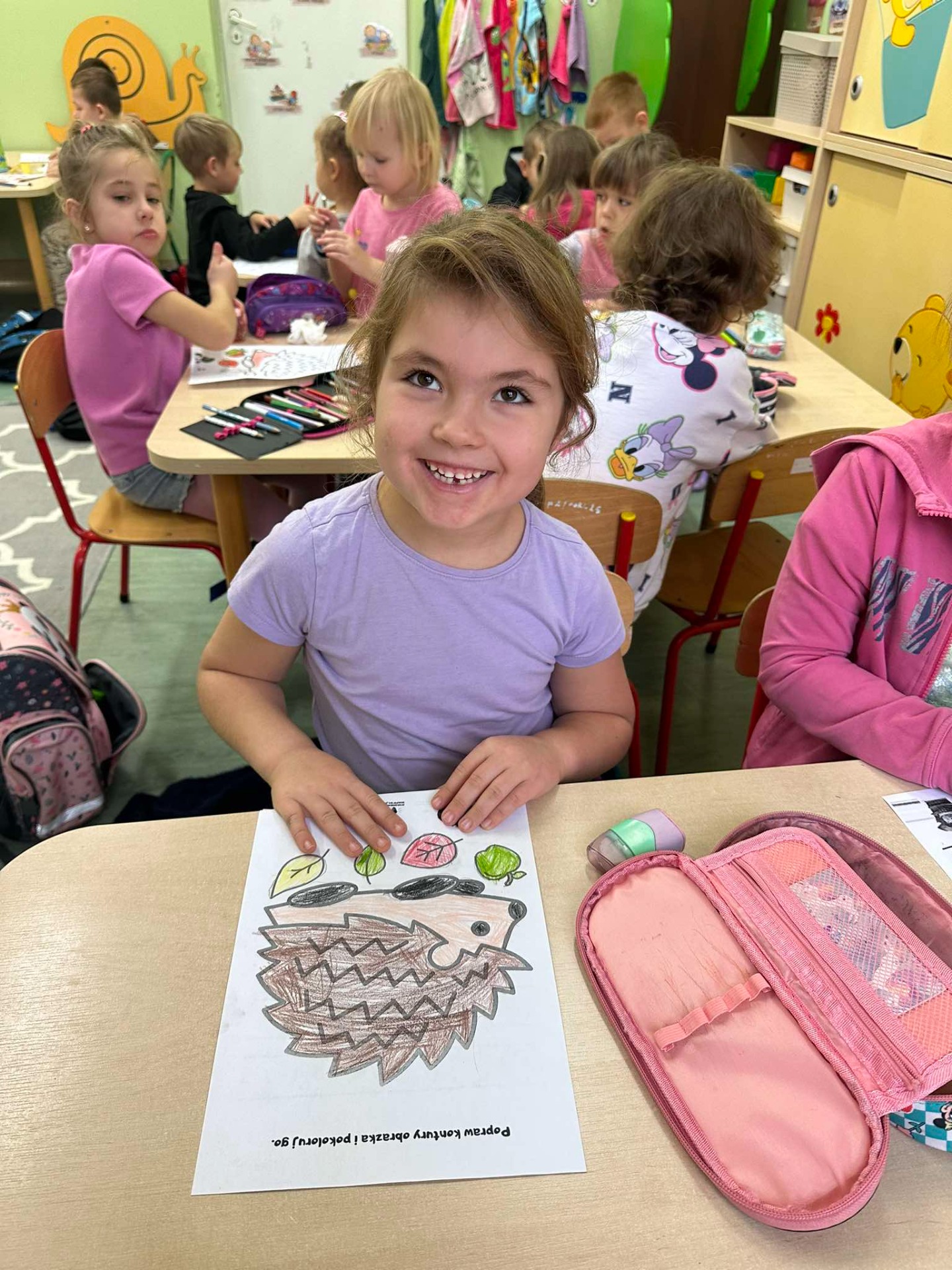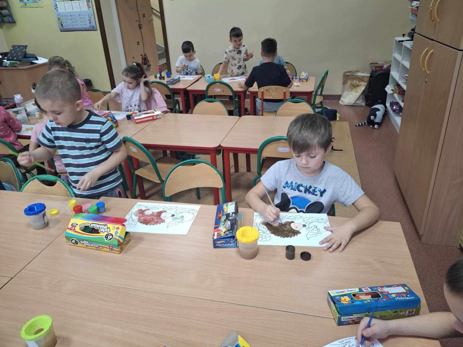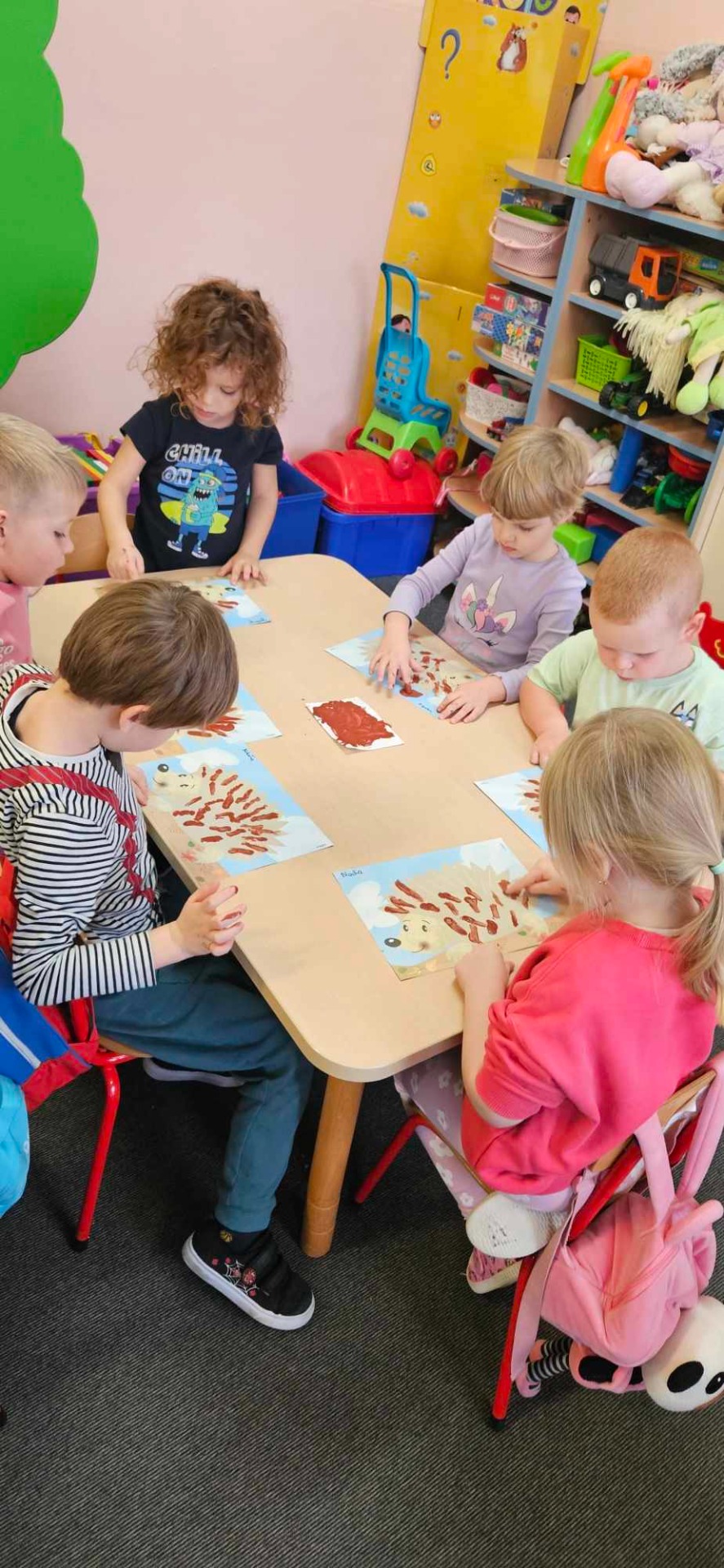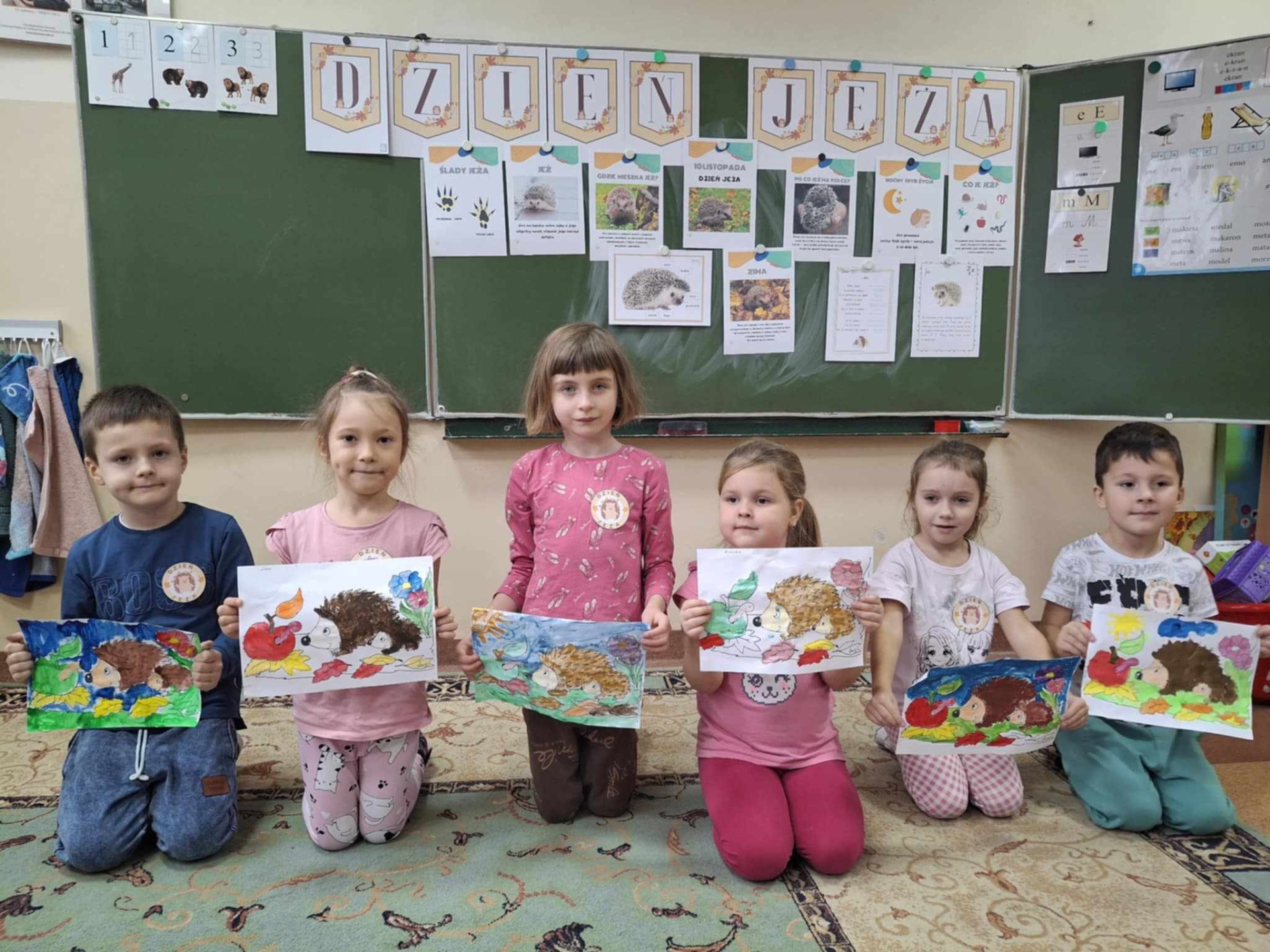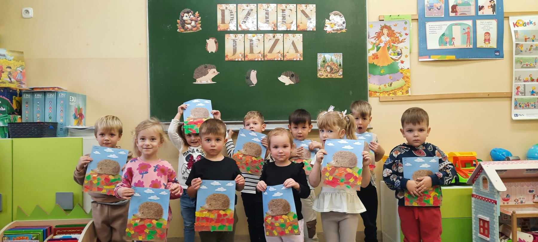 Tego dnia dzieci wysłuchały opowiadania o jeżach. Wzięły udział w pogadance na temat stylu życia jeży, budowie ich ciała oraz poznały ciekawostki z ich życia. Z radością wykonywały tematyczne prace plastyczne oraz doskonaliły umiejętność przeliczania. Świetnie bawiły się podczas zabaw muzyczno-ruchowych.