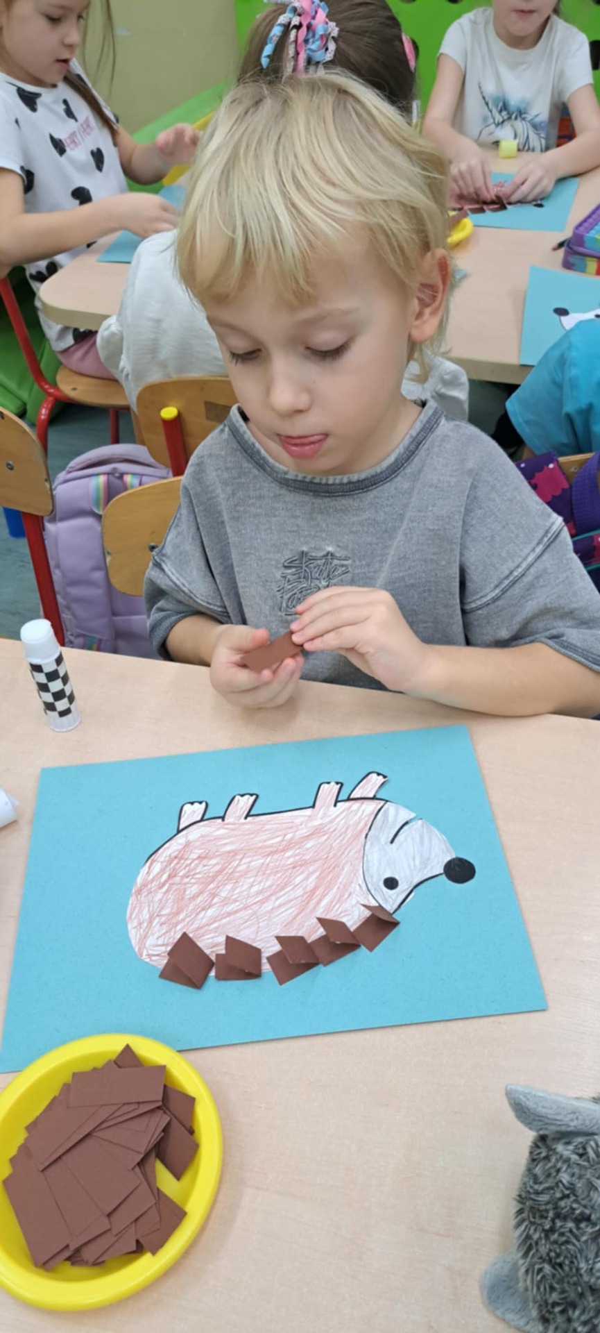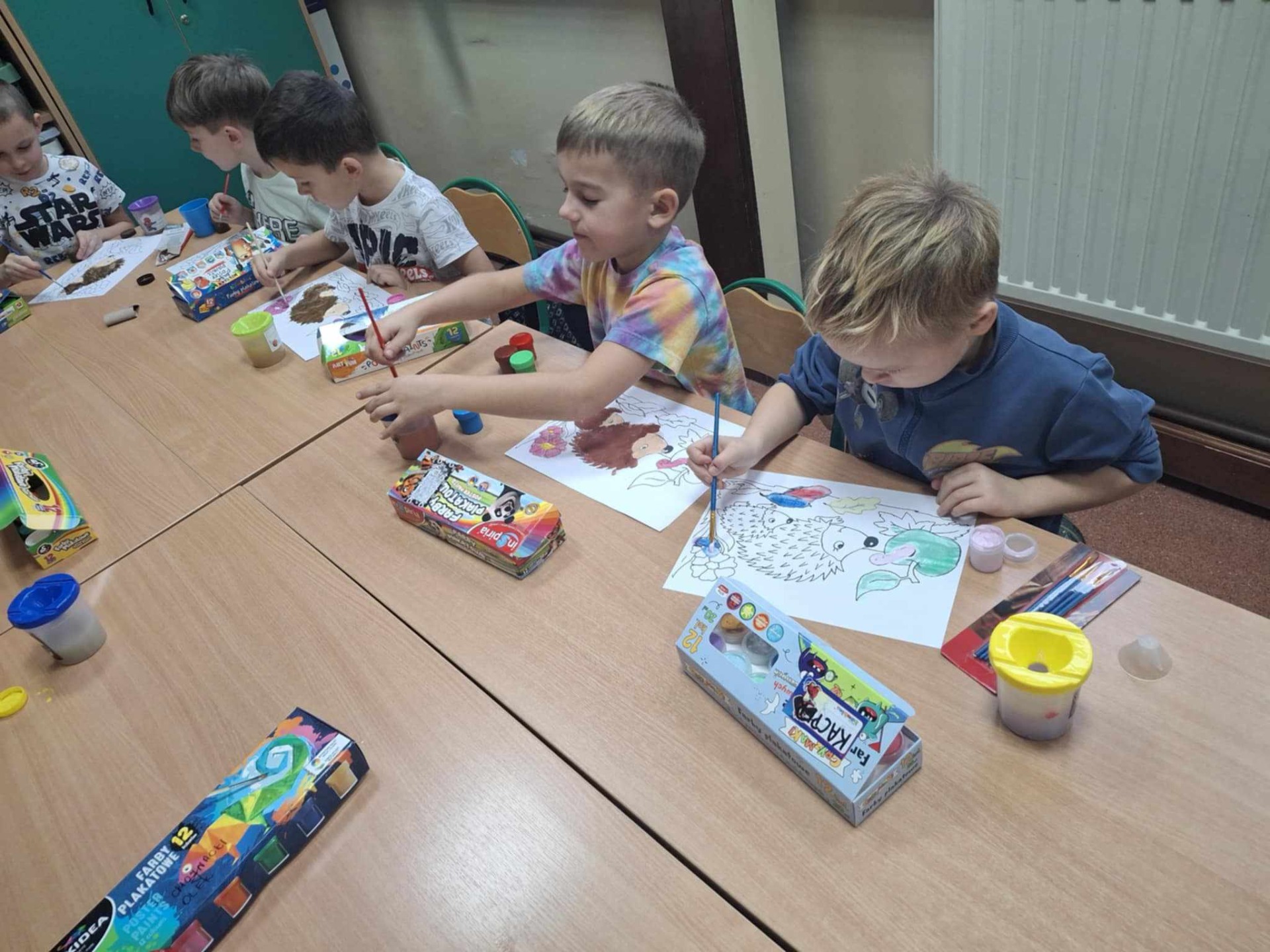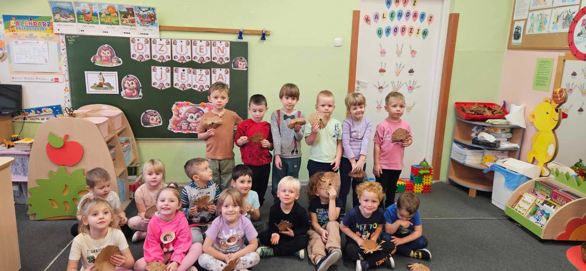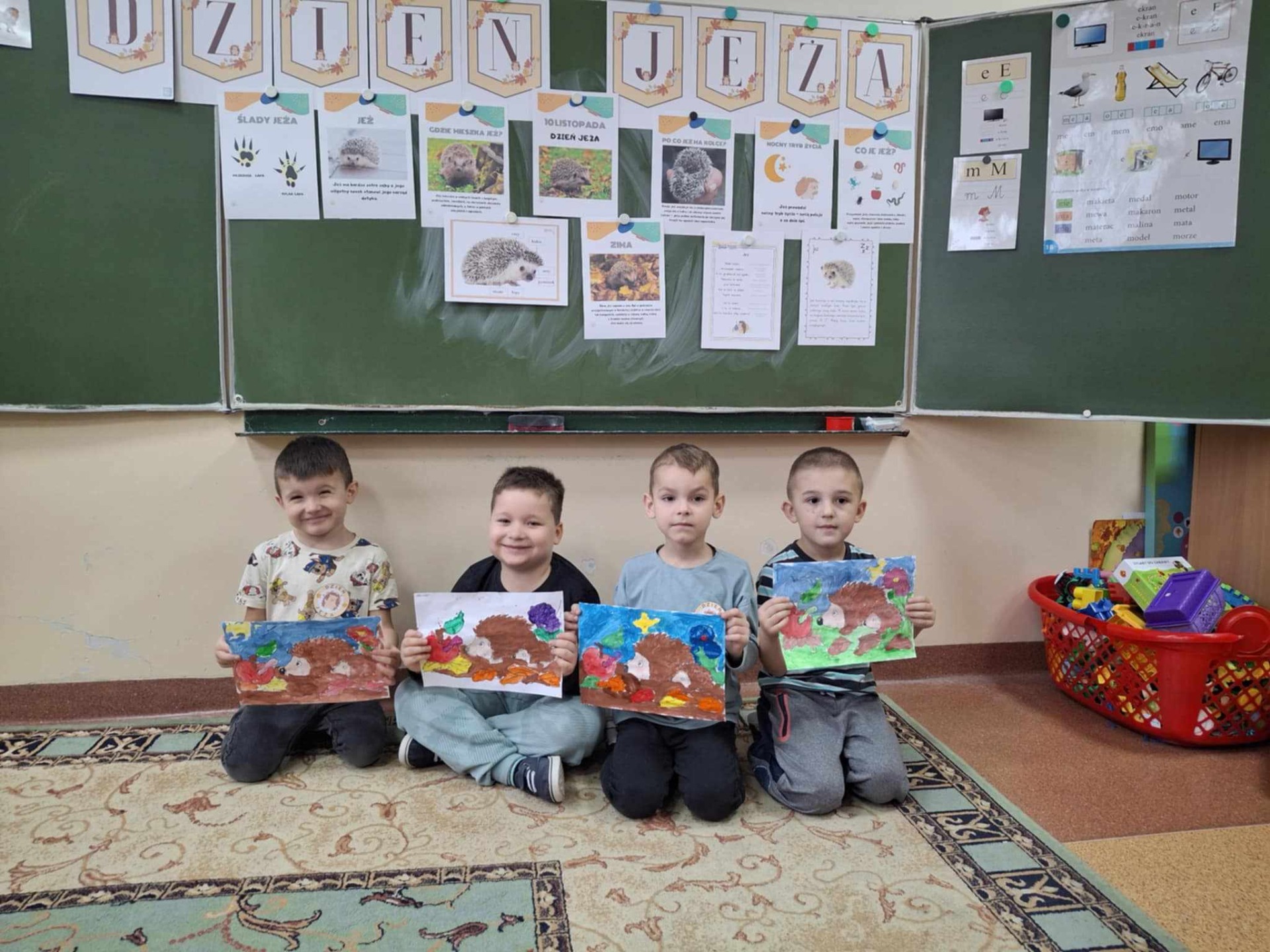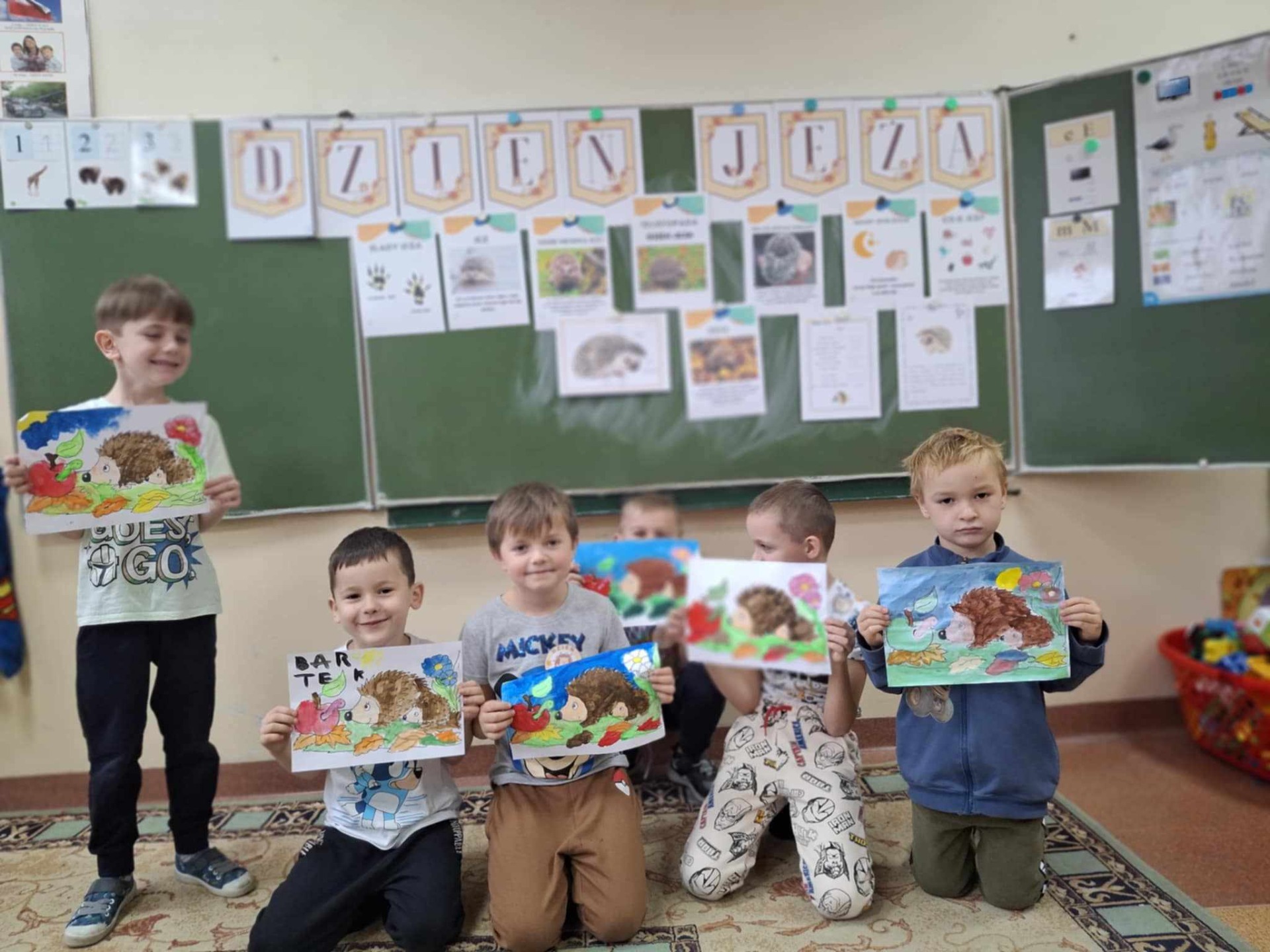 Tego dnia dzieci wysłuchały opowiadania o jeżach. Wzięły udział w pogadance na temat stylu życia jeży, budowie ich ciała oraz poznały ciekawostki z ich życia. Z radością wykonywały tematyczne prace plastyczne oraz doskonaliły umiejętność przeliczania. Świetnie bawiły się podczas zabaw muzyczno-ruchowych.