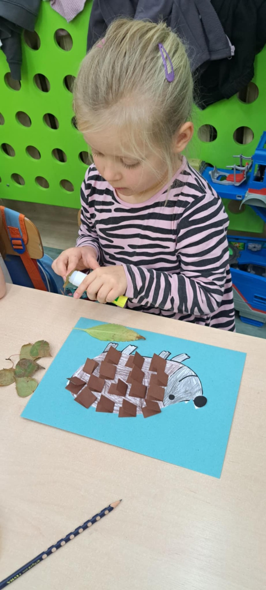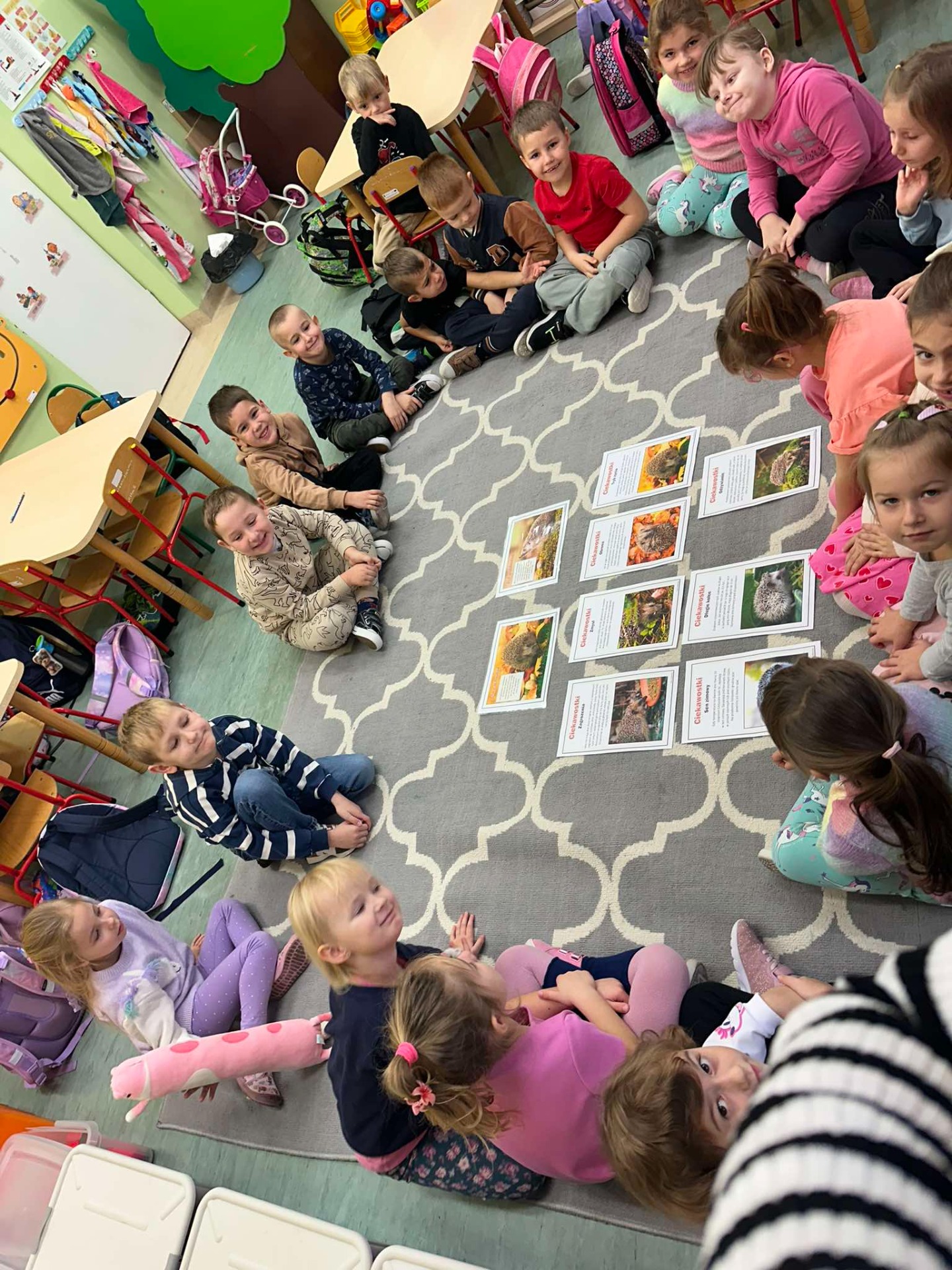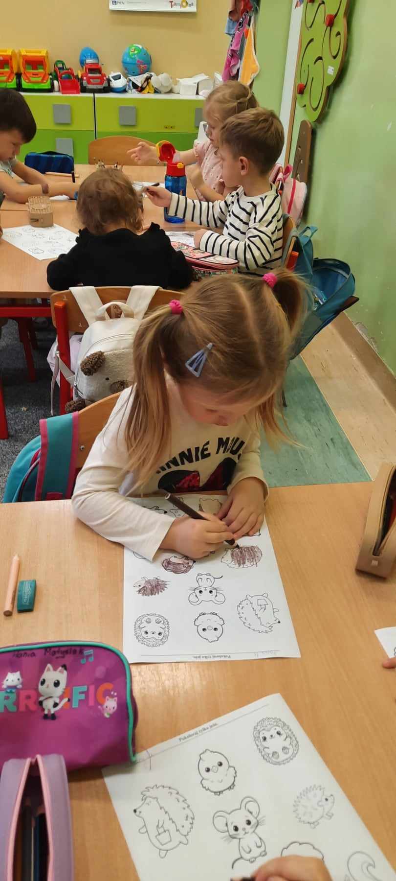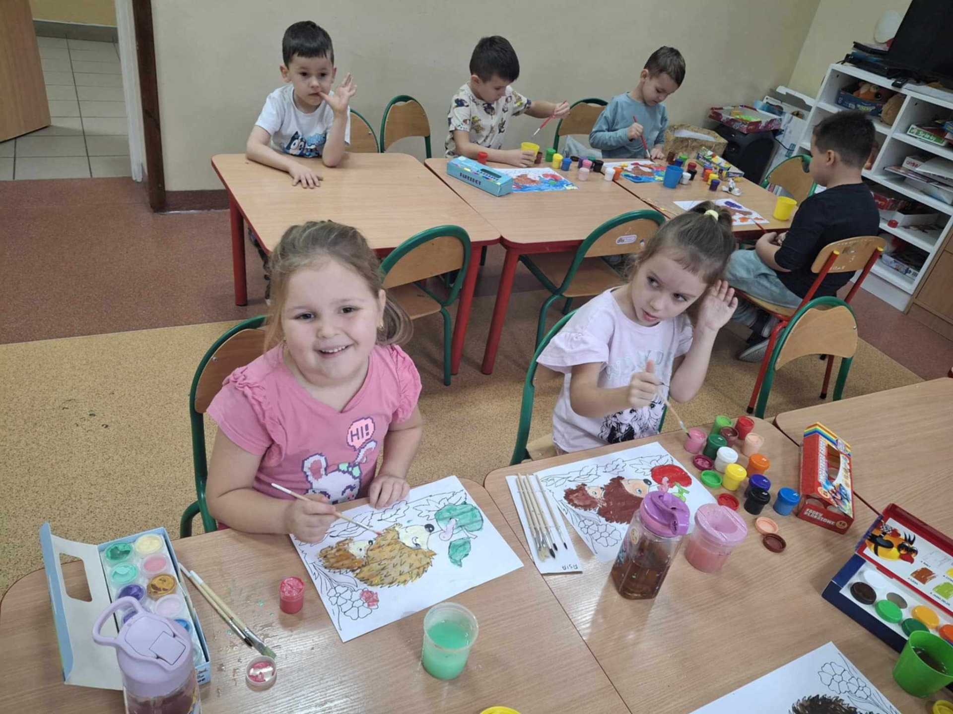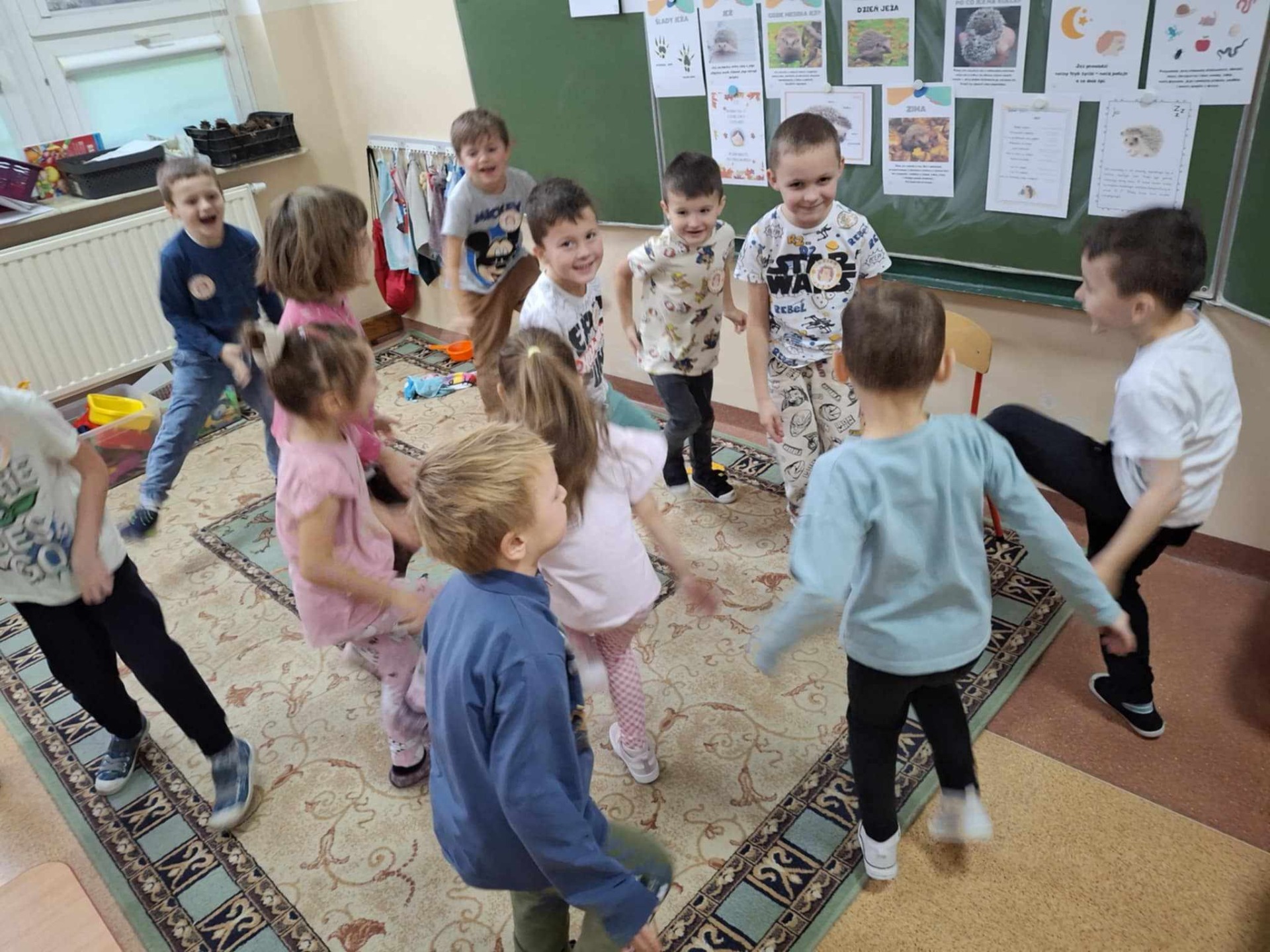 Tego dnia dzieci wysłuchały opowiadania o jeżach. Wzięły udział w pogadance na temat stylu życia jeży, budowie ich ciała oraz poznały ciekawostki z ich życia. Z radością wykonywały tematyczne prace plastyczne oraz doskonaliły umiejętność przeliczania. Świetnie bawiły się podczas zabaw muzyczno-ruchowych.