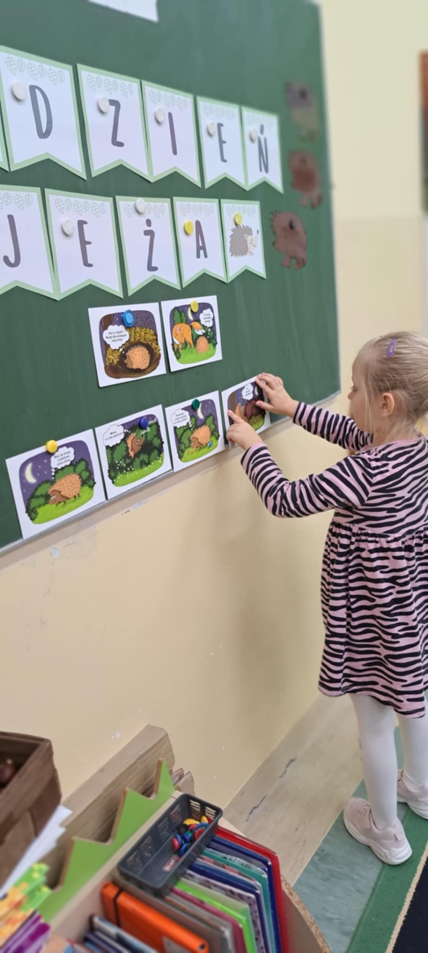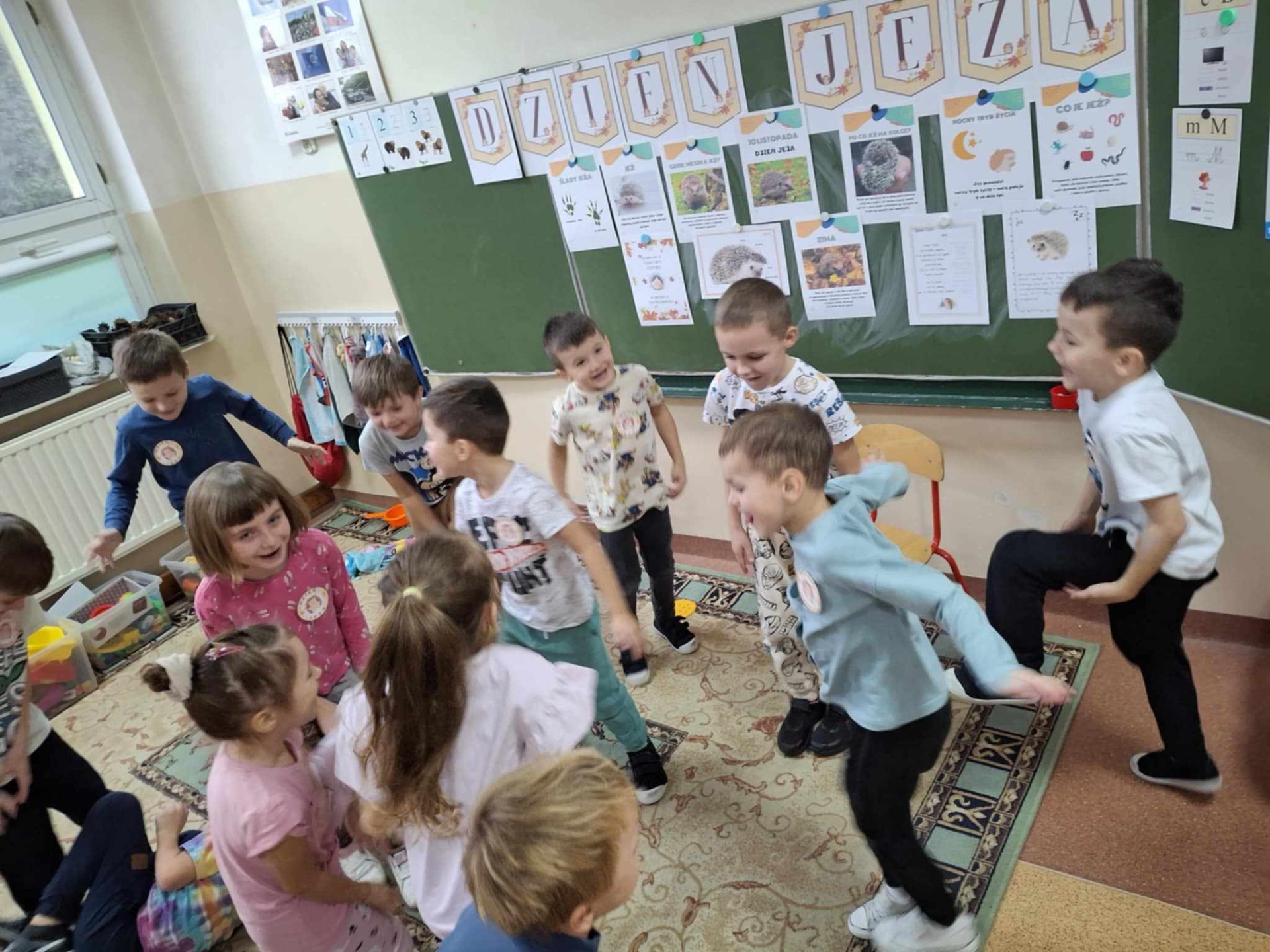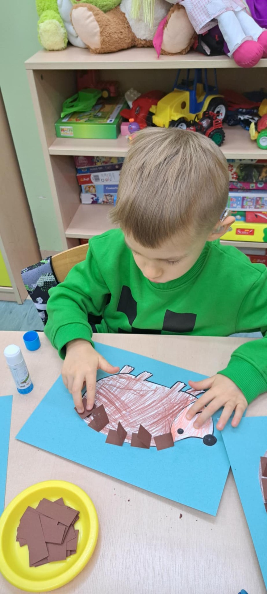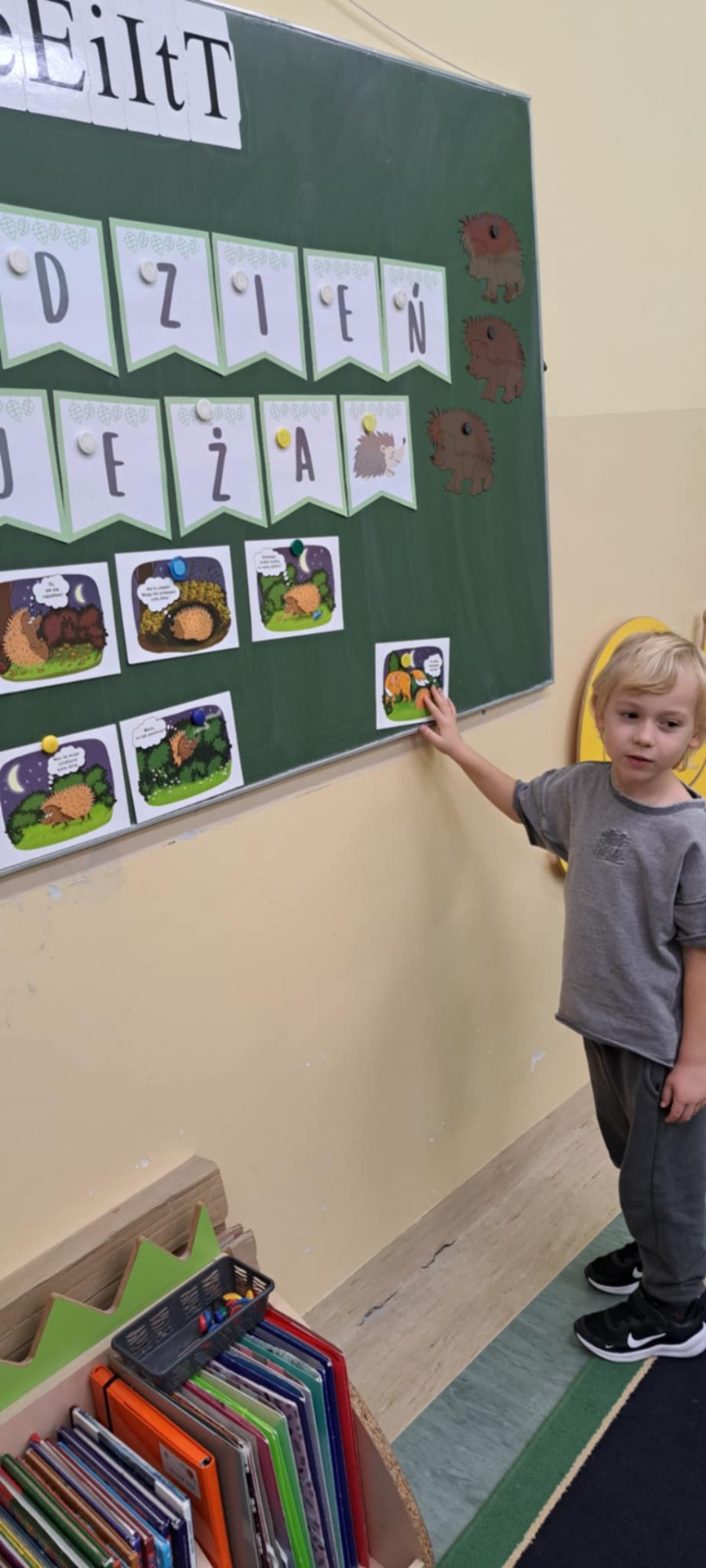 Tego dnia dzieci wysłuchały opowiadania o jeżach. Wzięły udział w pogadance na temat stylu życia jeży, budowie ich ciała oraz poznały ciekawostki z ich życia. Z radością wykonywały tematyczne prace plastyczne oraz doskonaliły umiejętność przeliczania. Świetnie bawiły się podczas zabaw muzyczno-ruchowych.
