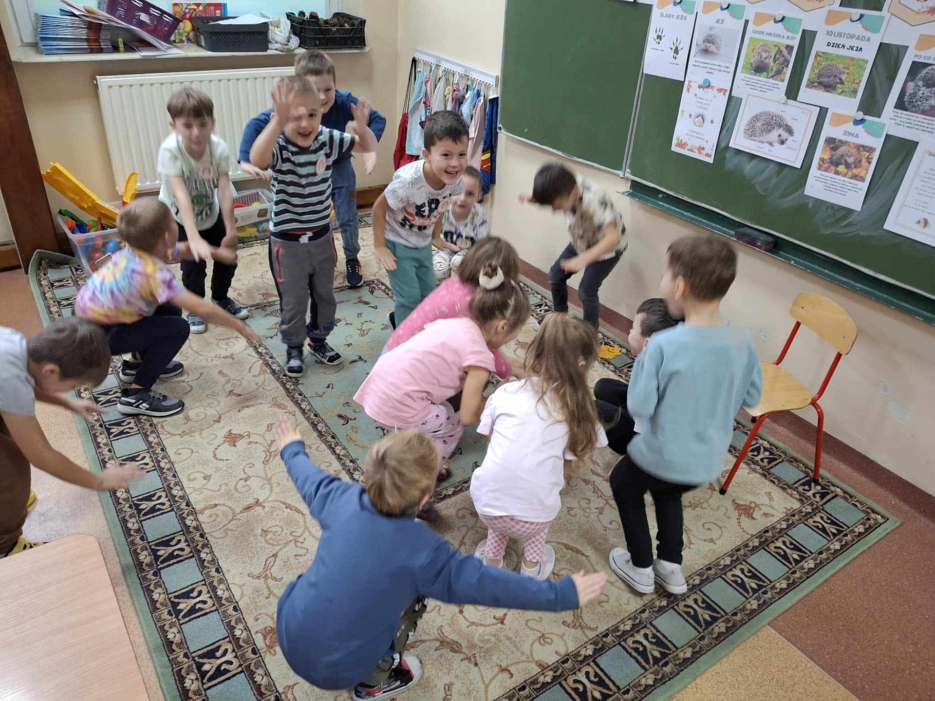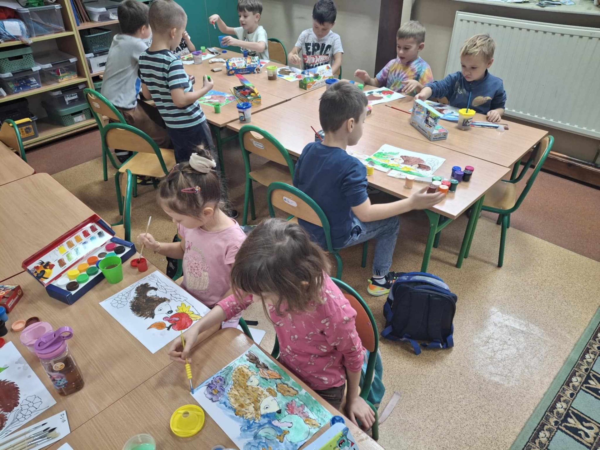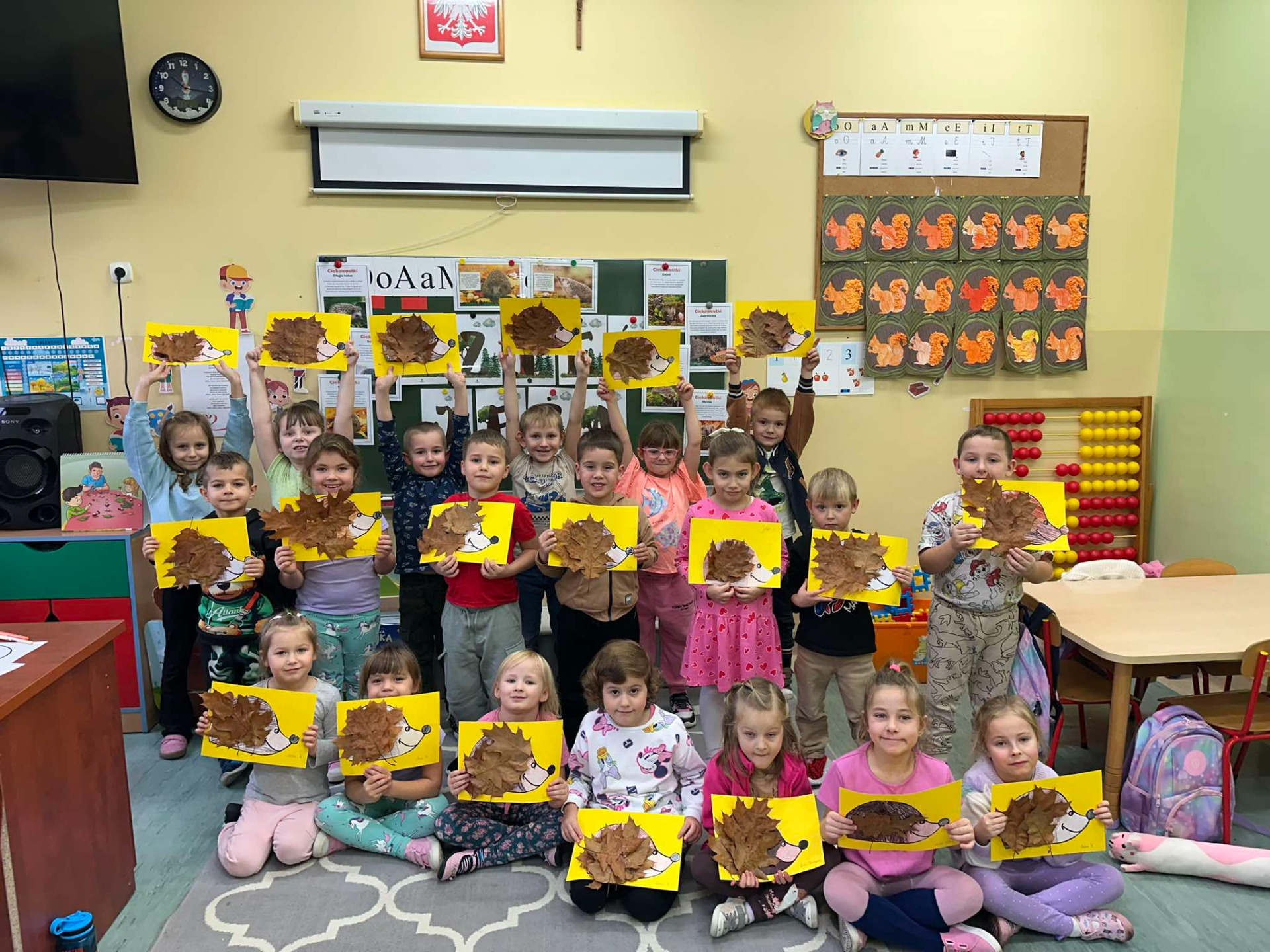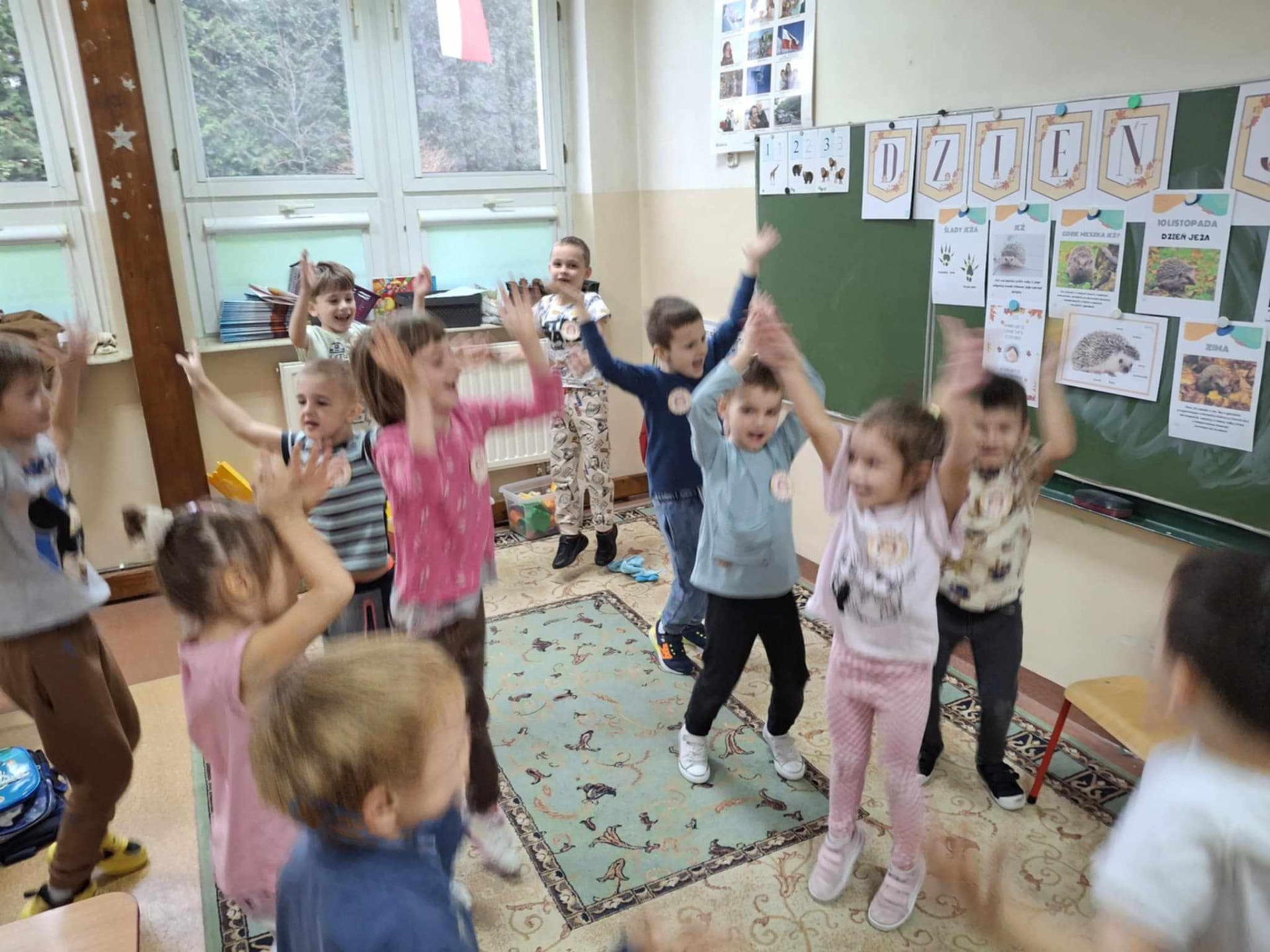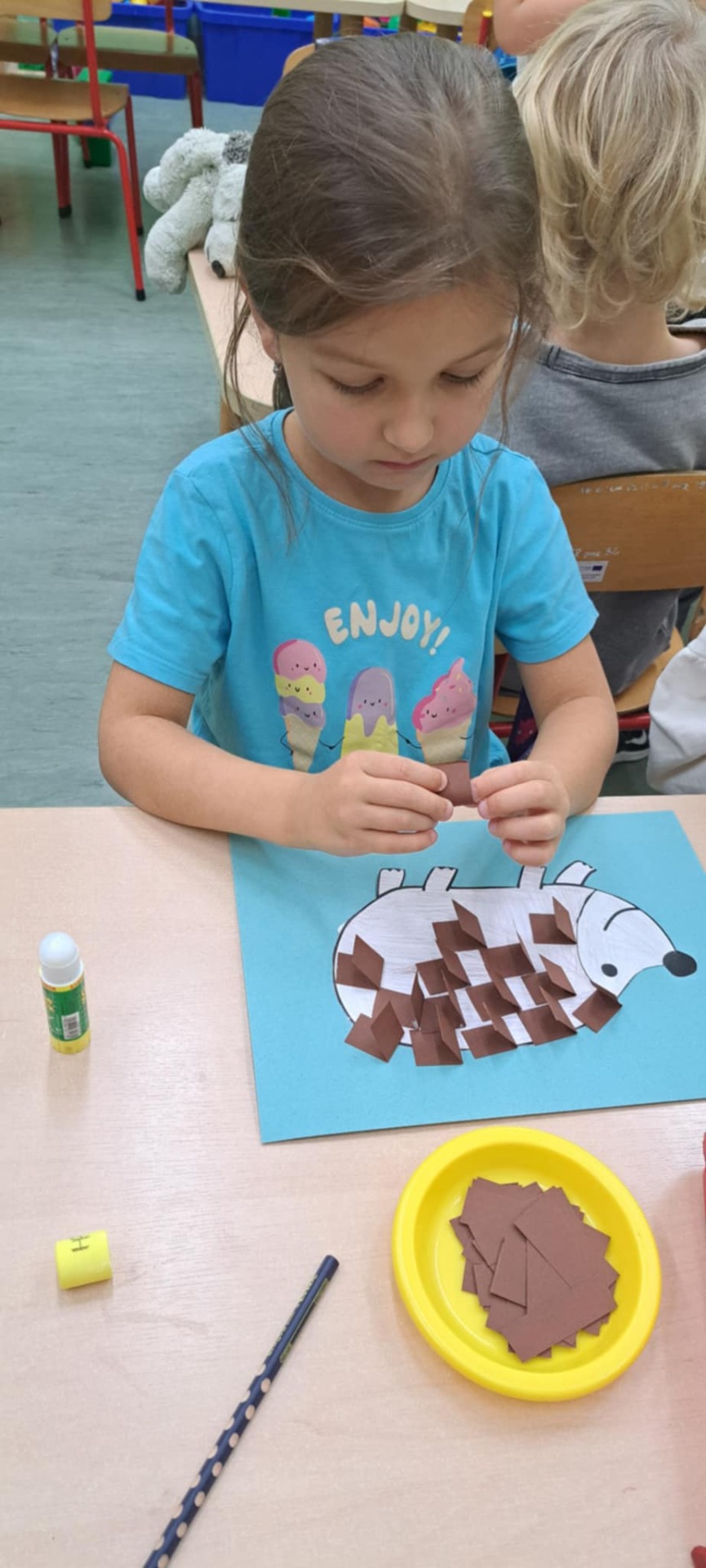 Tego dnia dzieci wysłuchały opowiadania o jeżach. Wzięły udział w pogadance na temat stylu życia jeży, budowie ich ciała oraz poznały ciekawostki z ich życia. Z radością wykonywały tematyczne prace plastyczne oraz doskonaliły umiejętność przeliczania. Świetnie bawiły się podczas zabaw muzyczno-ruchowych.