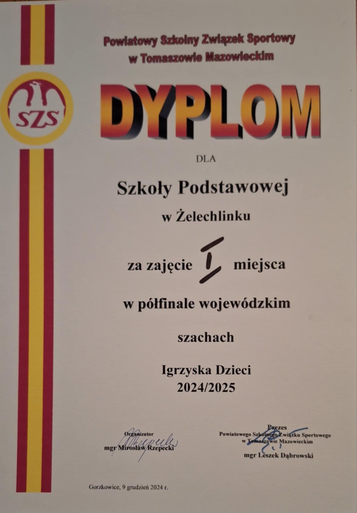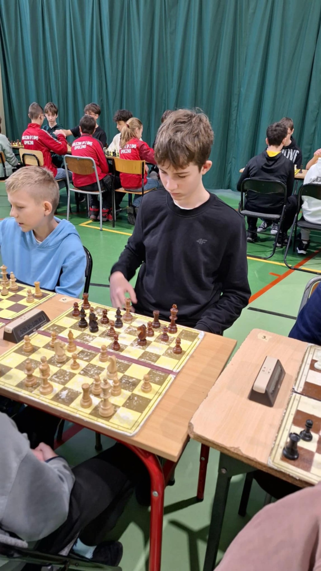 Bieżący tydzień rozpoczynamy od budujących wiadomości . W Publicznej Szkole Podstawowej w Gorzkowicach 09.12.2024 r. nasi szachiści uczestniczyli w Półfinale Mistrzostw Województwa Łódzkiego w Szachach Drużynowych Szkół Podstawowych w ramach Igrzysk Dzieci. W turnieju wzięło udział siedem szkół. Rozgrywki przebiegały w atmosferze sympatycznego, koleżeńskiego współzawodnictwa, a magia CAISSY unosiła się w sali turniejowej. W kuluarach można było usłyszeć myśl gloryfikującą tę wspaniałą MUZĘ, "kocham ślady TWYCH przemyśleń, kocham wszystkie te warianty, których TYŚ nie tknęła, kocham myśl, tę pierwszą, od której szachowa się wzięła." I CAISSA dzisiaj nie opuściła nas! Nasi bohaterowie, w kolejności szachownic to: JAKUB KWIATKOWSKI 6/6 punktów, WOJCIECH MICHNIEWSKI 3.5/6 punktów, MICHAŁ MATYSIAK 6/6 punktów, ANTONINA KOTYNIA 4.5/ 6 punktów. Nasz zespół wygrał wszystkie swoje mecze, dając tym samym potwierdzenie, że ciężka praca i determinacja są gwarantem wszelkich sukcesów. Dziękujemy wszystkim zawodnikom, a w szczególności TOSI KOTYNI, która rozegrała swój <turniej życia>. A jej promienna aura udzielała się całej drużynie. GRATULUJEMY!!!