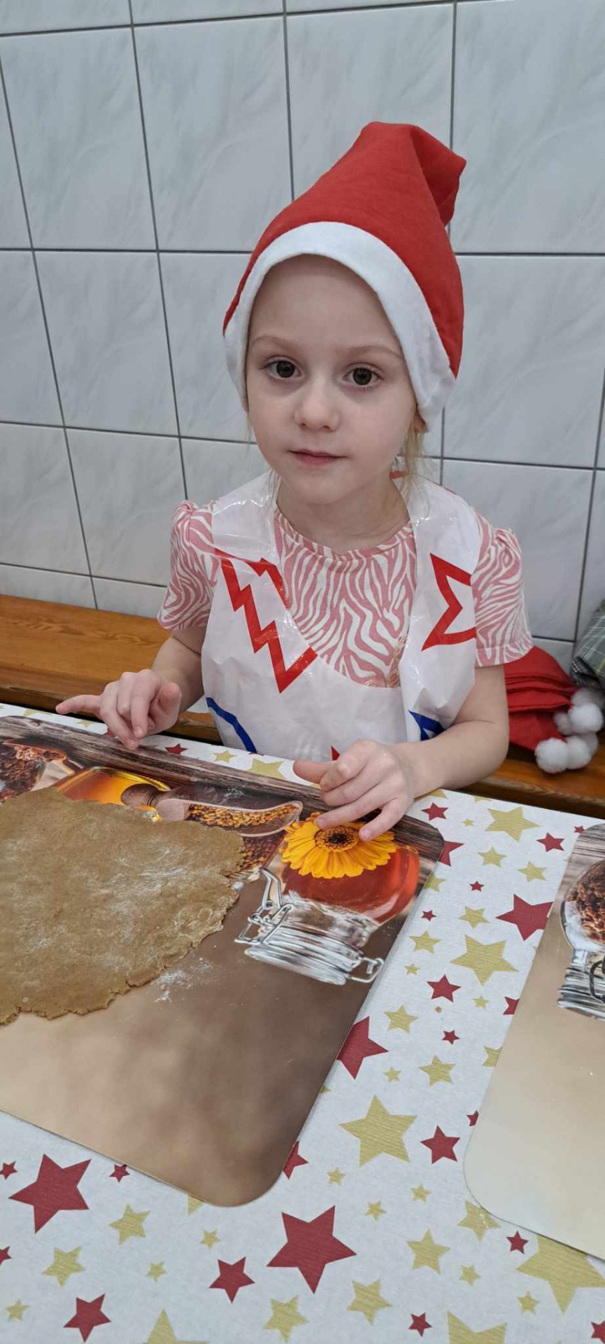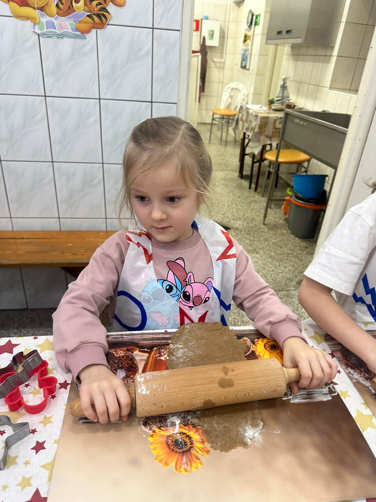 Dzieci miały okazję poznać składniki niezbędne do przygotowania ciasta, sposób jego wykonania, potrzebne przybory kuchenne oraz spróbować gotowych pierników.