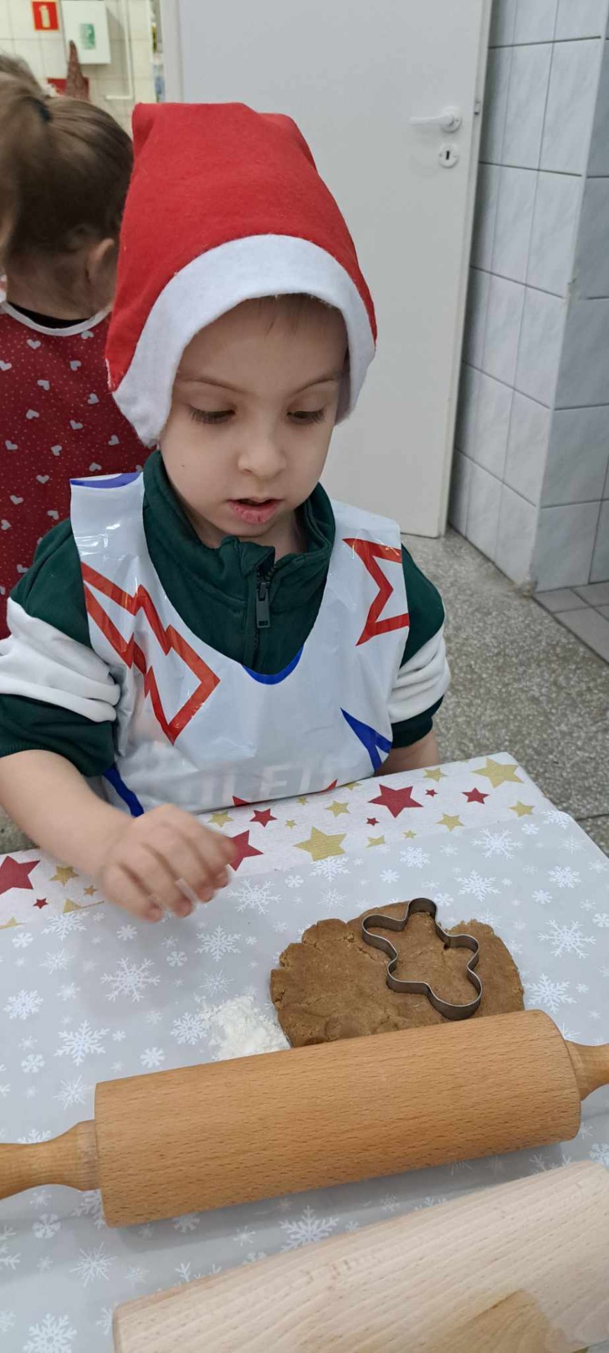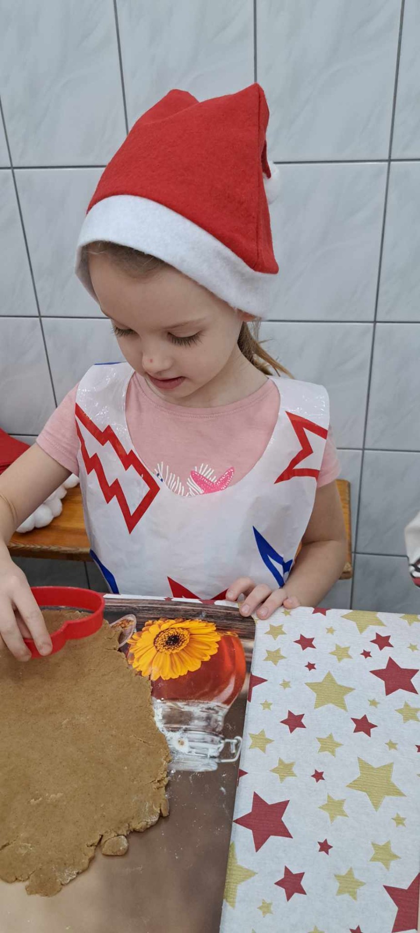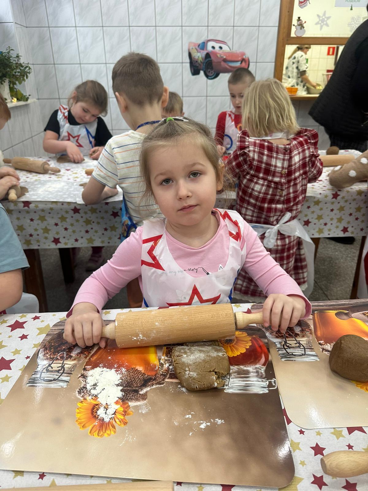 Kiedy wszystko było już gotowe przedszkolaki z dużym zapałem przystąpiły do pracy – ugniatały ciasto, wałkowały je oraz wykrawały ciasteczka w najróżniejszych kształtach.