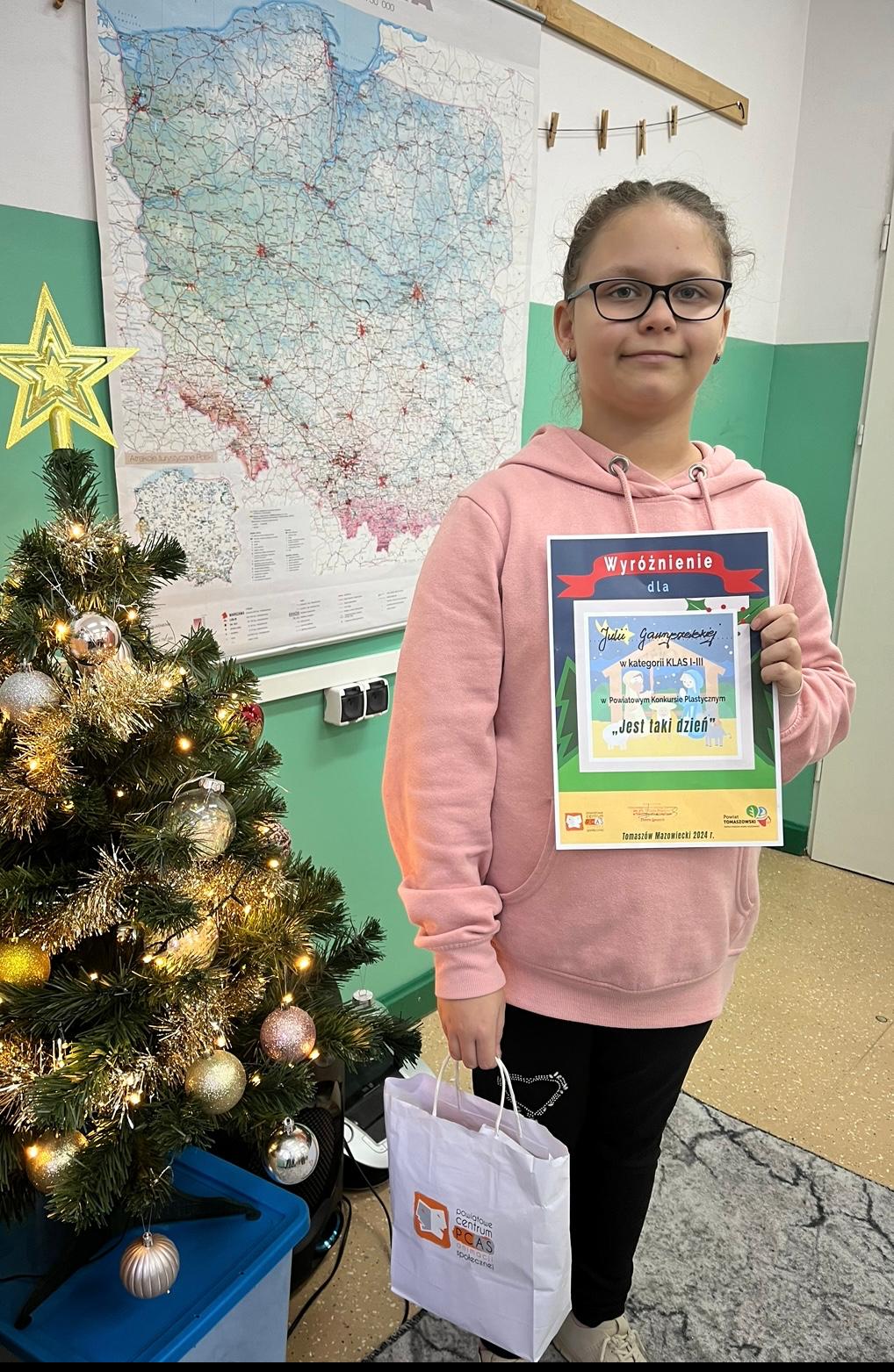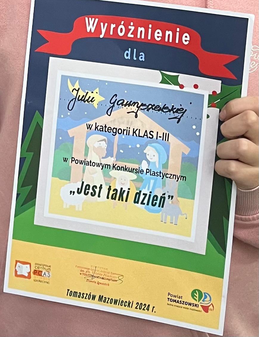 Nasi uczniowie po raz kolejny wzięli udział w Powiatowy Konkursie Plastycznym pt. „Jest taki dzień” organizowanym przez Centrum Animacji Społecznej w Tomaszowie Mazowieckim. Do komisji konkursowej wpłynęło ponad 450 prac, w tym aż 45 z naszej szkoły. Wszystkie kartki były przepiękne, a jury miało twardy orzech do zgryzienia. Jedna z wyróżnionych na etapie powiatowym prac należy do uczennicy naszej szkoły Julii Gawryszewskiej z klasy II b.