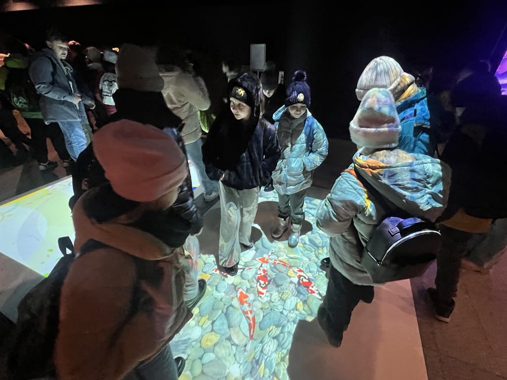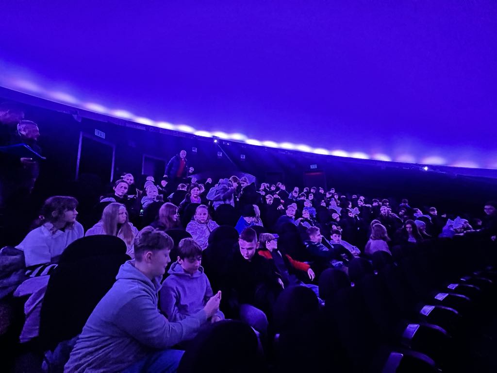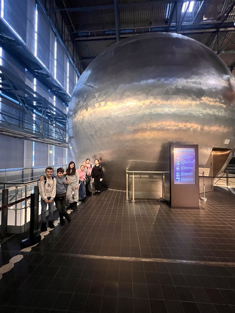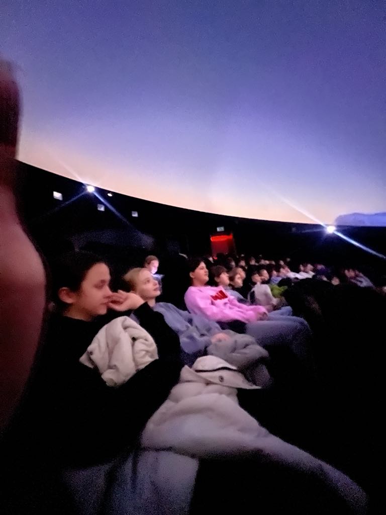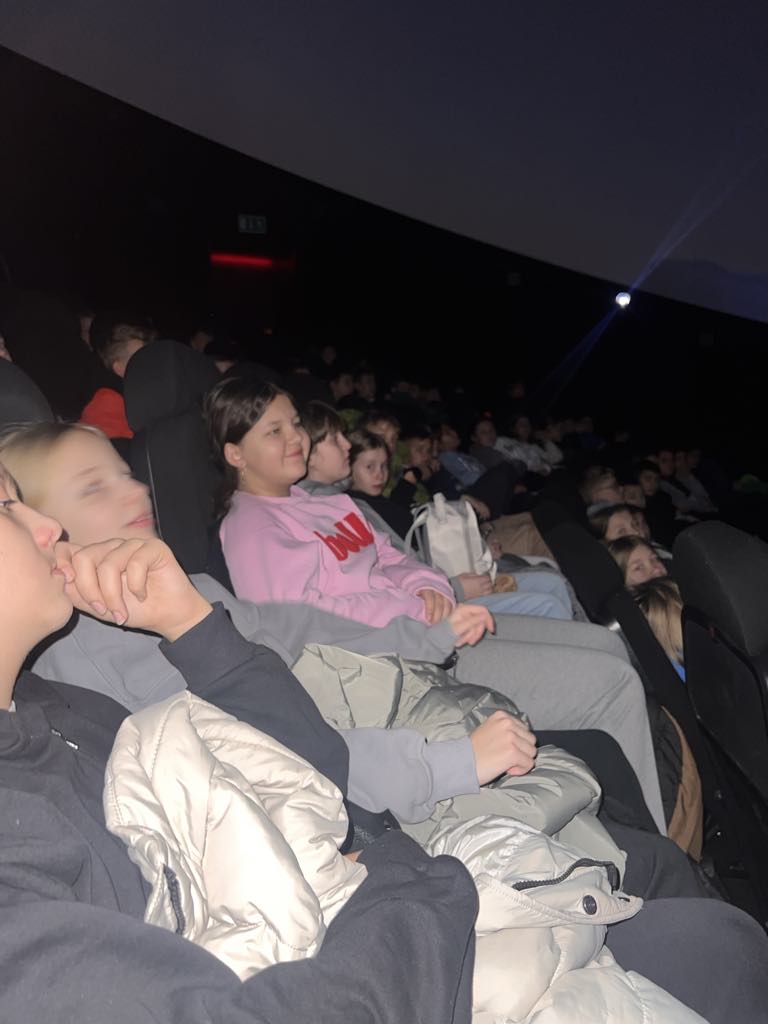 Pierwszym punktem naszej wycieczki było Planetarium. W trakcie pokazu omówione były gwiazdozbiory widoczne zimą po zachodzie Słońca: Orion, Byk, Wielki i Mały Pies, Bliźnięta. Oprócz obiektów widocznych gołym okiem pokazane były mgławice, gromady gwiazd, galaktyki.