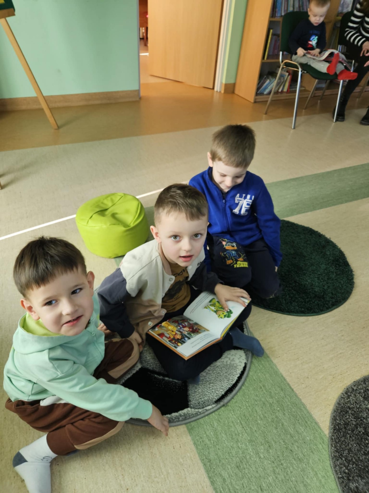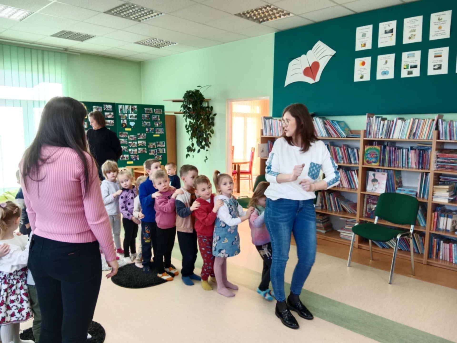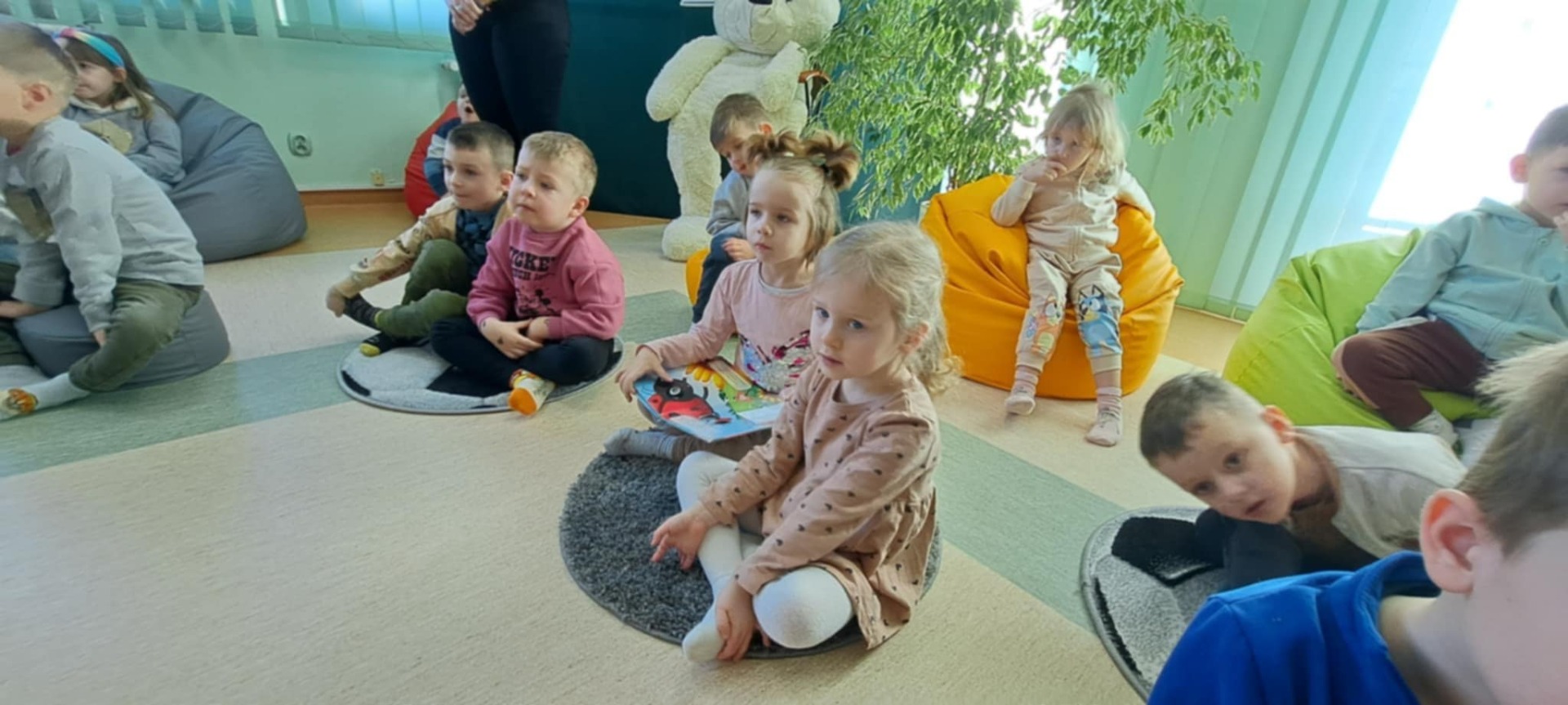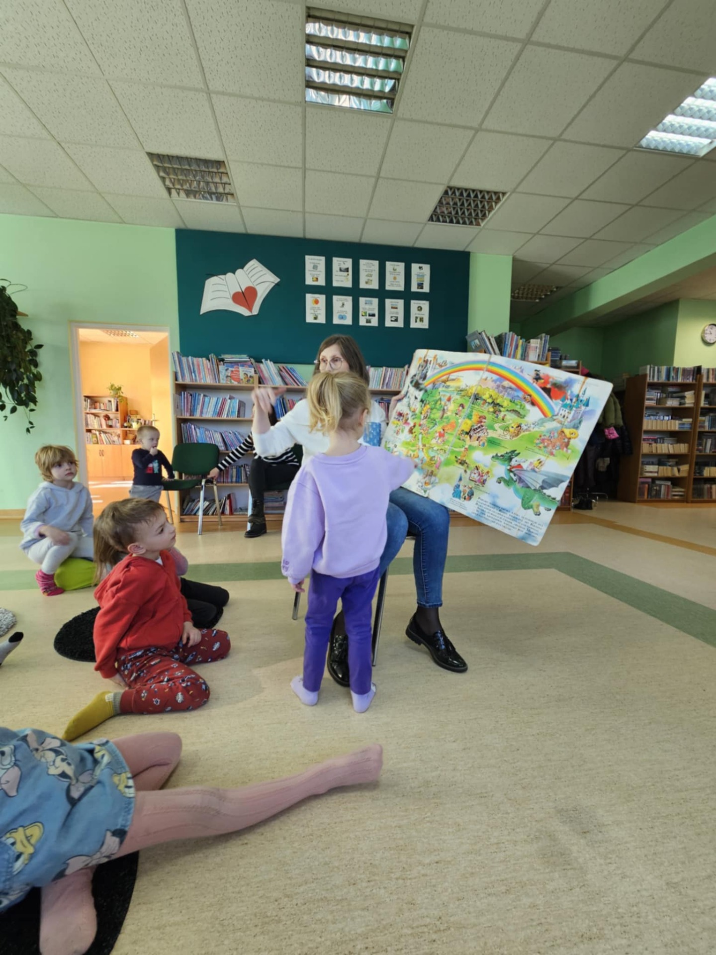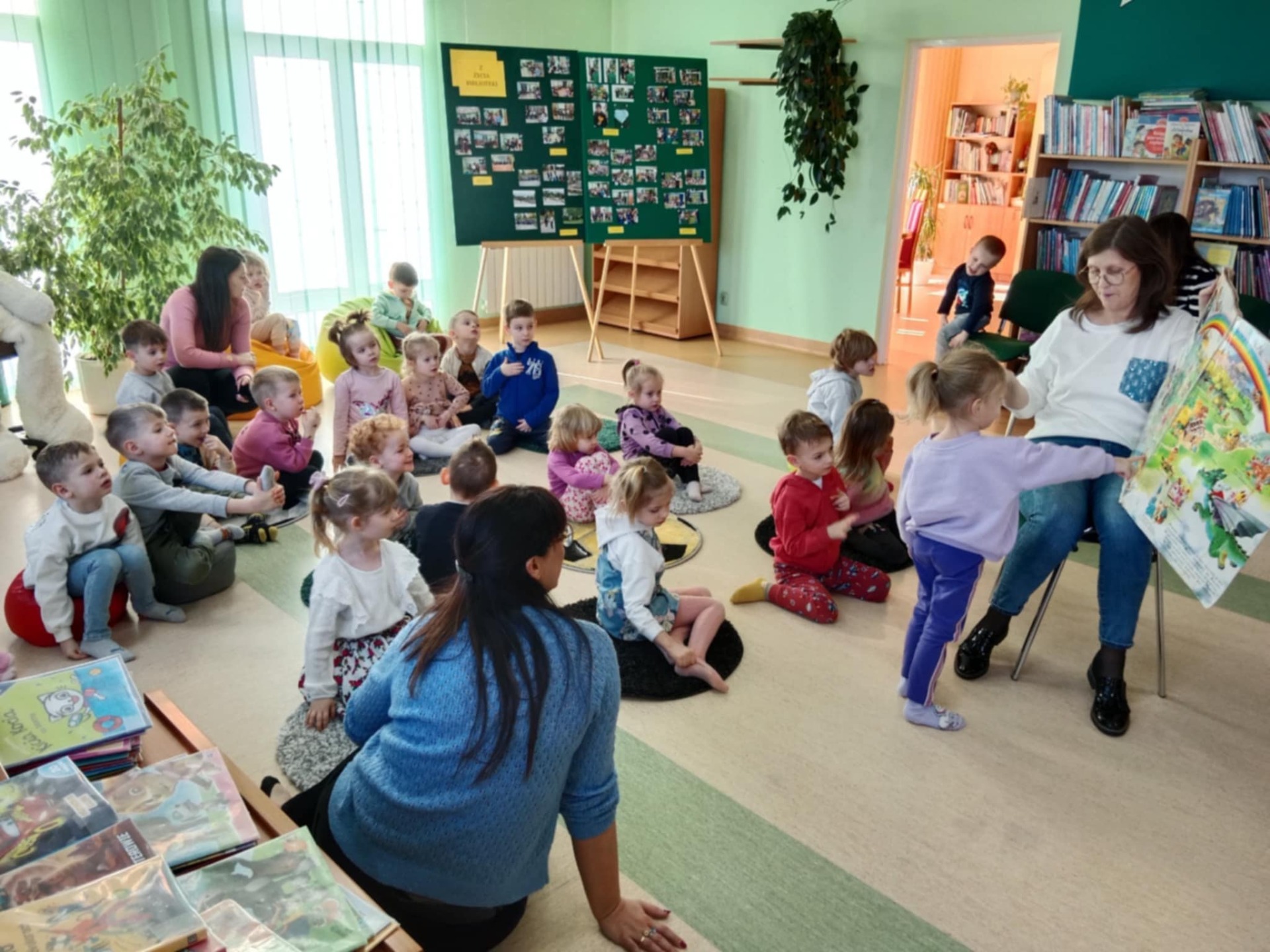 Przedszkolaki z dużym zainteresowaniem wysłuchały też bajki czytanej przez panią dyrektor, a następnie wzięły udział w wesołych zabawach i zagadkach związanych z książkami oraz ich bohaterami. Dzieci z radością przeglądały kolorowe książeczki, poznając świat literatury w przyjaznej atmosferze.
